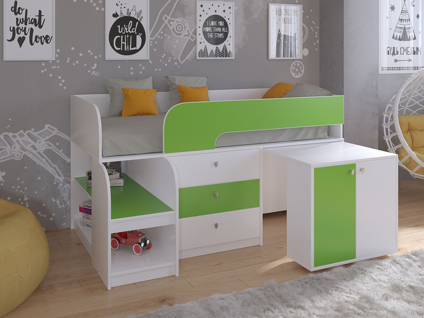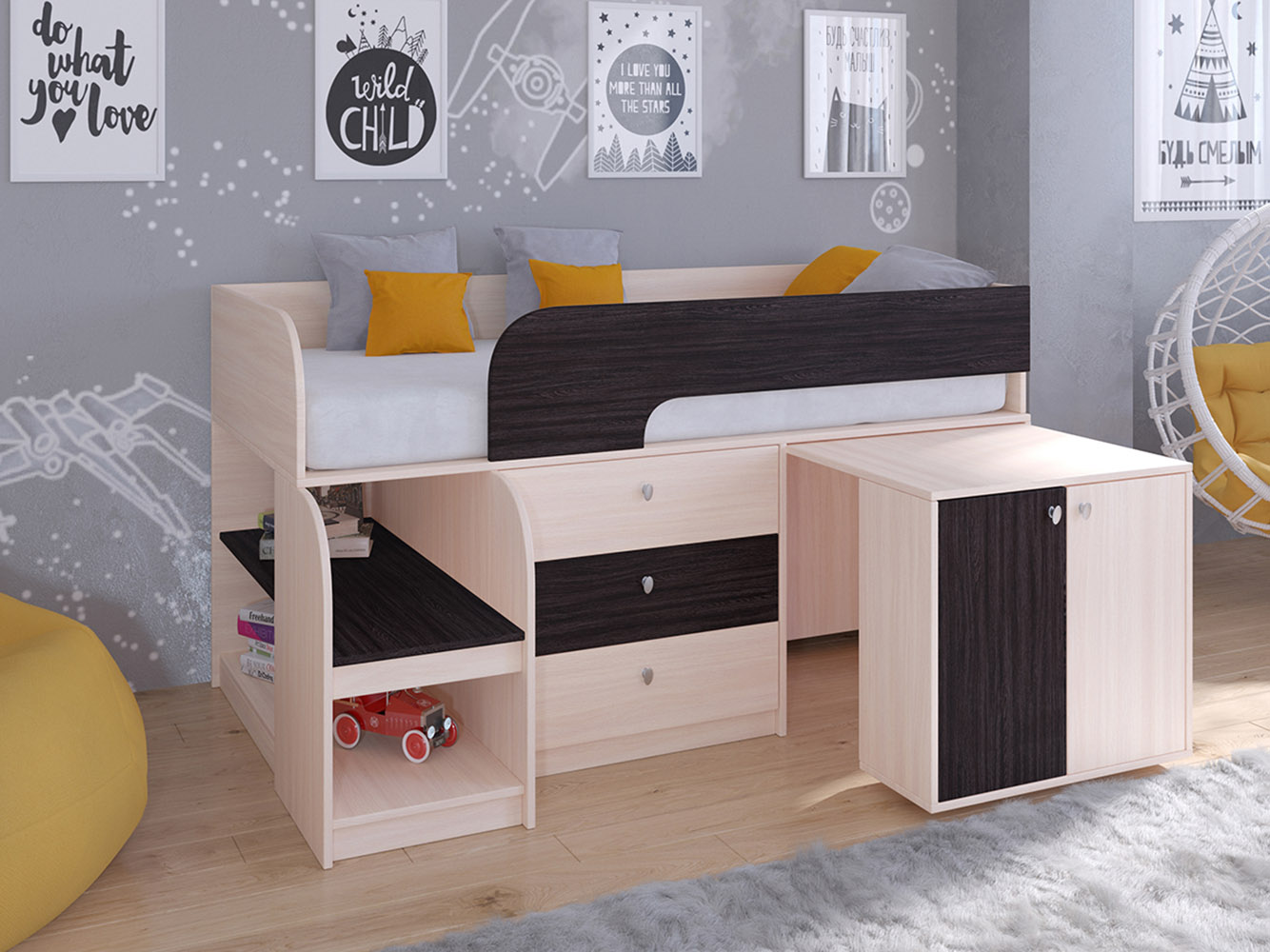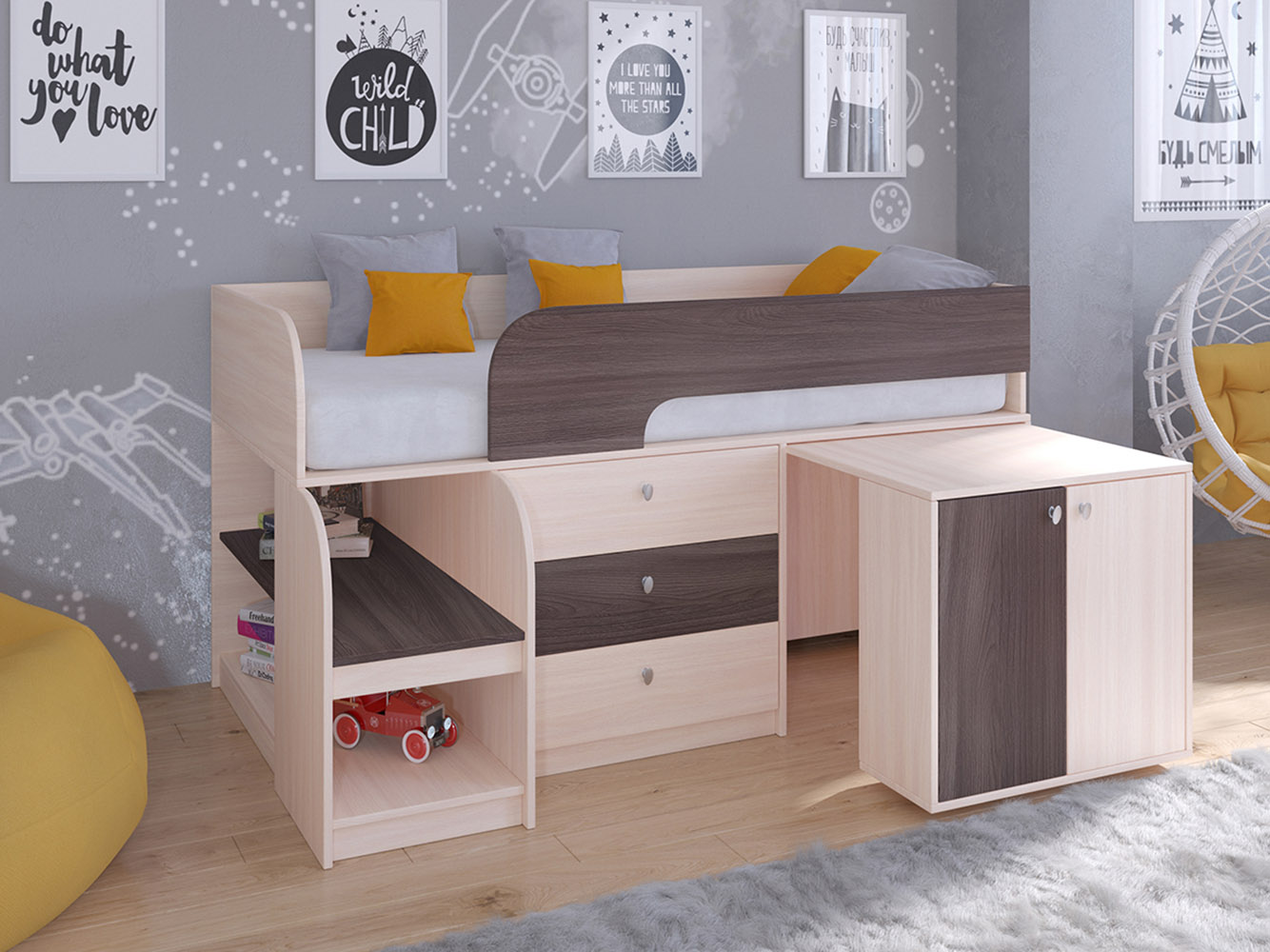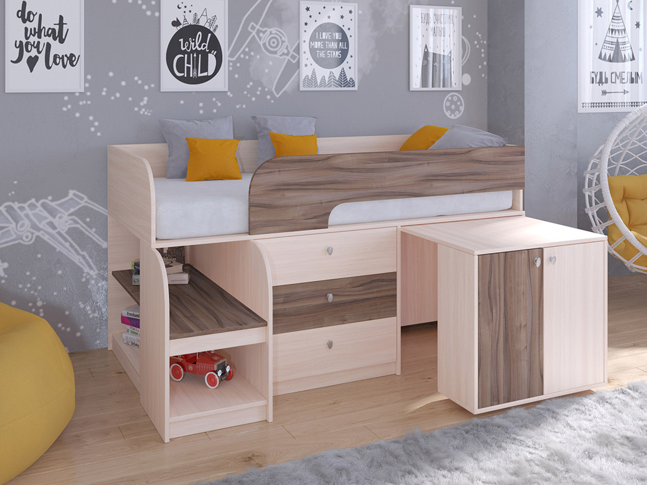 Выдвижной столик-тумба обеспечит удобное рабочее место для игр, учебы или творчества.