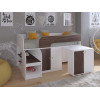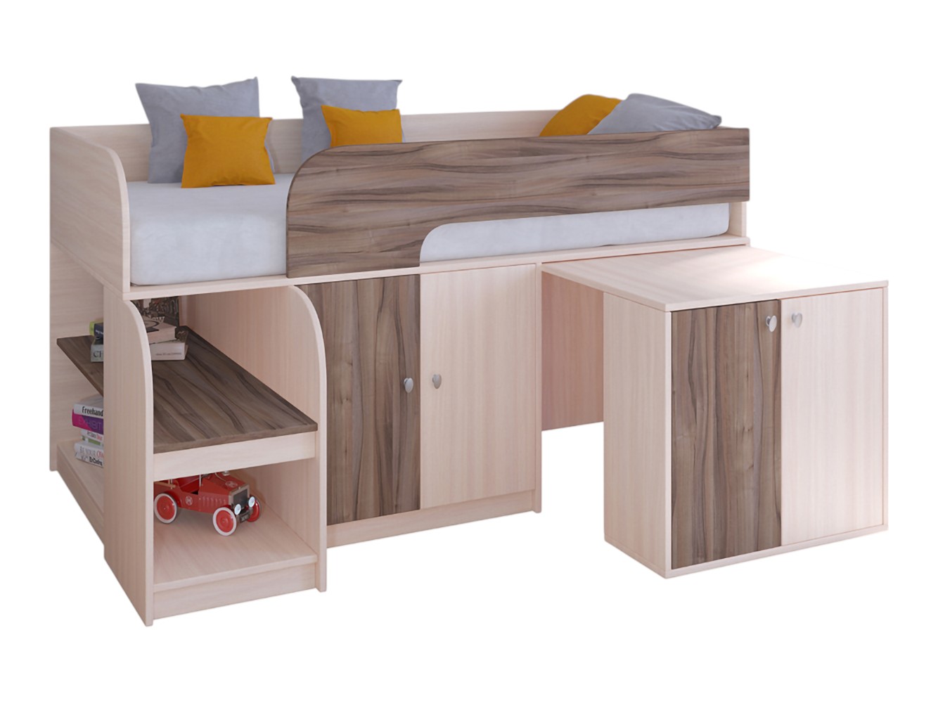 Наполнение: распашной шкафчик с полками, открытые полки, выдвижной письменный стол.