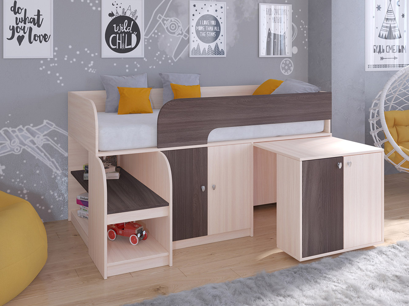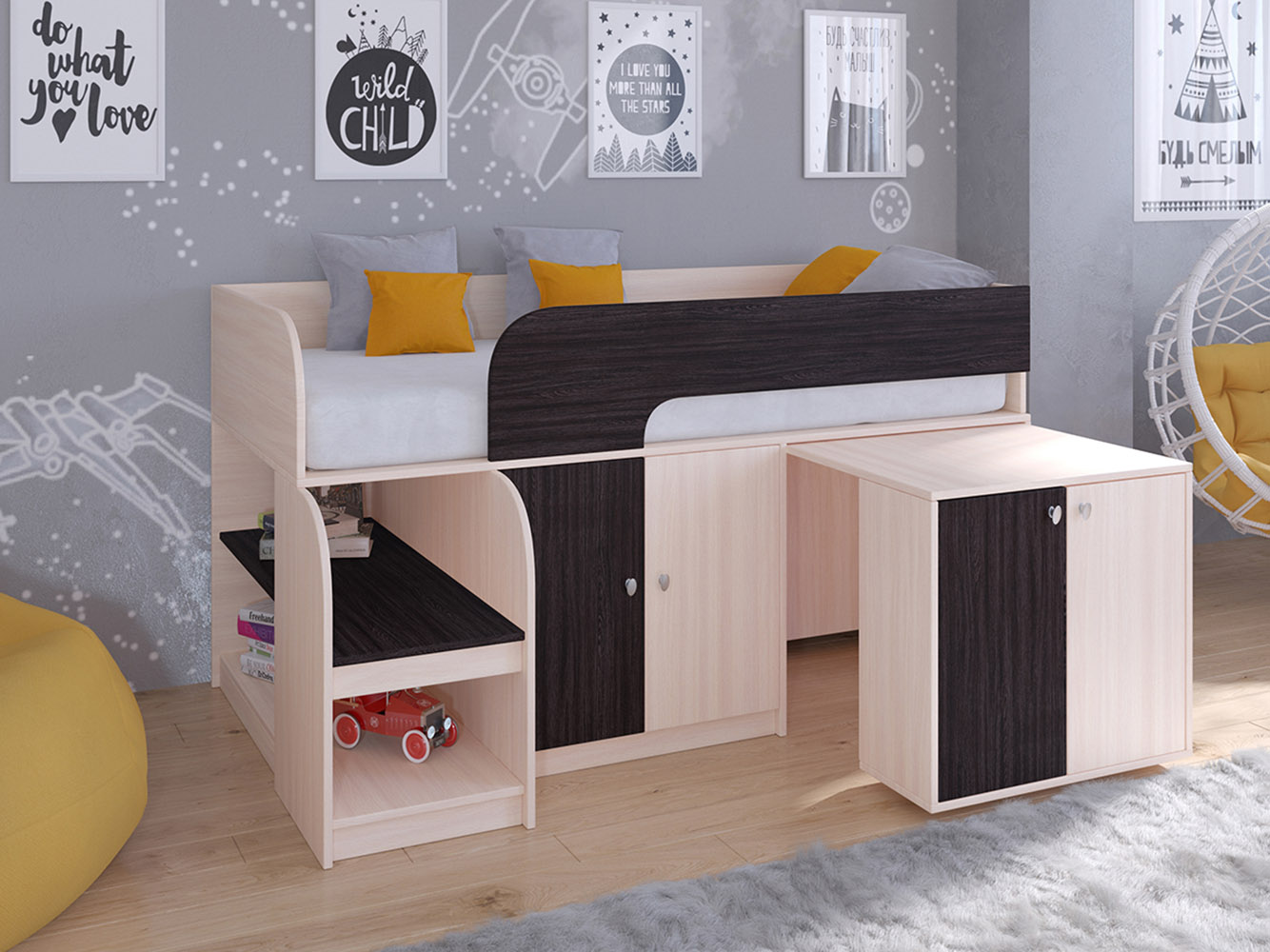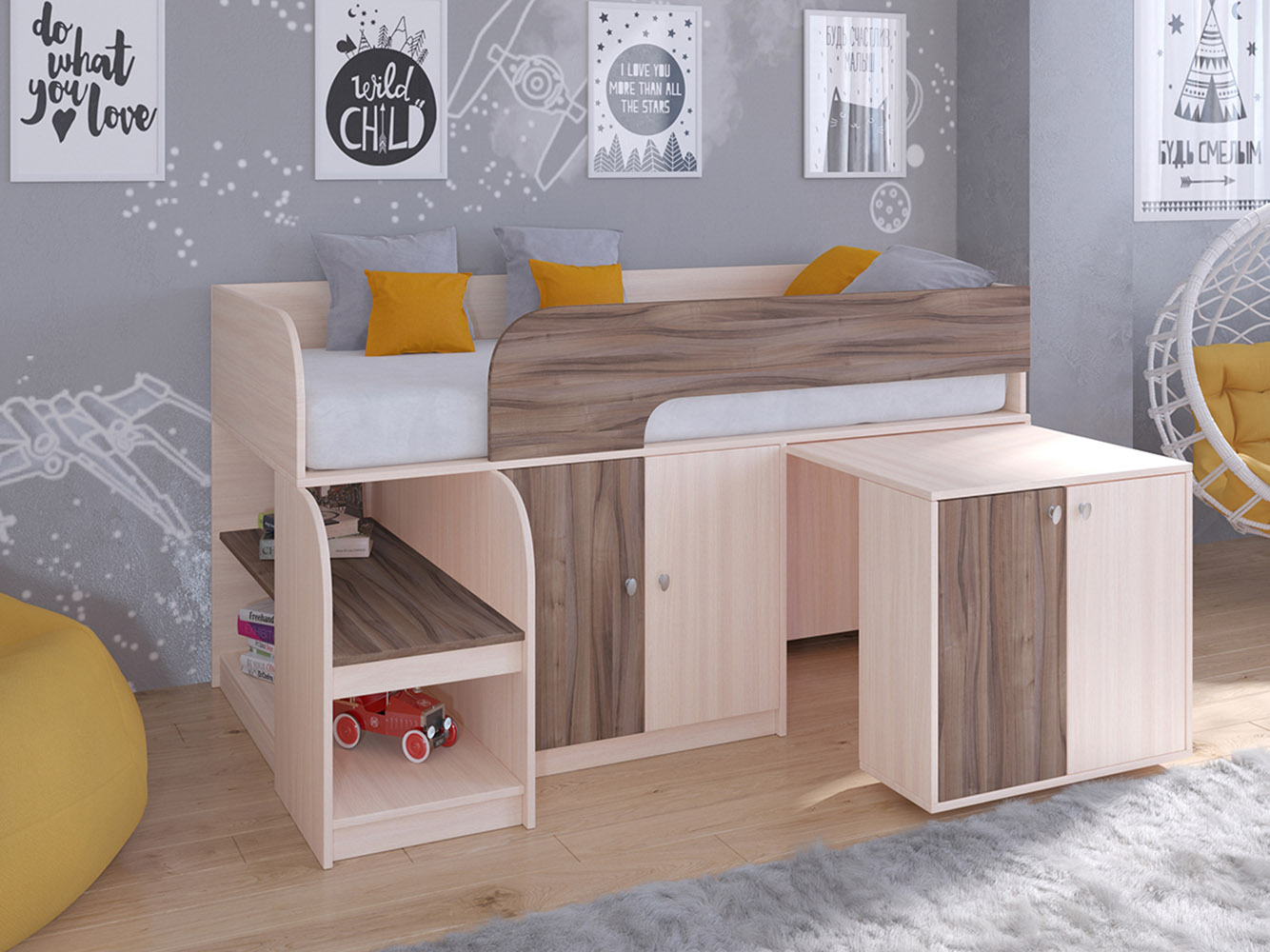 Выдвижной столик-тумба обеспечит удобное рабочее место для игр, учебы или творчества.
