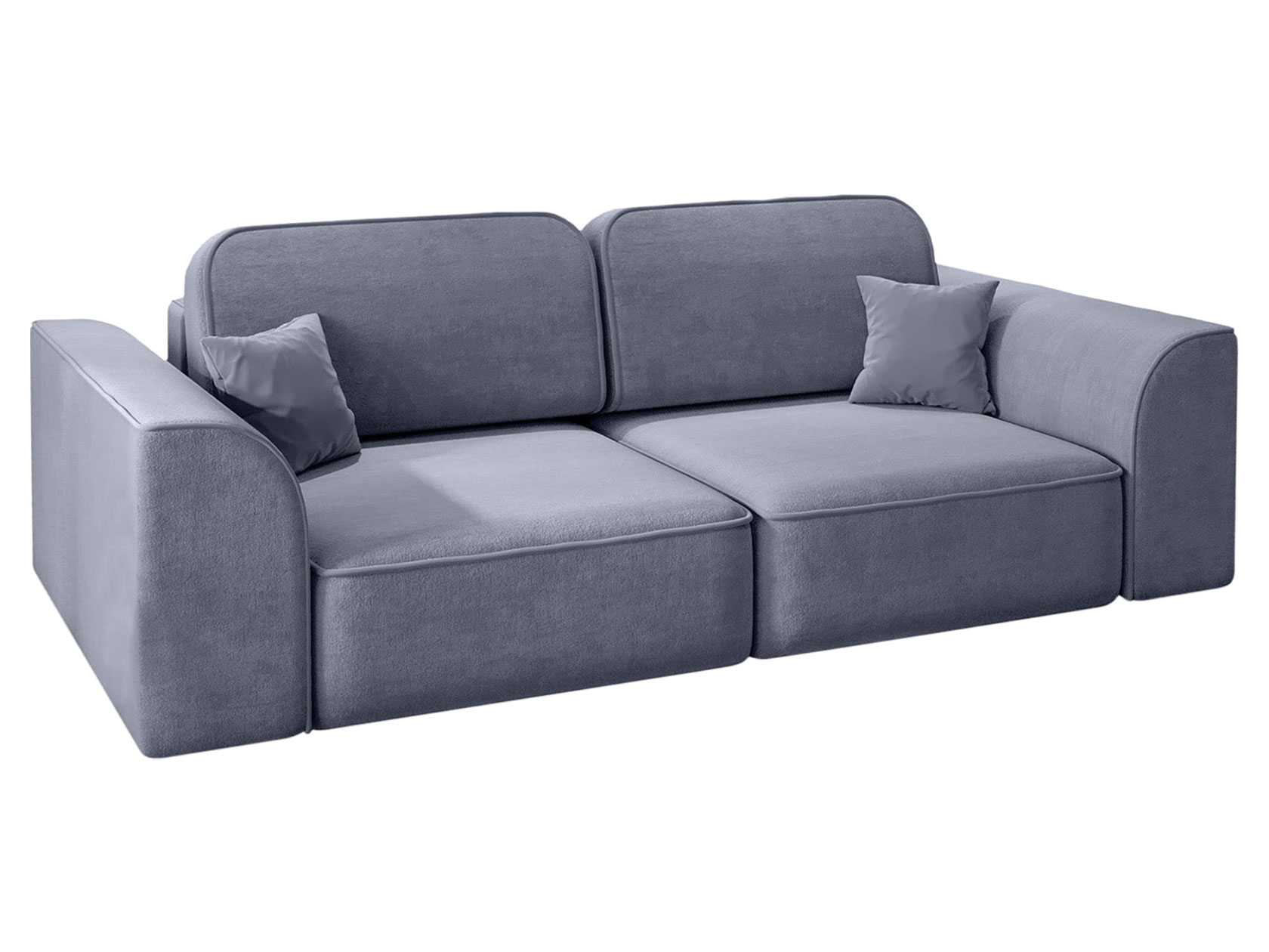 Наружные швы на сиденье и боковинах выступают лаконичными акцентами и подчеркивают необычную форму подлокотников. Модель безупречно выглядит со всех сторон, поэтому подходит для зонирования комнаты. Две независимые секции позволяют менять конфигурацию дивана, превращая его в угловую модель, а декоративные подушки — регулировать глубину посадки.