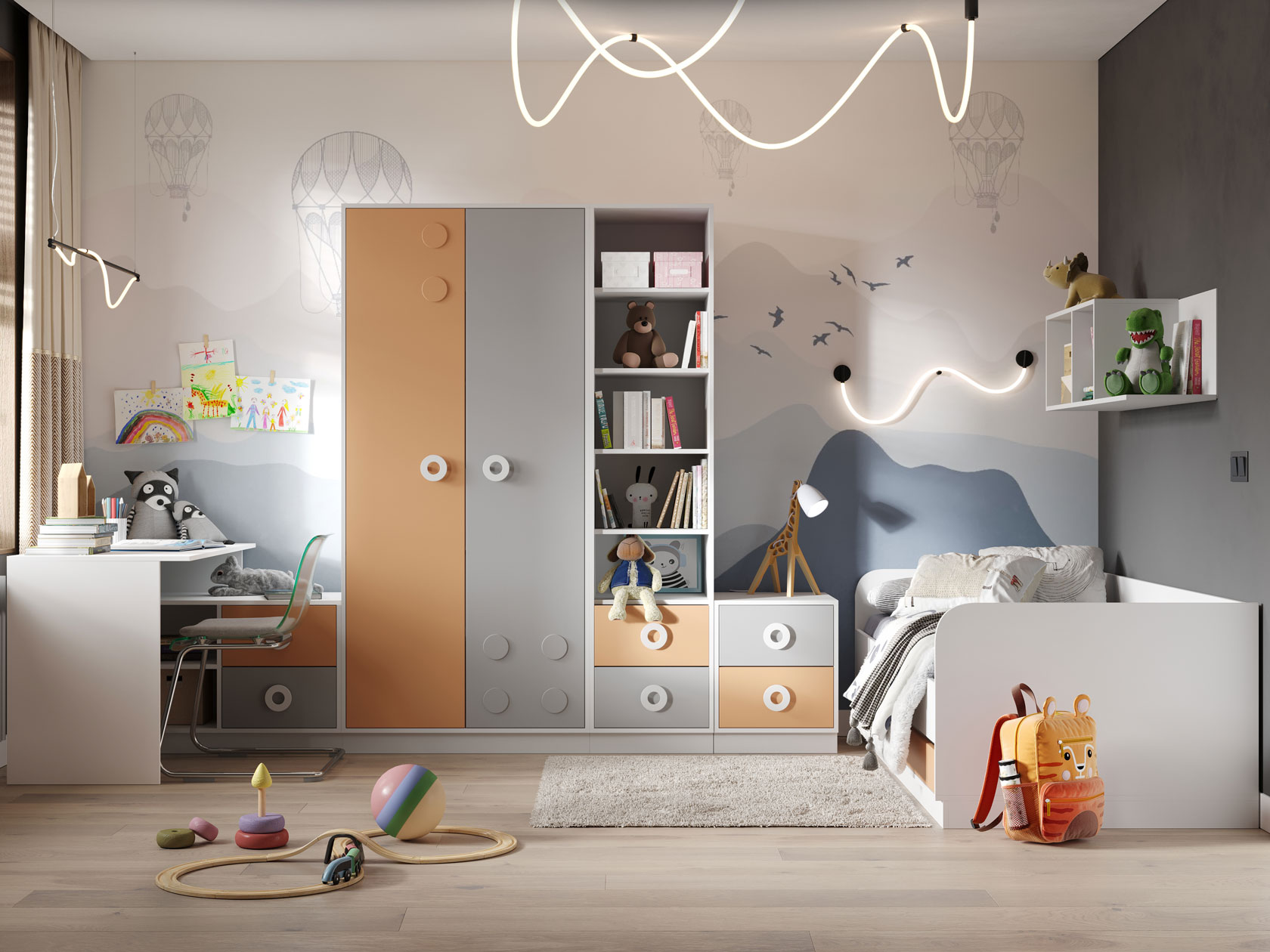 Внутреннее пространство поделено на два равных отделения: со штангой для вешалок и полками для сложенной одежды. Дизайн с объемными элементами и выпуклыми ручками-кнопками создает привлекательные акценты комнаты.