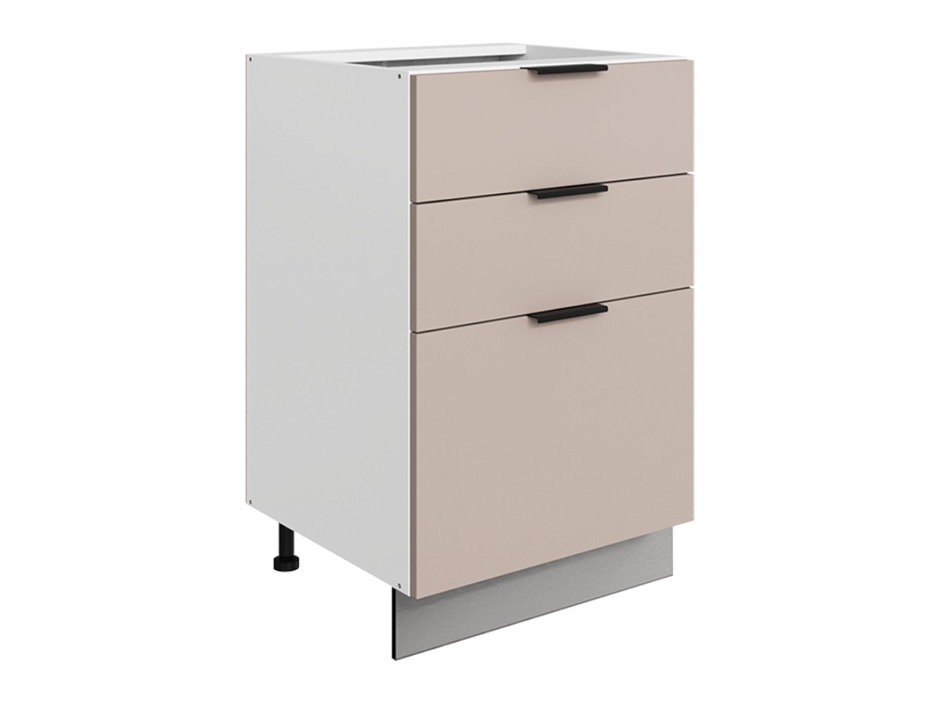 Система выдвижения выдерживает большие нагрузки, поэтому в ящиках удобно хранить тяжелую посуду. Регулируемые опоры компенсируют неровности напольного покрытия. За матовой поверхностью фасадов легко ухаживать с помощью обычной влажной уборки.