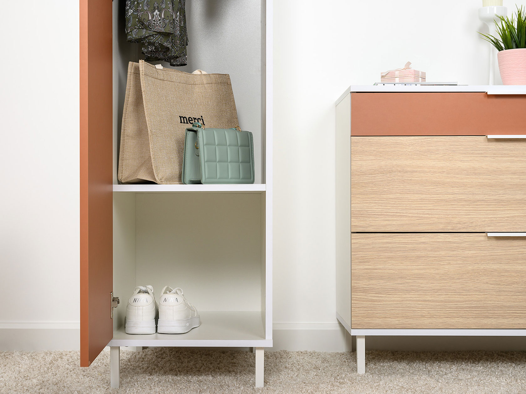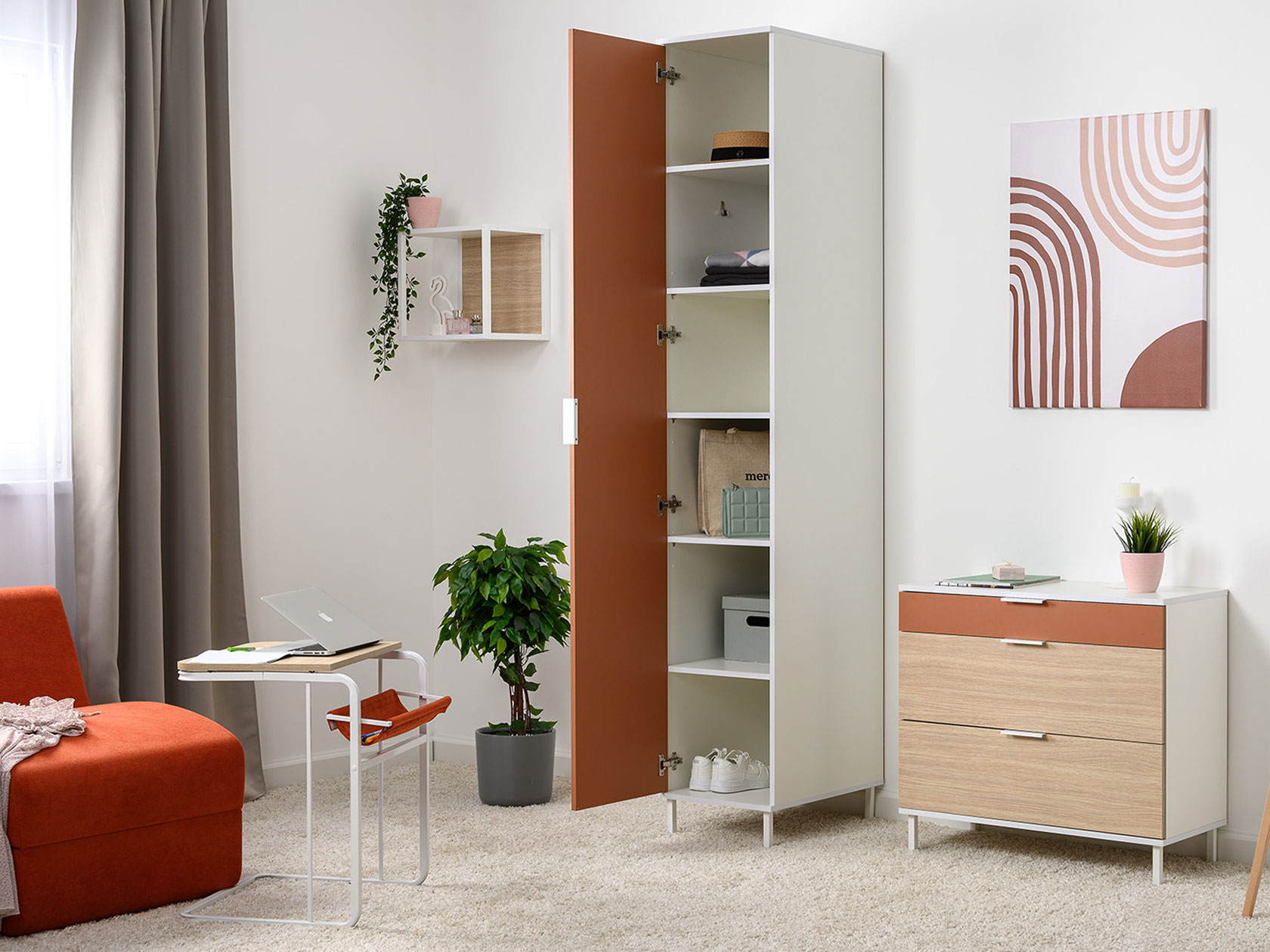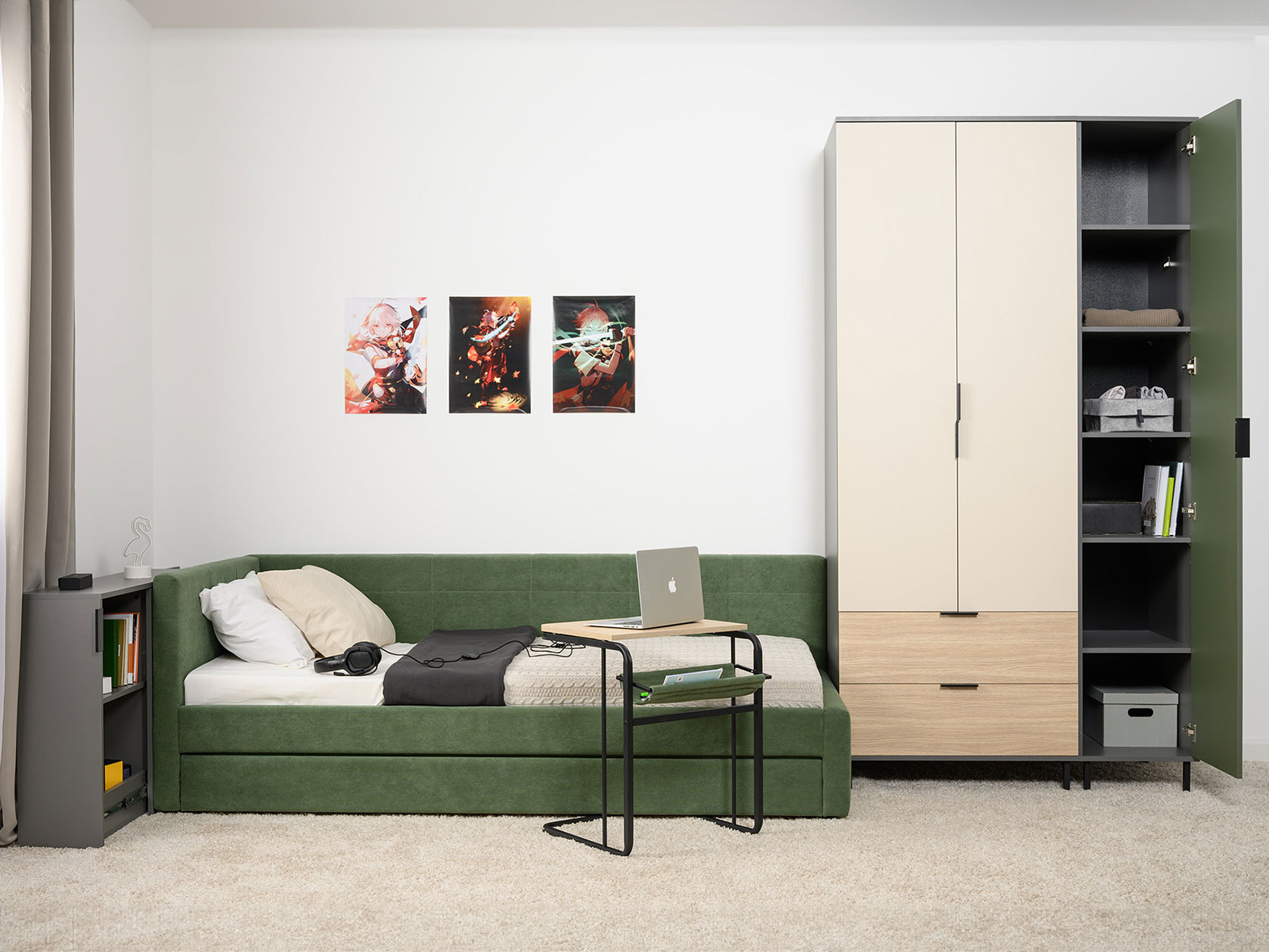 Узкая конструкция станет частью интерьера небольшой комнаты. Ножки позволяют проводить уборку и делают модель визуально легкой.