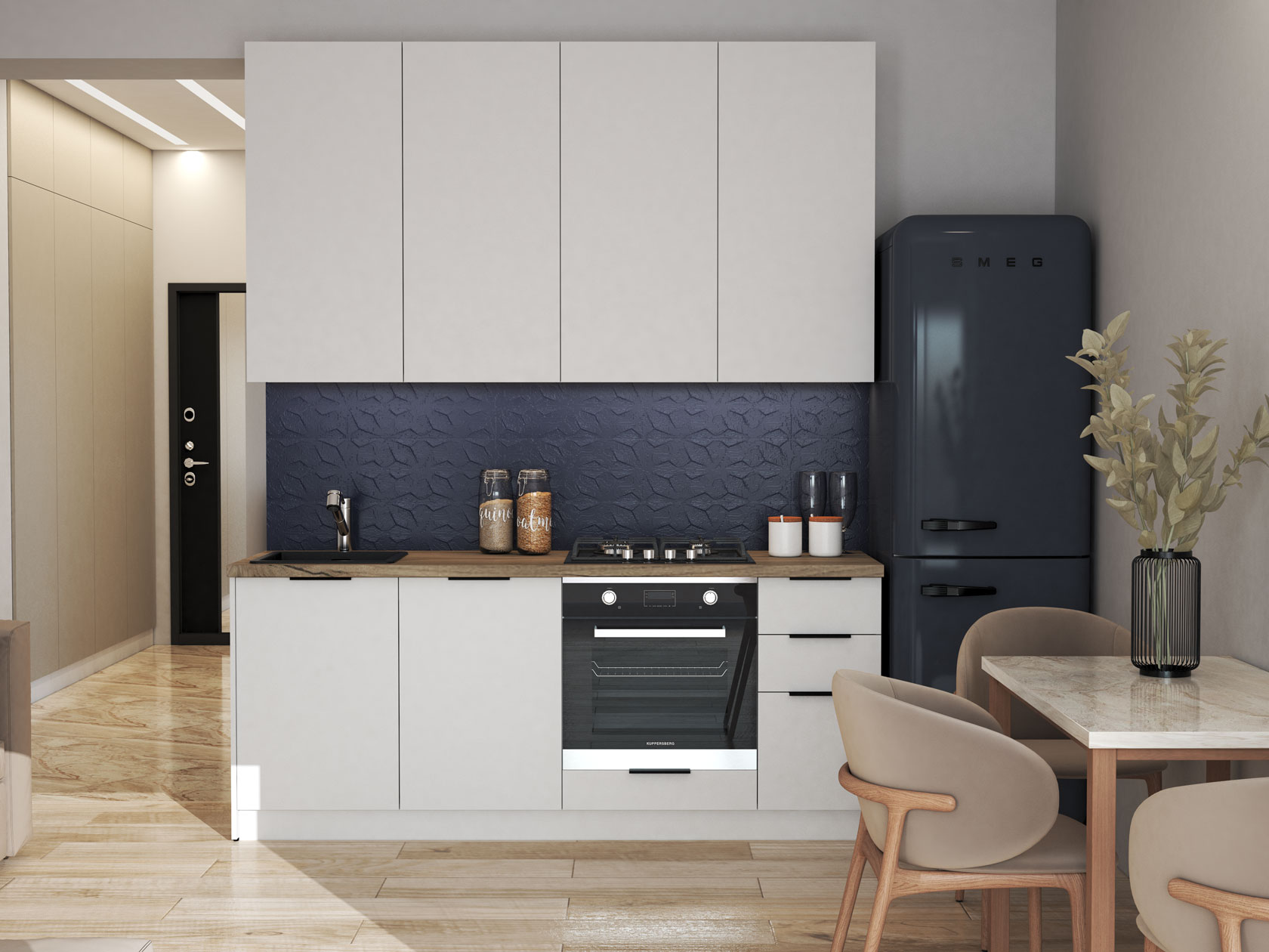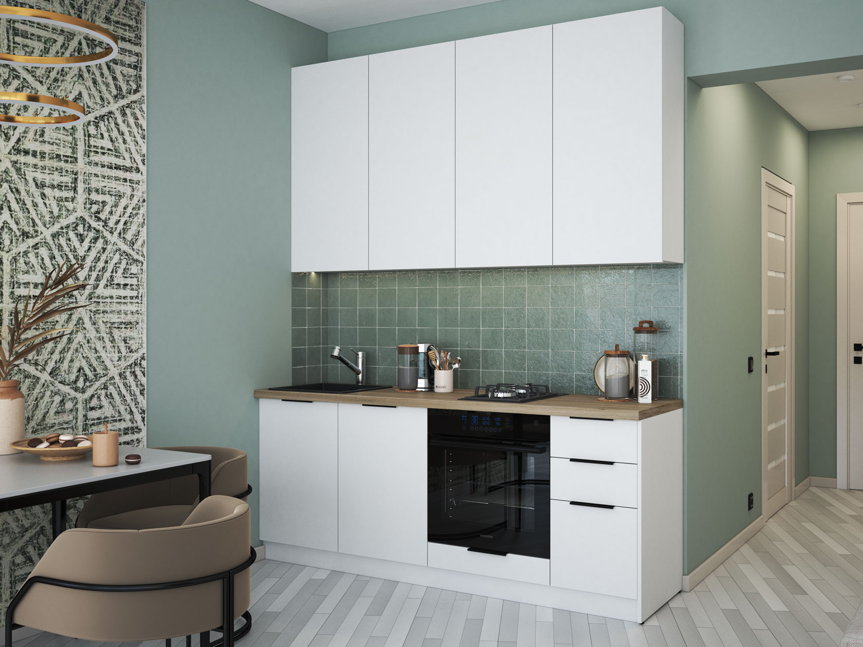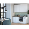 Мебель позволит создать компактную зону для приготовления пищи и хранения необходимых принадлежностей. Гладкие матовые фасады выглядят актуально и удачно сочетаются с разными стилями оформления интерьера.