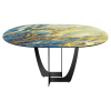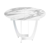 Поверхность с покрытием, имитирующим мрамор, не имеет острых углов и хорошо сочетается с разными стилями меблировки. Опоры оригинальной формы станут ярким дополнением интерьера. При необходимости модель легко раскладывается, позволяя комфортно разместить компанию из нескольких человек.