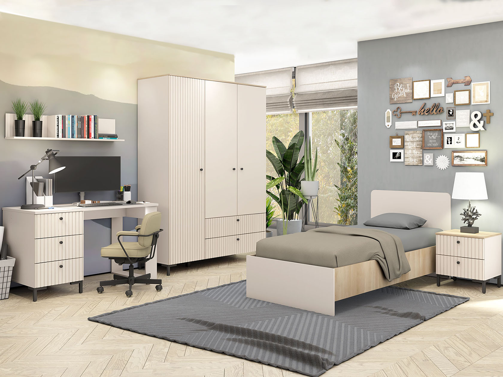Для учебы и занятий творчеством предусмотрен просторный стол с функциональной тумбой. Кровать с высоким изголовьем позволит расслабиться и отдохнуть после школы. Вместительная система хранения позаботится о том, чтобы в комнате было легко поддерживать порядок.