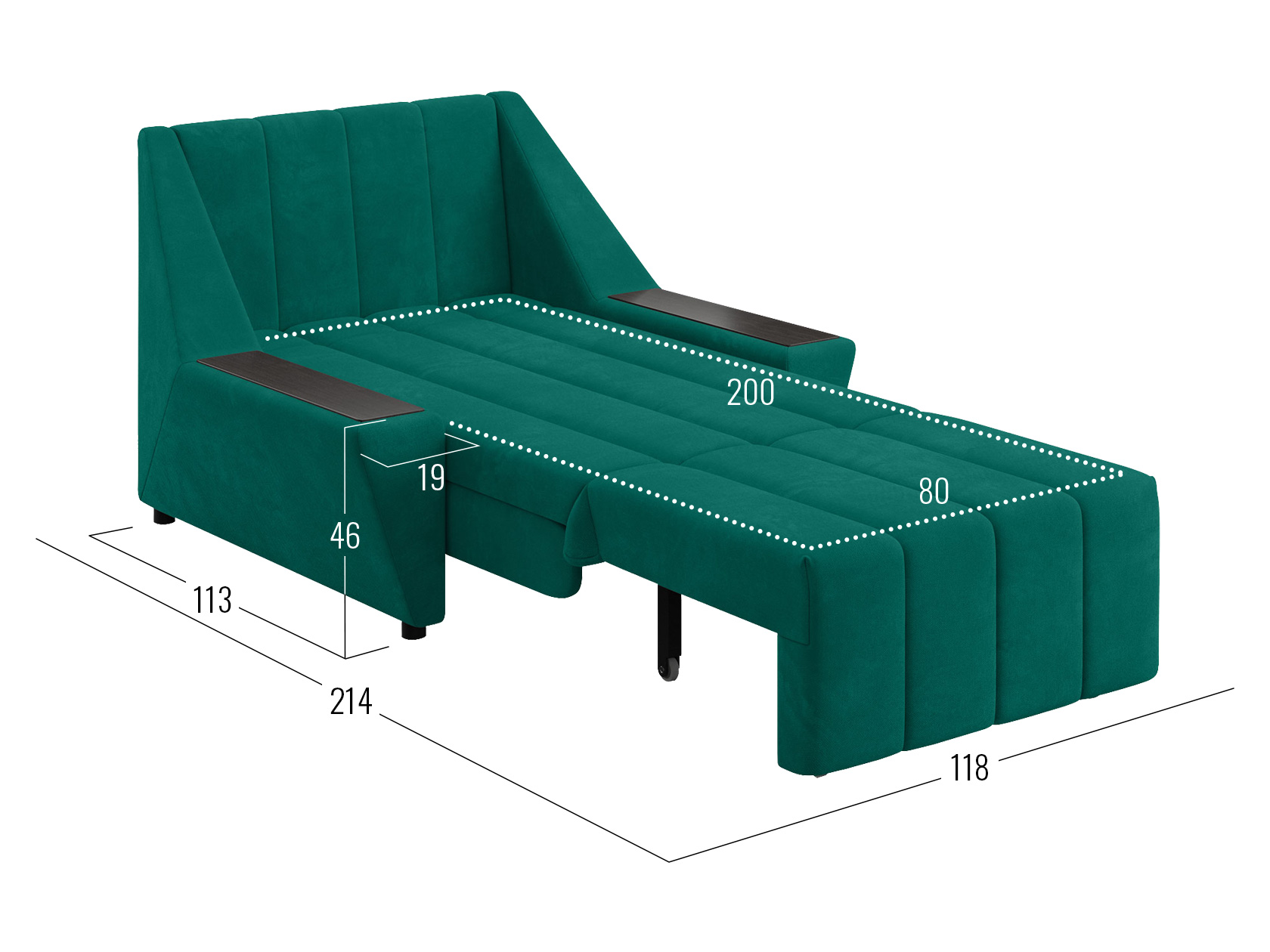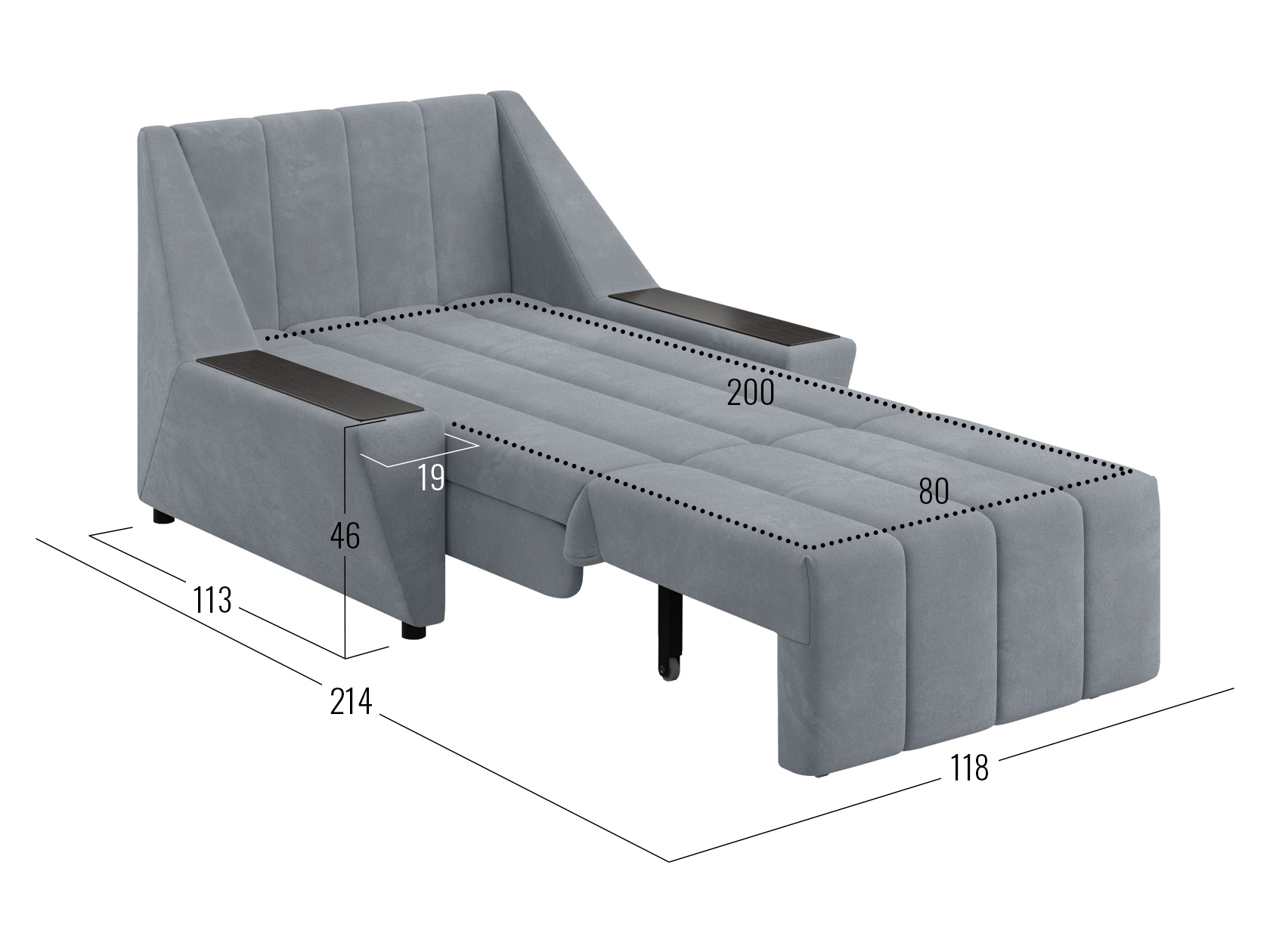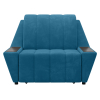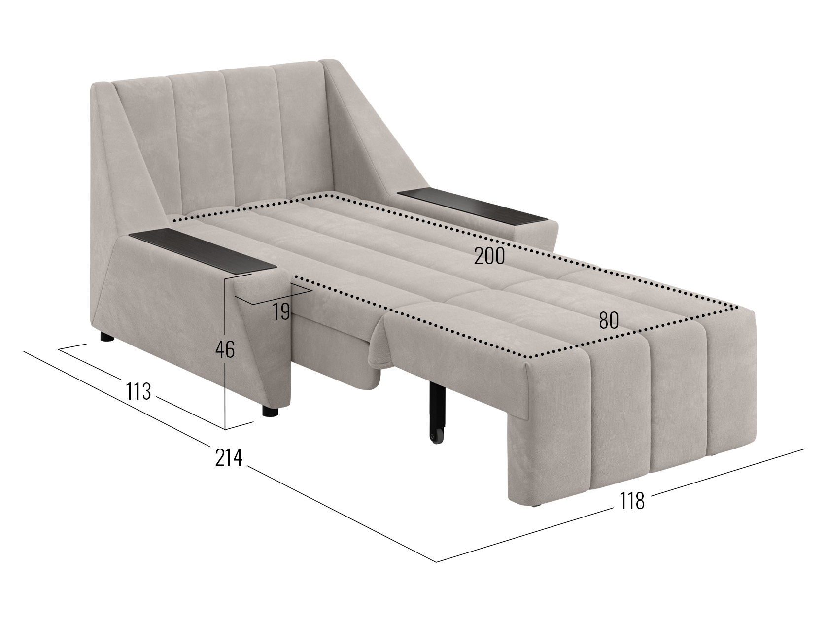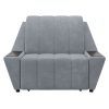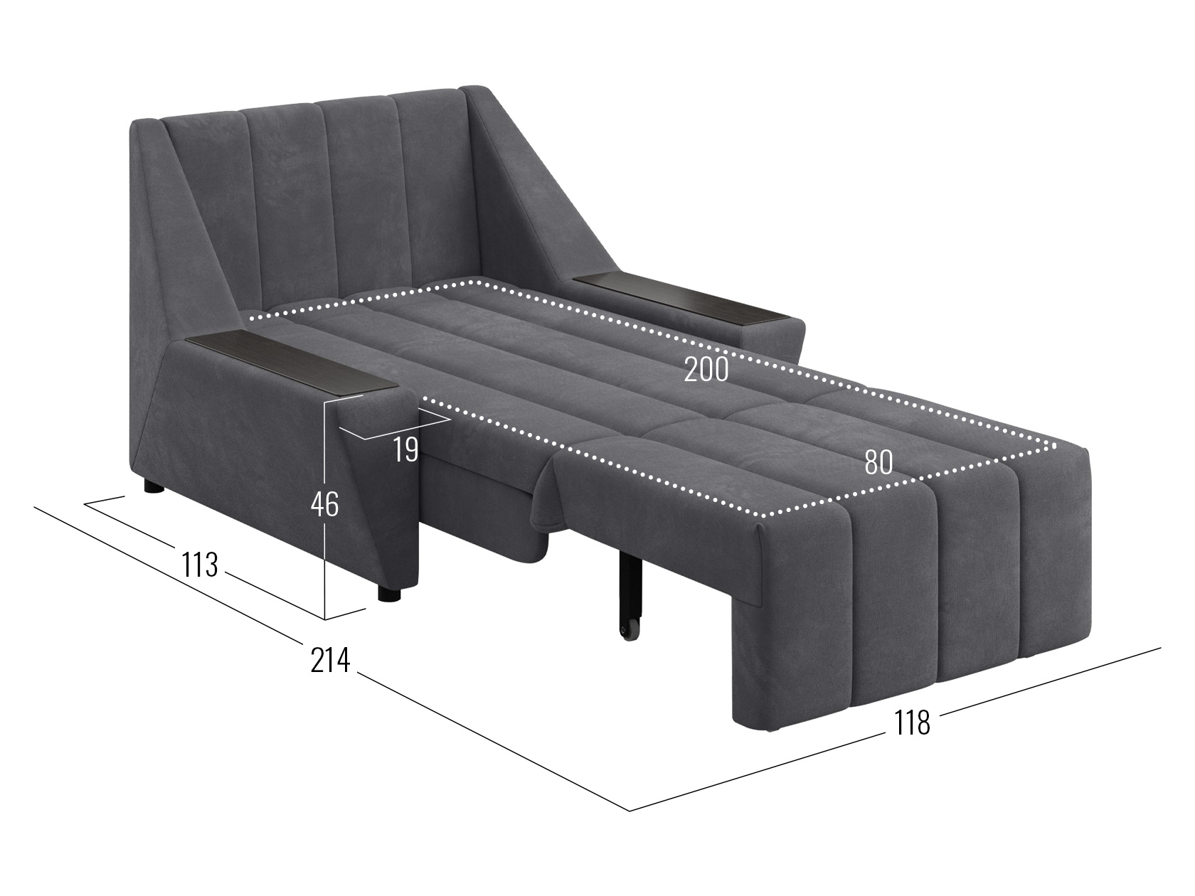 Широкие подлокотники оснащены специальными накладками, которые можно использовать в качестве мини-столешниц. В разложенном виде модель образует ровное спальное место с высоким изголовьем. Небольшой бельевой короб создает дополнительное пространство для хранения вещей.