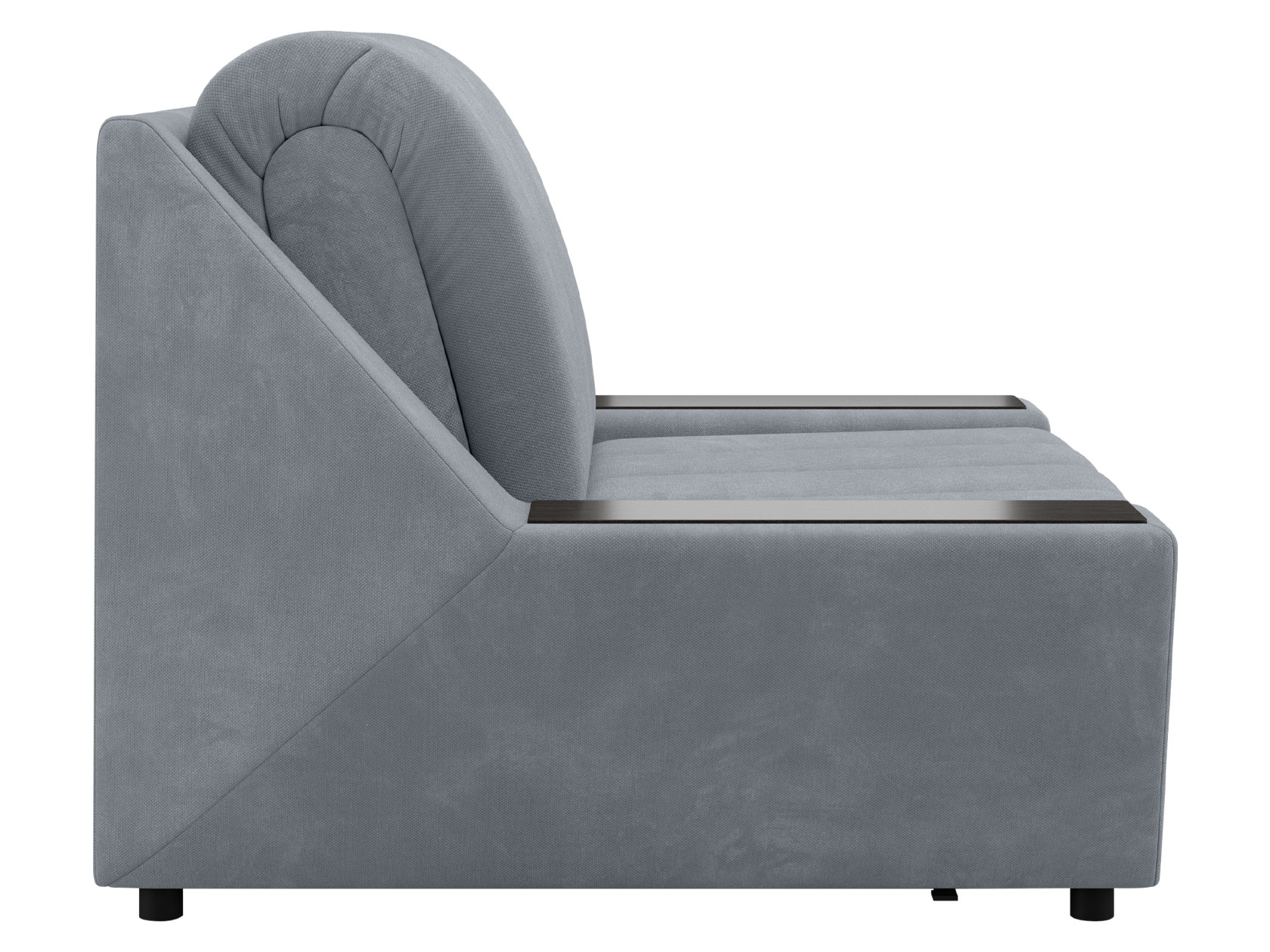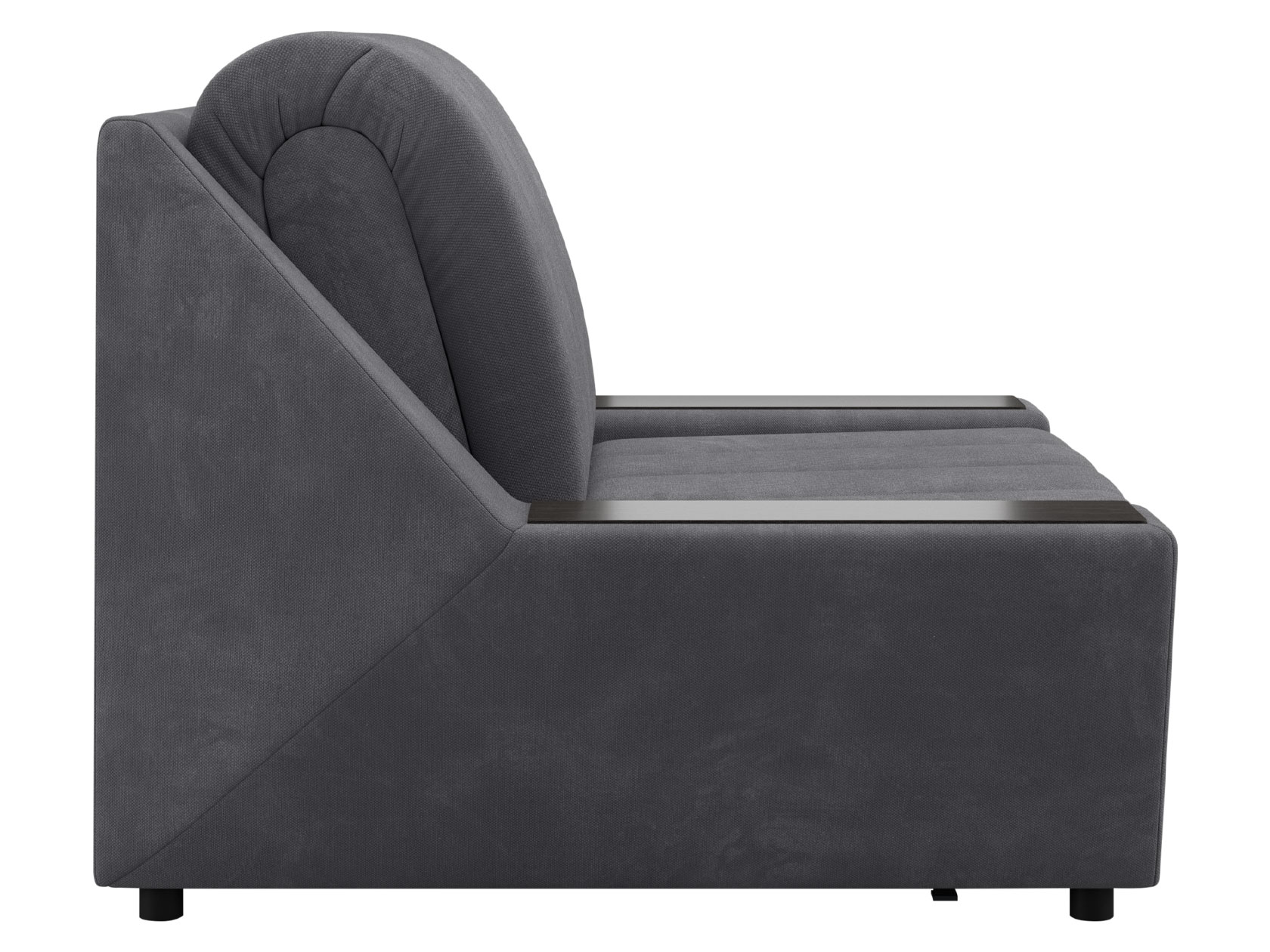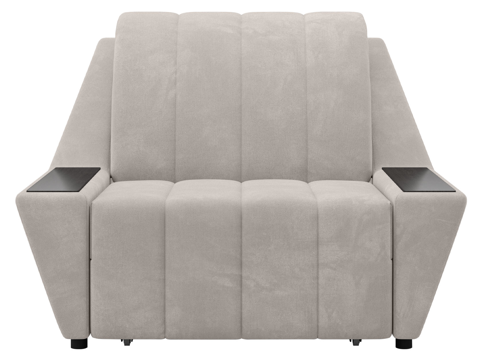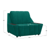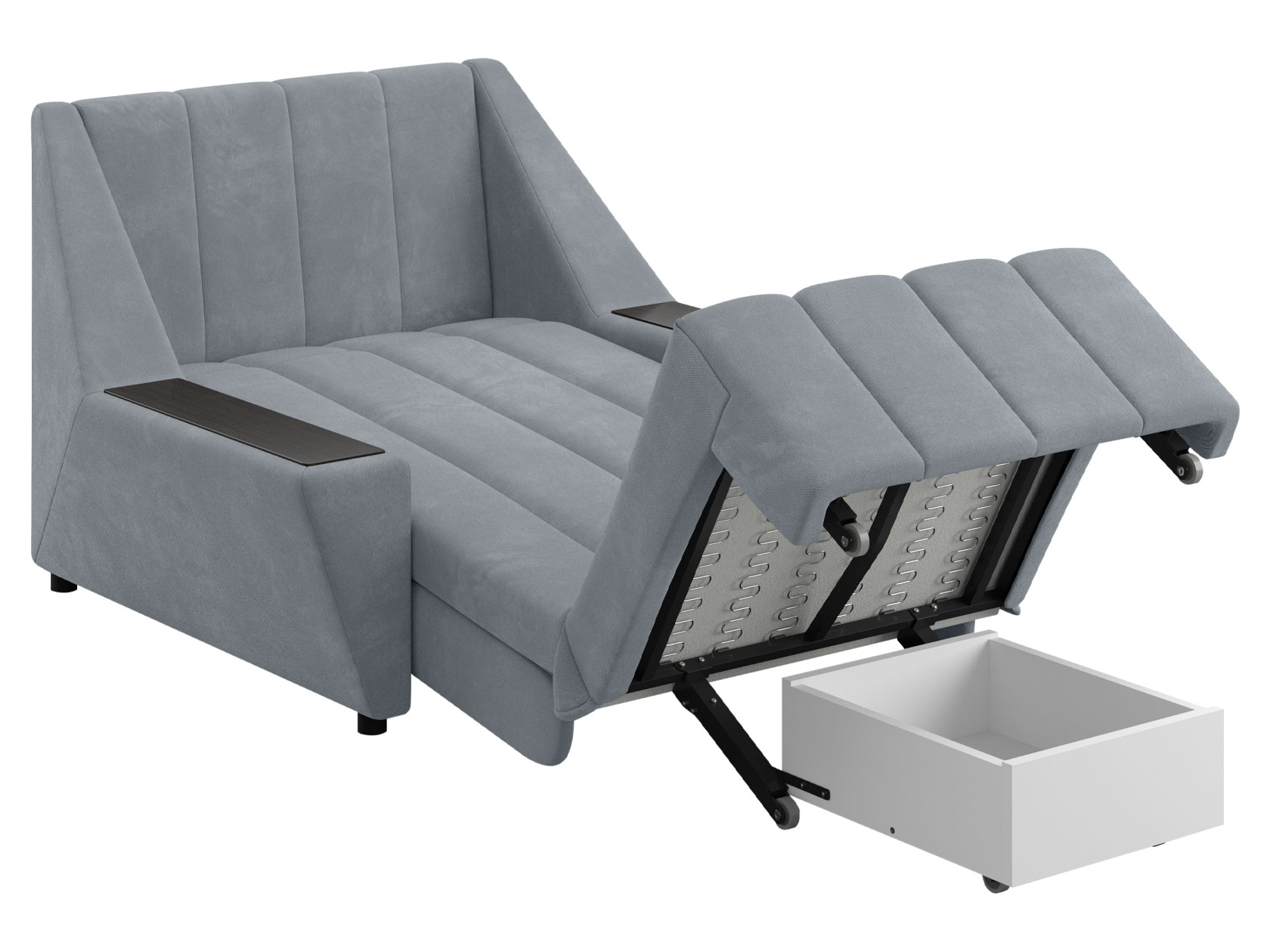 Широкие подлокотники оснащены специальными накладками, которые можно использовать в качестве мини-столешниц. В разложенном виде модель образует ровное спальное место с высоким изголовьем. Небольшой бельевой короб создает дополнительное пространство для хранения вещей.