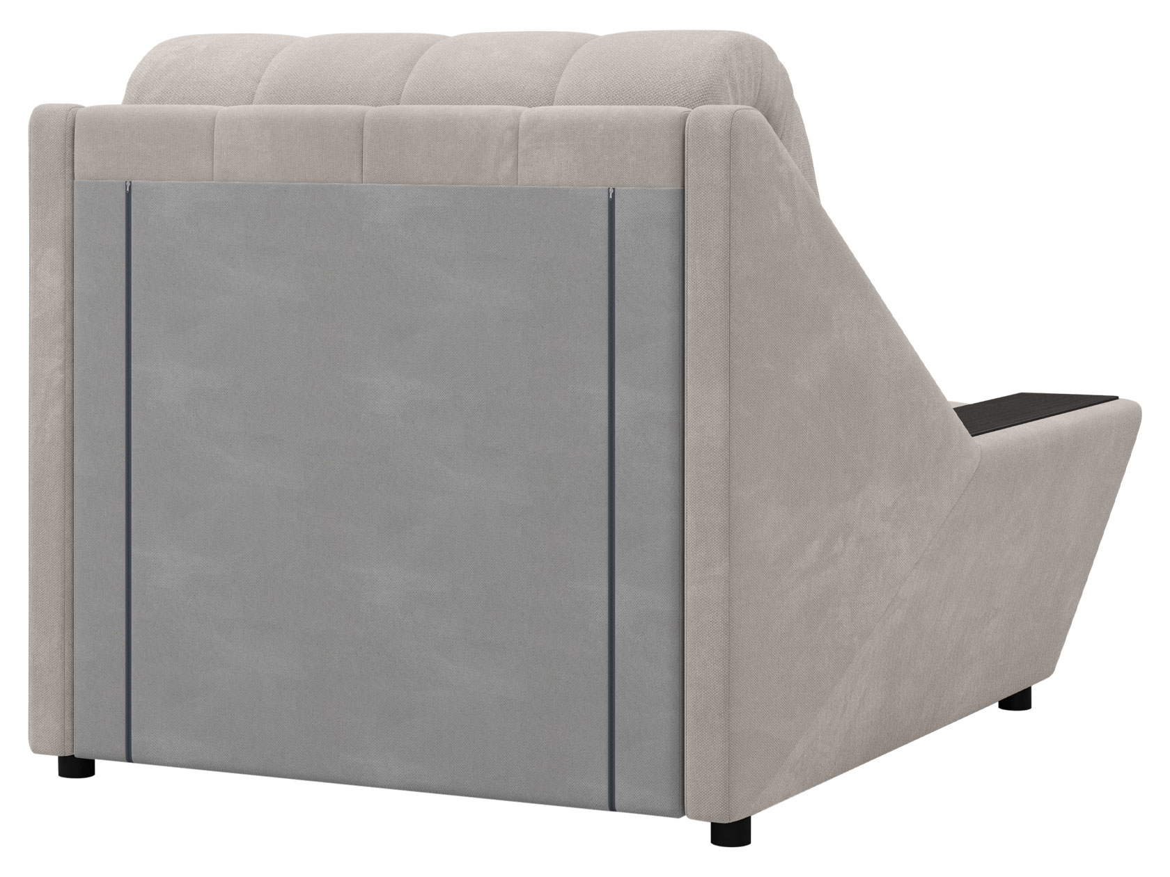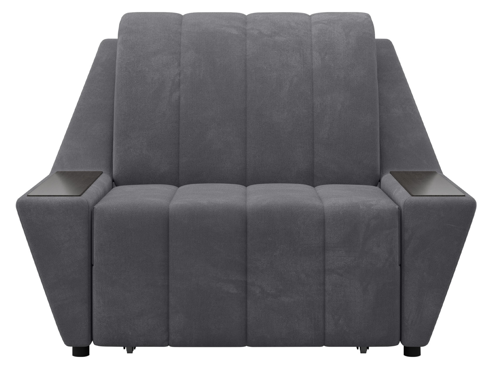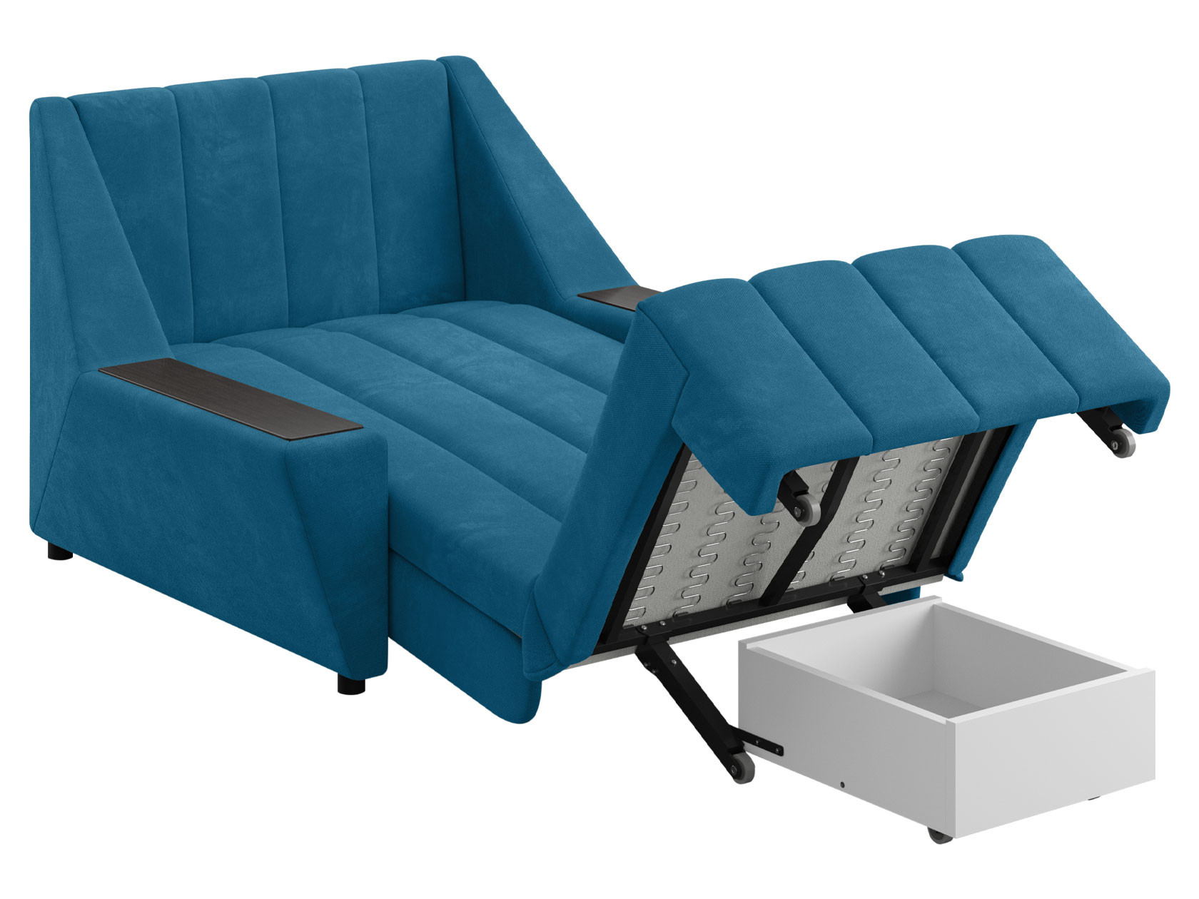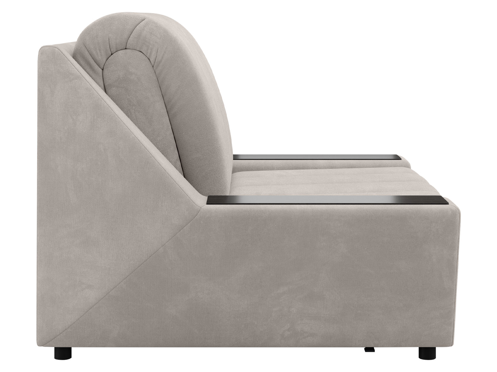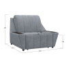 Широкие подлокотники оснащены специальными накладками, которые можно использовать в качестве мини-столешниц. В разложенном виде модель образует ровное спальное место с высоким изголовьем. Небольшой бельевой короб создает дополнительное пространство для хранения вещей.