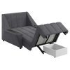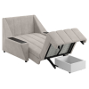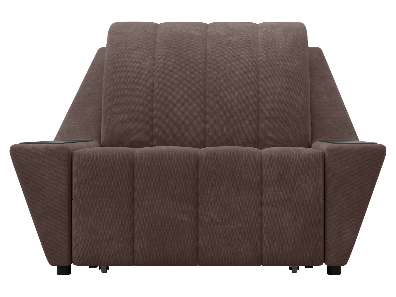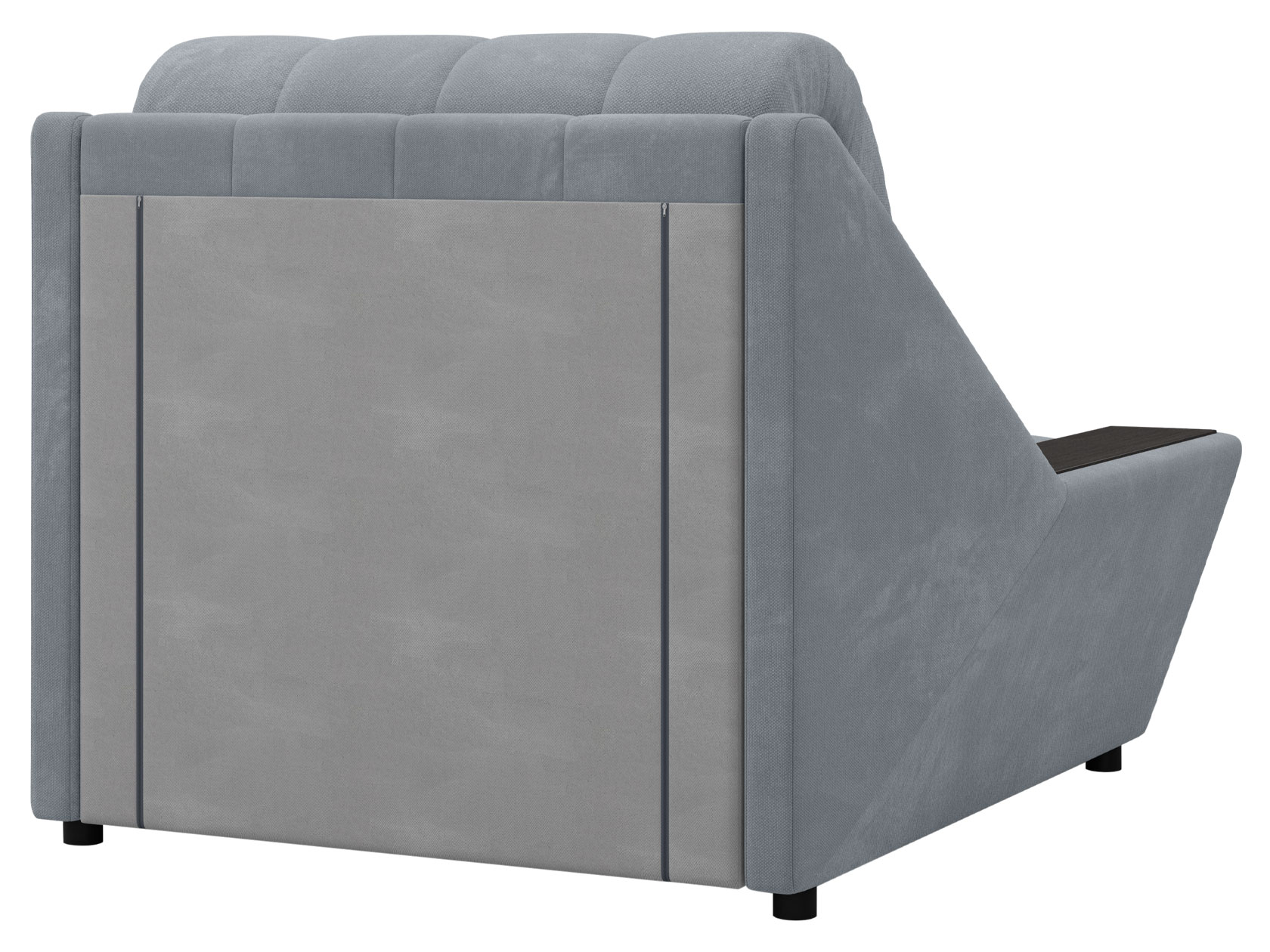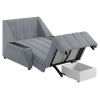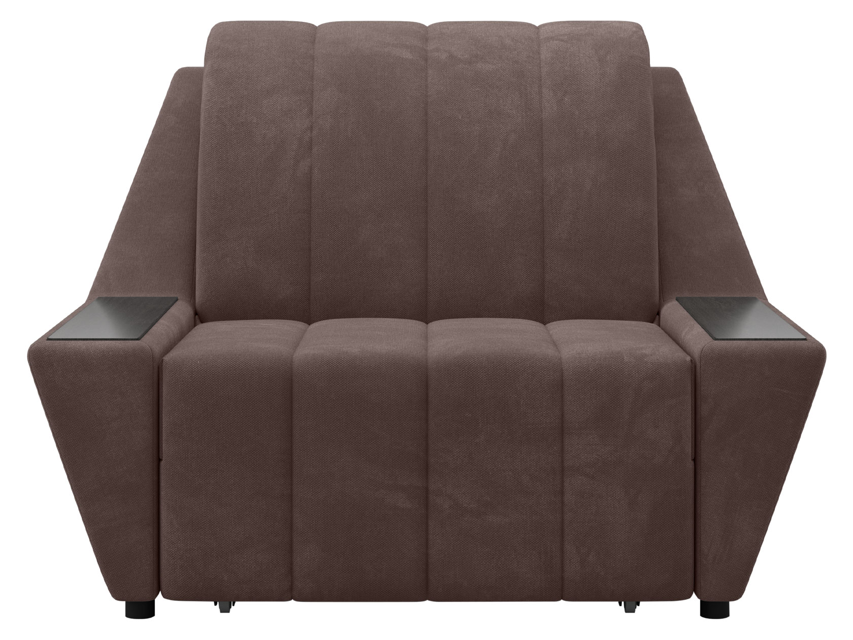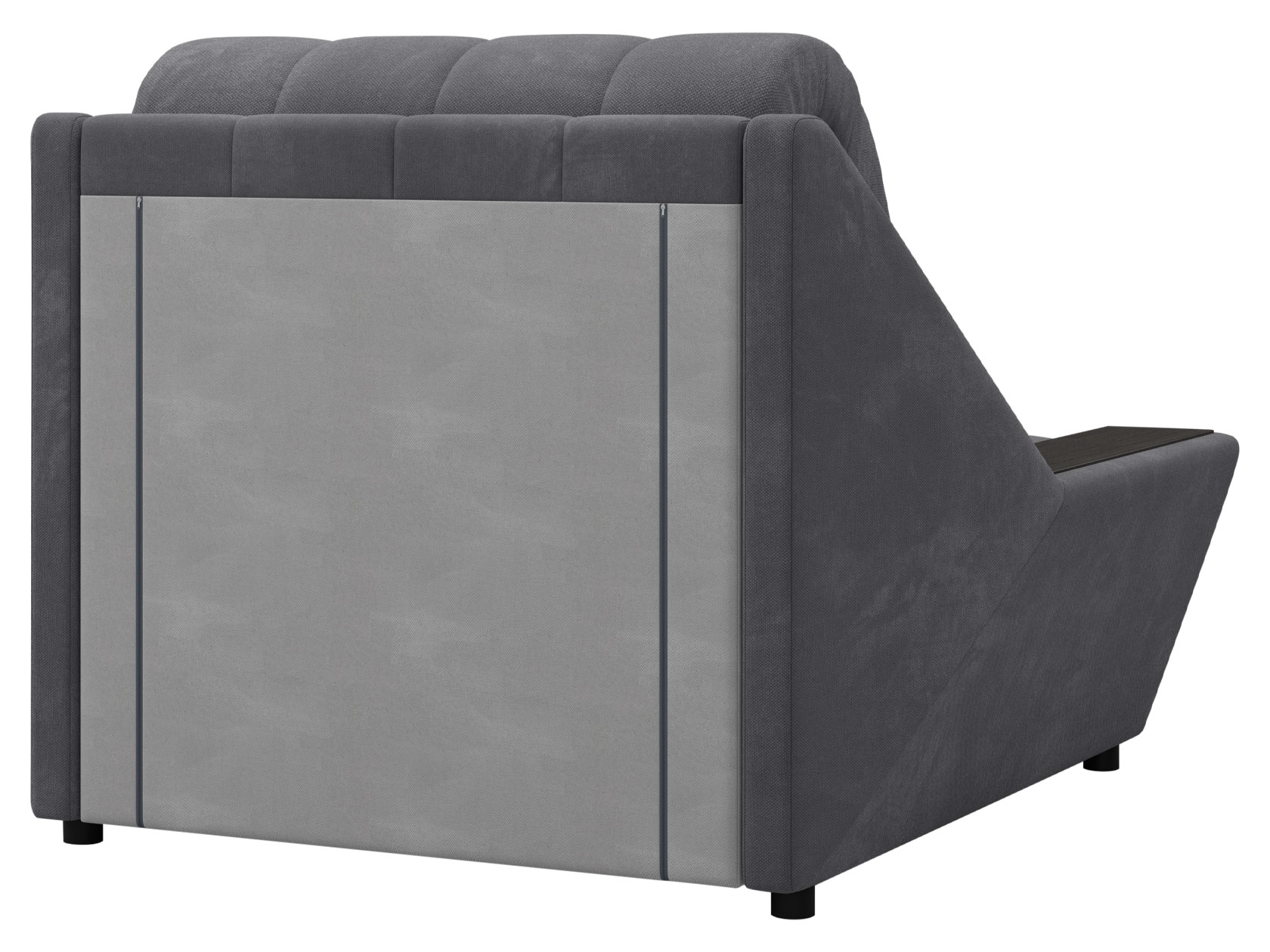 Широкие подлокотники оснащены специальными накладками, которые можно использовать в качестве мини-столешниц. В разложенном виде модель образует ровное спальное место с высоким изголовьем. Небольшой бельевой короб создает дополнительное пространство для хранения вещей.