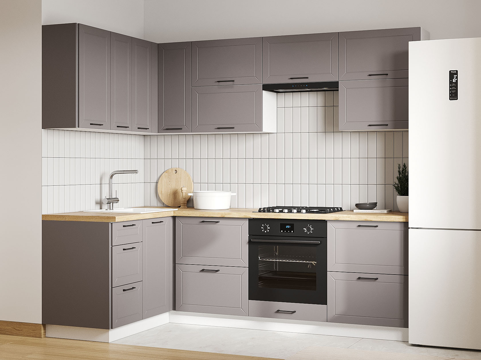 Расположение элементов позволяет создать комфортные условия для работы и соблюсти правило рабочего треугольника. Качественные направляющие ящиков и подъемный механизм откидных дверей гарантируют безопасную эксплуатацию мебели.