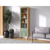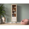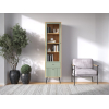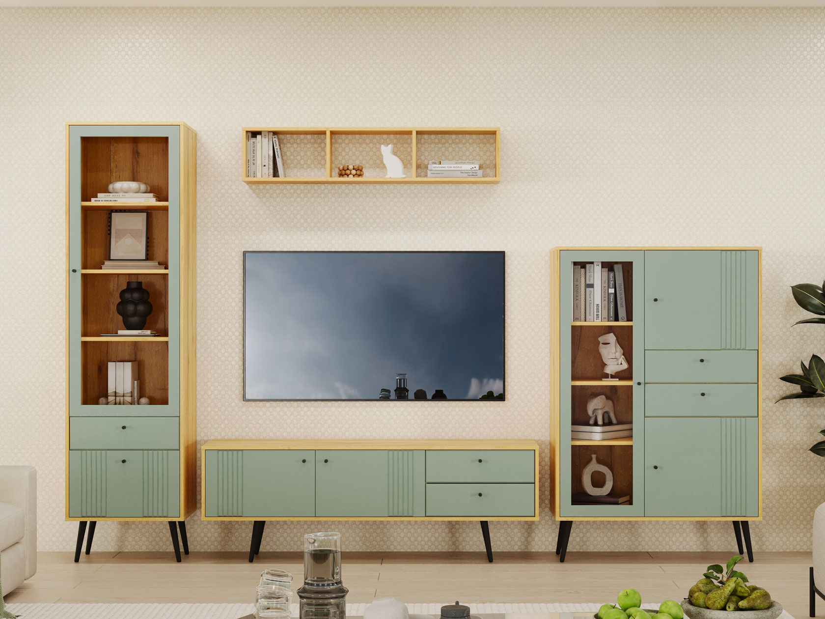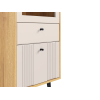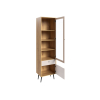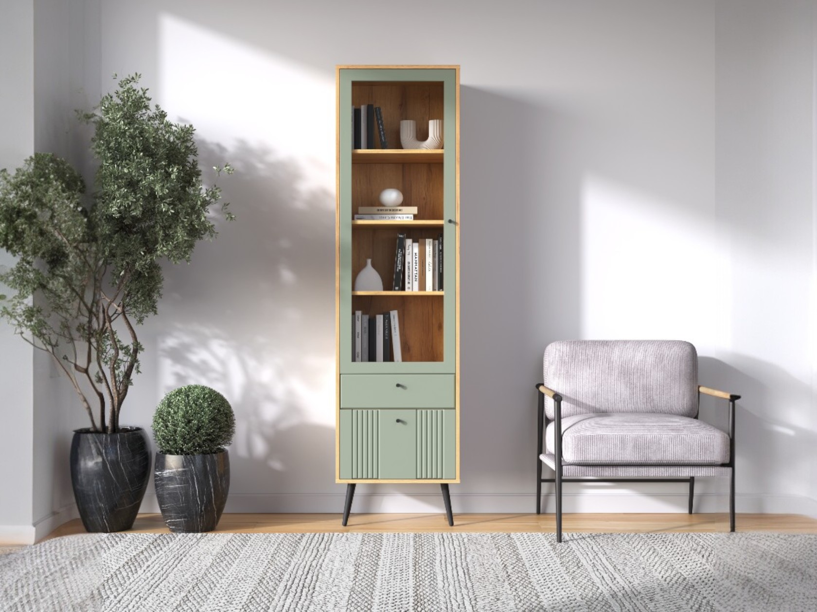 Дверца со стеклянной вставкой позволяет разместить на виду домашнюю библиотеку, коллекционные статуэтки и предметы декора. Нижний фасад украшен вертикальной фрезеровкой, а ножки с небольшим наклоном облегчают уборку и создают особые акценты интерьера.