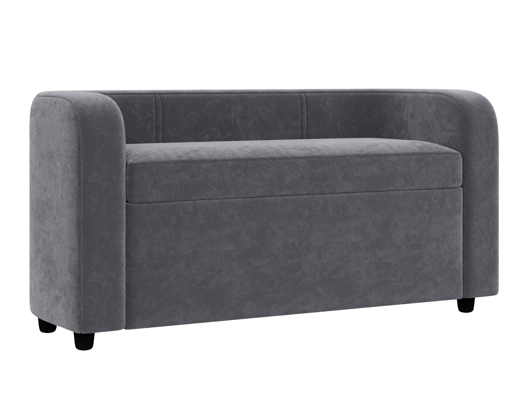 Спинка и подлокотники образуют единую линию, подчеркивая лаконичность дизайна. В качестве обивки используется износостойкий и простой в уходе материал. Под сиденьем находится глубокий короб, который создает дополнительное место для хранения вещей.