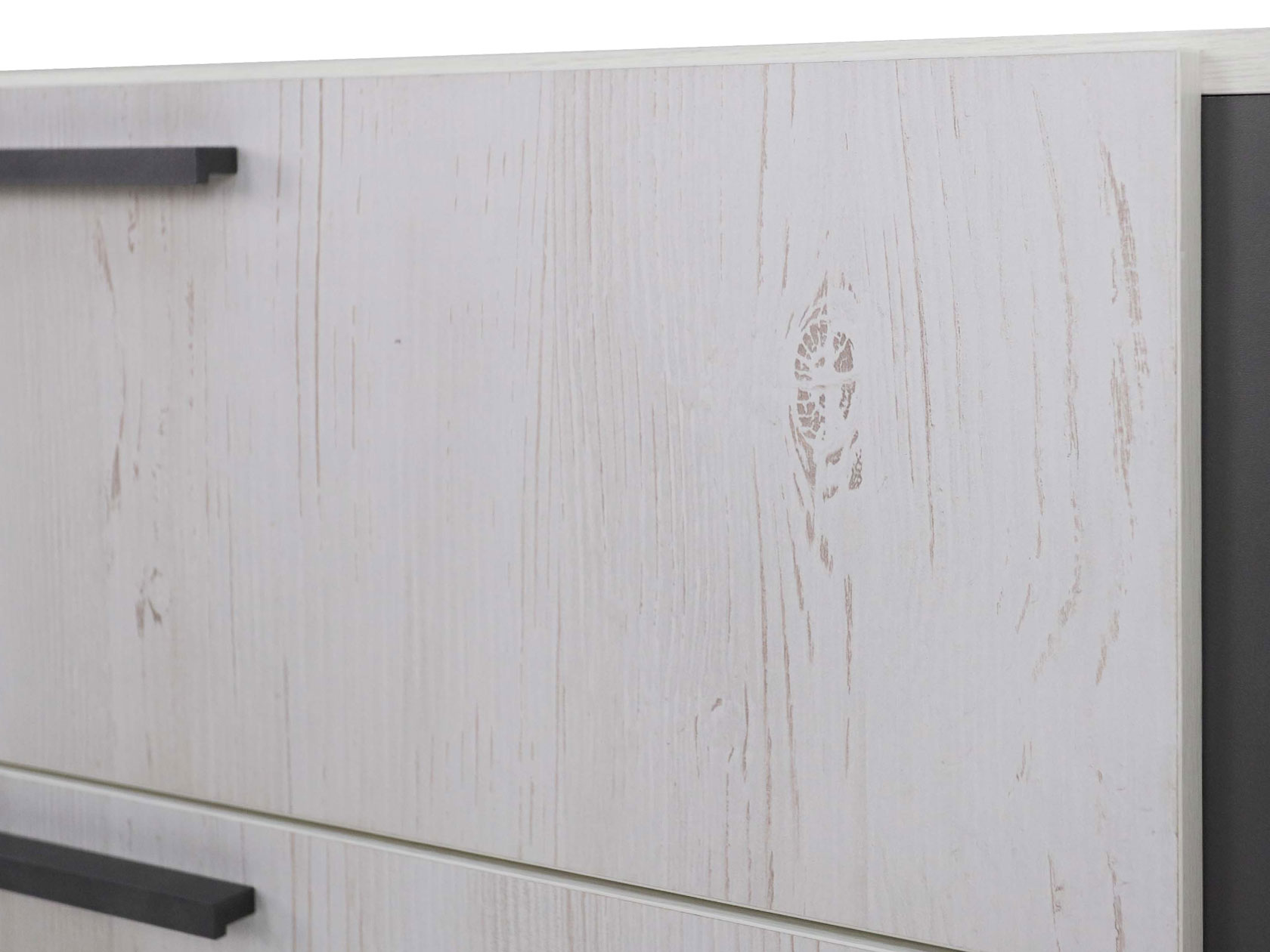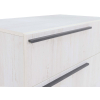 Модель с просторными выдвижными ящиками подходит для белья, одежды и аксессуаров. На поверхности удобно разместить осветительные приборы, растения и рамки с фотографиями. Матовые фасады под дерево дополнены продолговатыми ручками, что добавляет пространству эстетики.