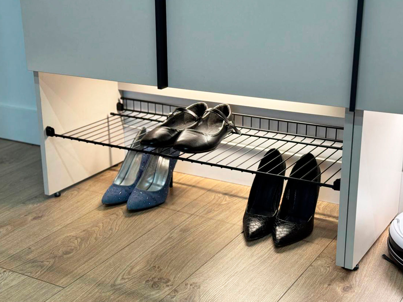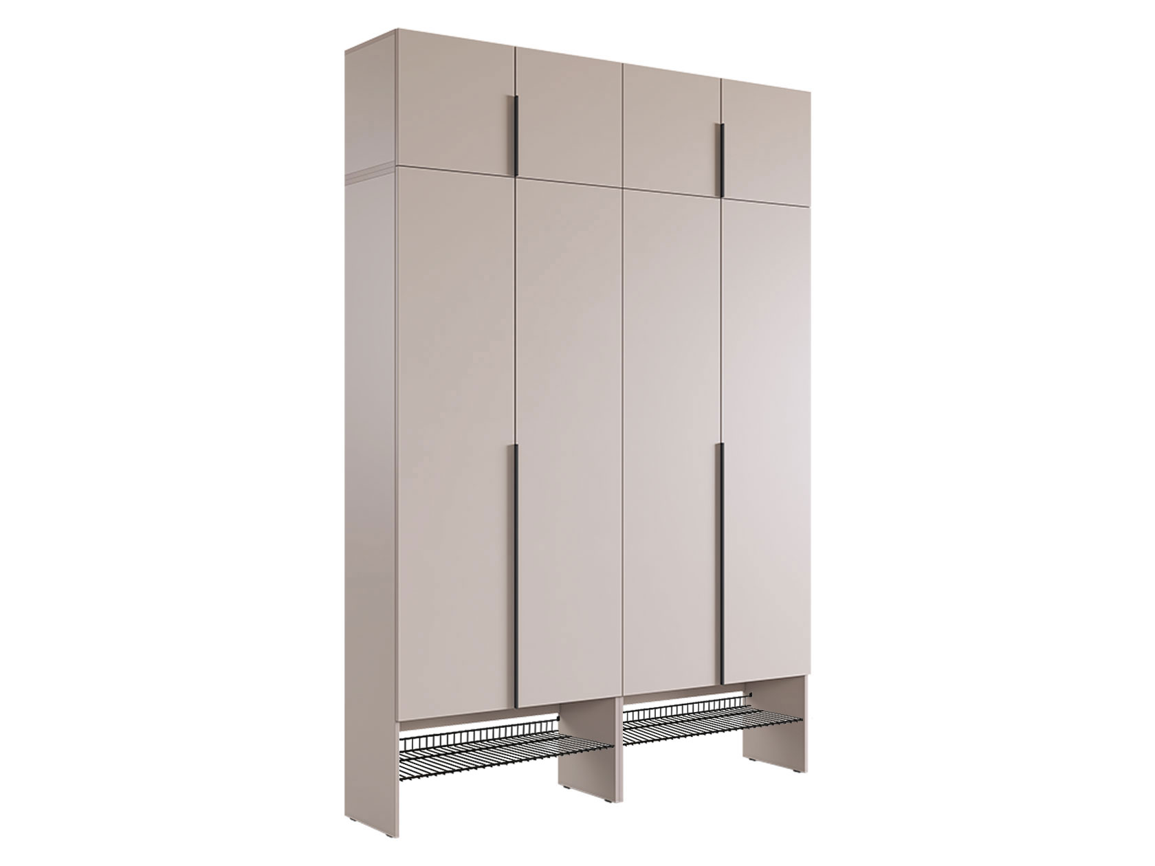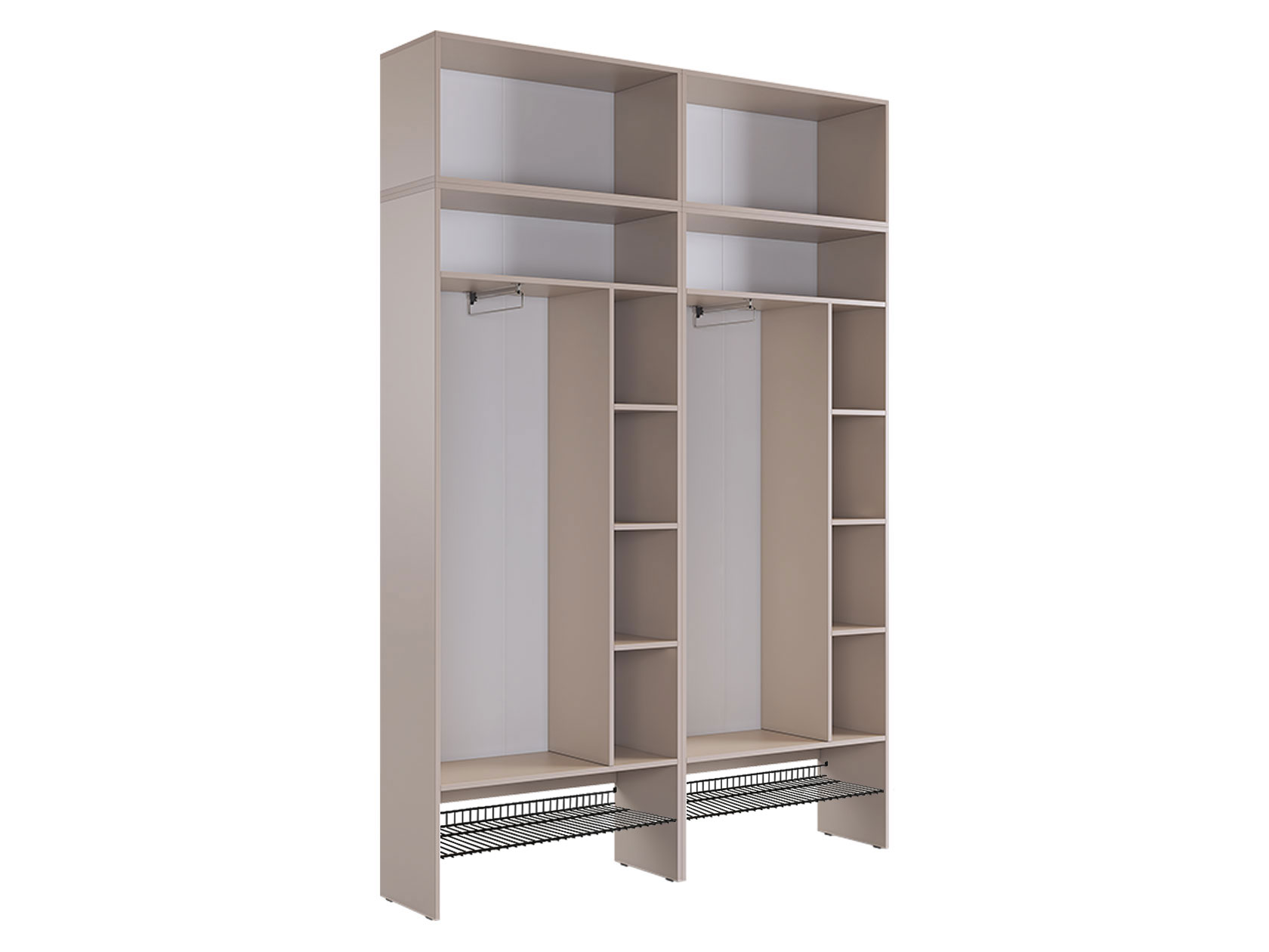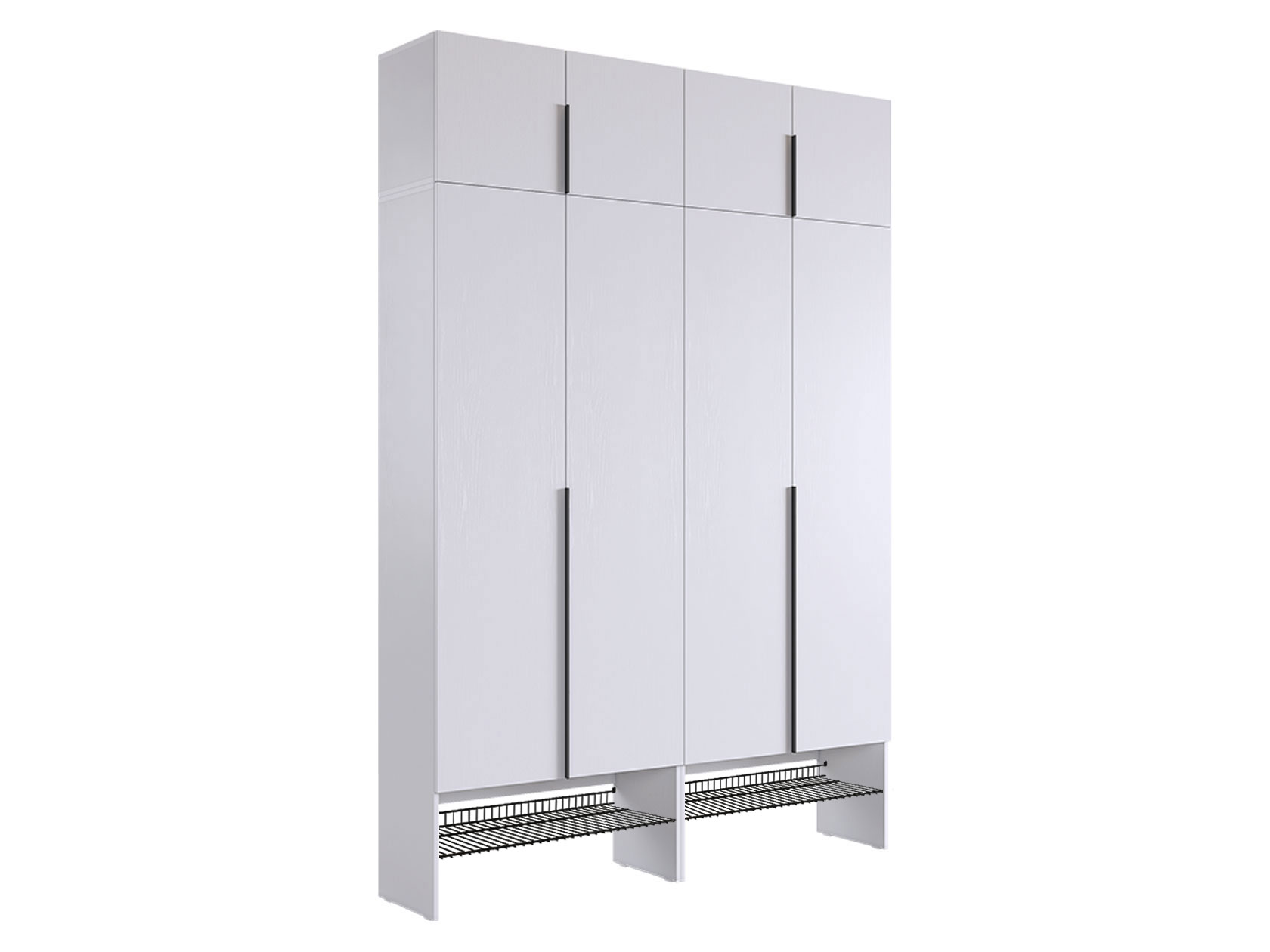 Две отдельные секции со штангами позволят разделить повседневную и верхнюю одежду. На антресолях удобно расположить коробки и вещи, которыми пользуются редко. Дизайн с гладкими фасадами и лаконичными ручками сочетается с разными стилями интерьера.
