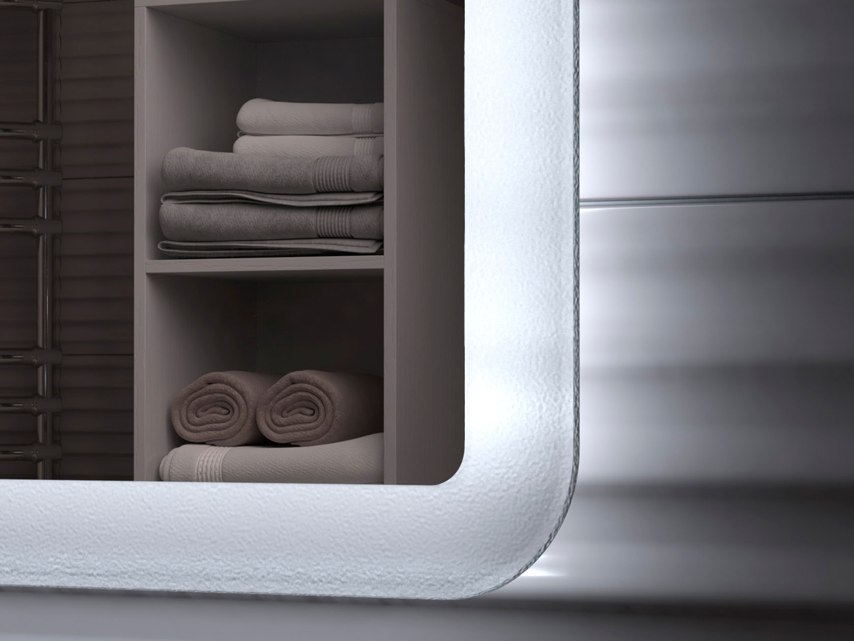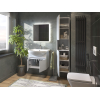 Навесные тумба под раковину и шкаф помогут поддерживать порядок и обеспечат аккуратное хранение косметики, уходовых и моющих средств. LED-зеркало с подсветкой добавит интерьеру утонченности. Гладкие фасады без ручек устойчивы к влаге и нетребовательны в уходе.