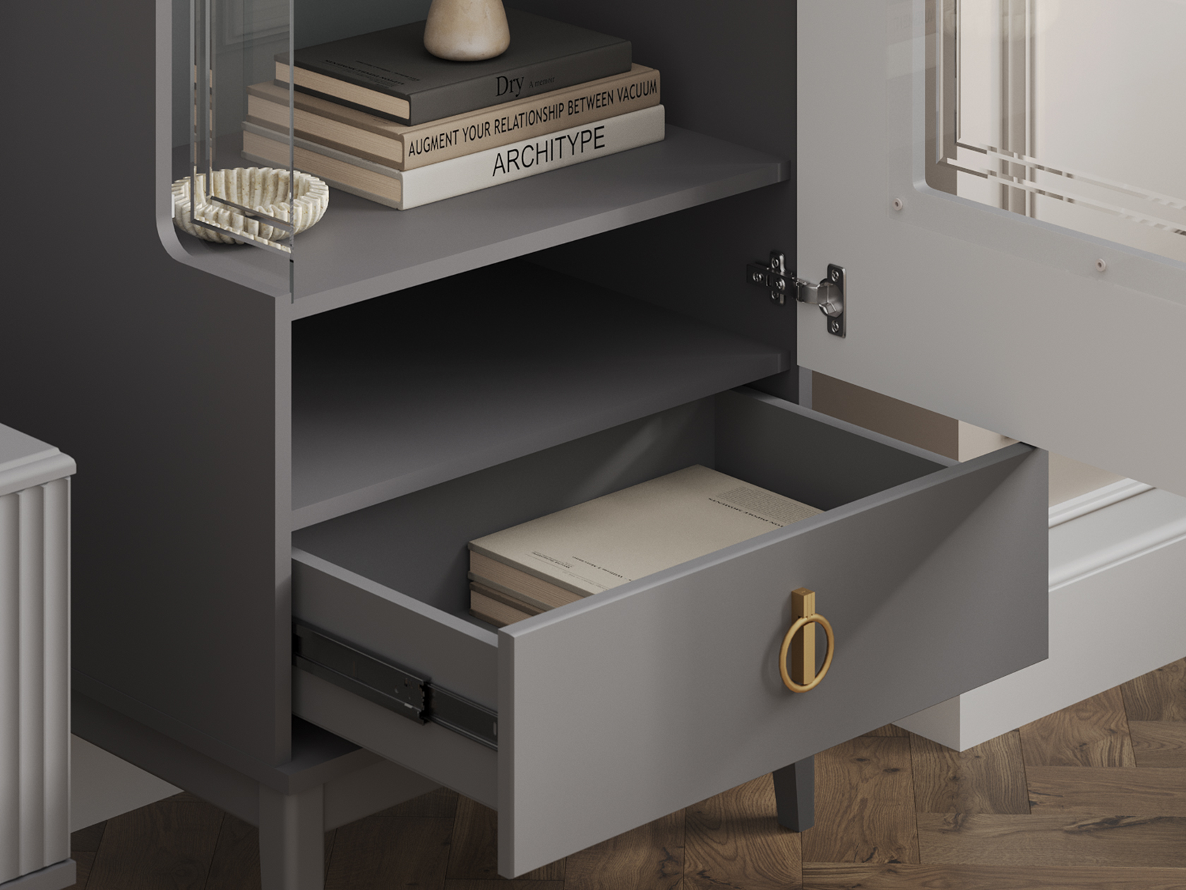 Такой дизайн привлекает внимание в любом интерьере. Модель идеально подходит для хранения коллекционных предметов, памятных сувениров, книг и других вещей. Высокие ножки придают мебели изящность и визуальную легкость.
