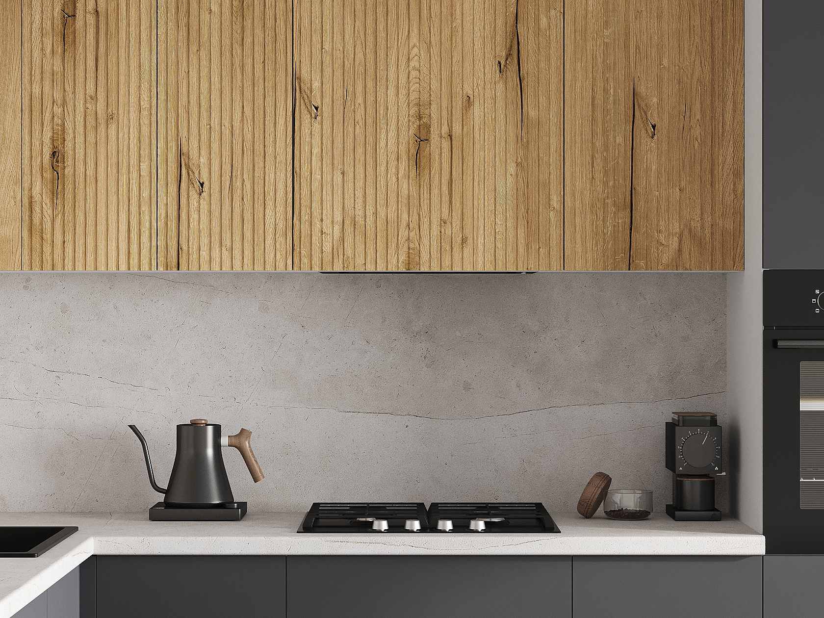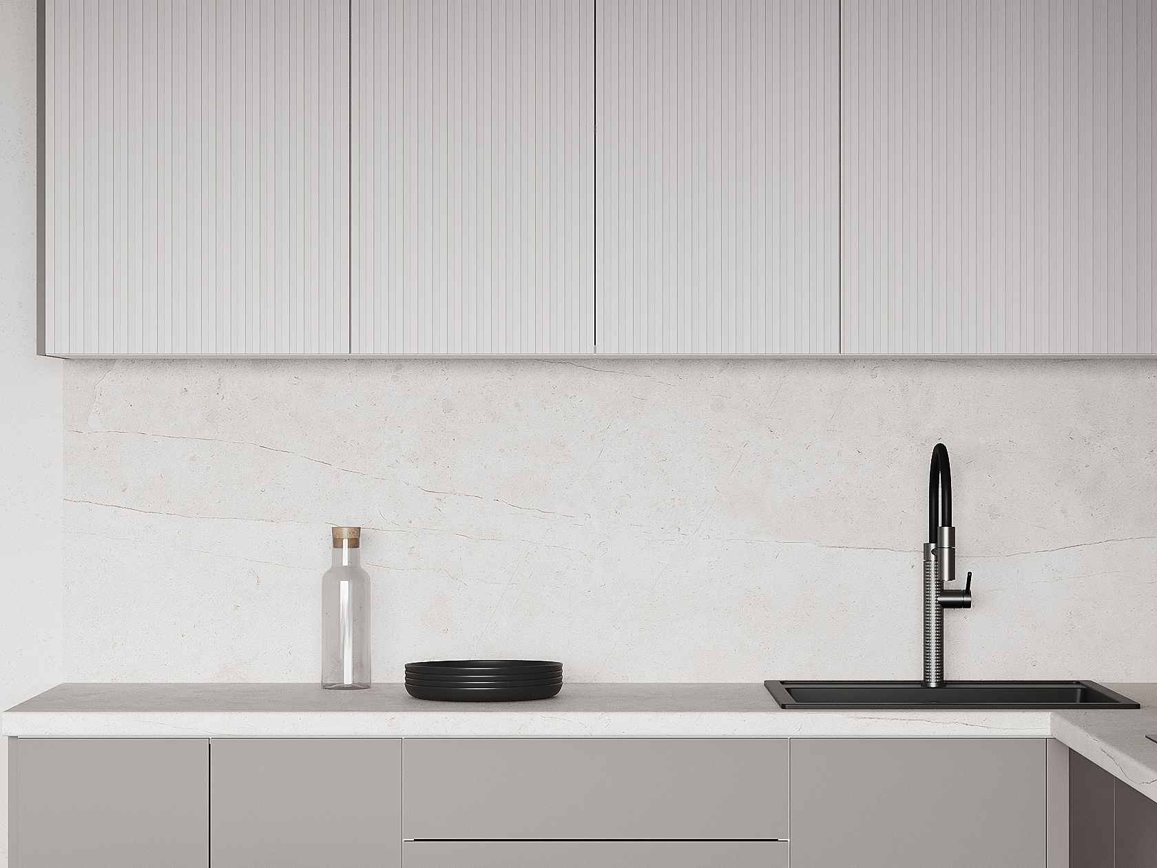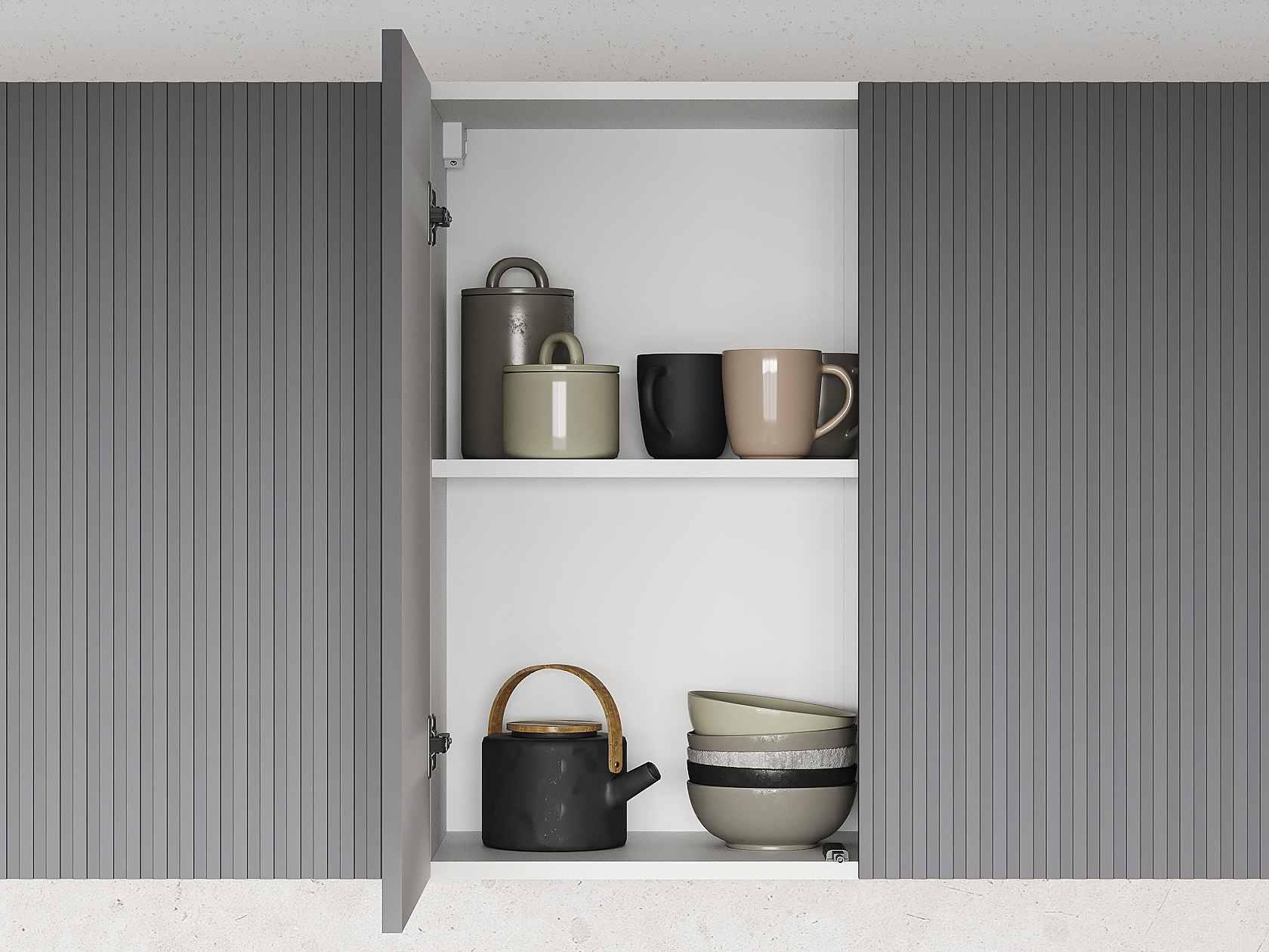В эстетичном наборе элементов всё продумано для практичного хранения посуды, продуктов и различной утвари. Матовые фасады непритязательны в уходе.