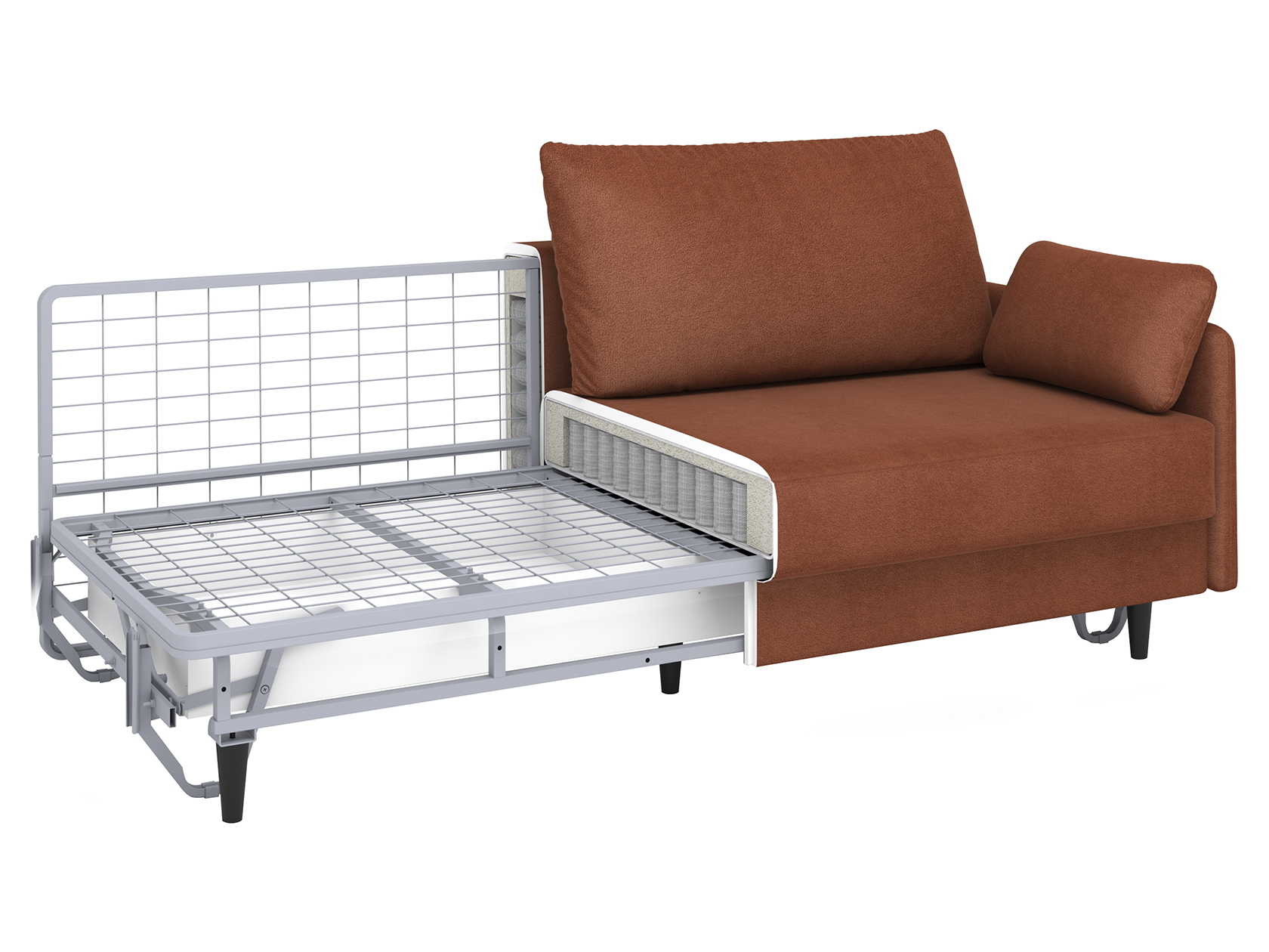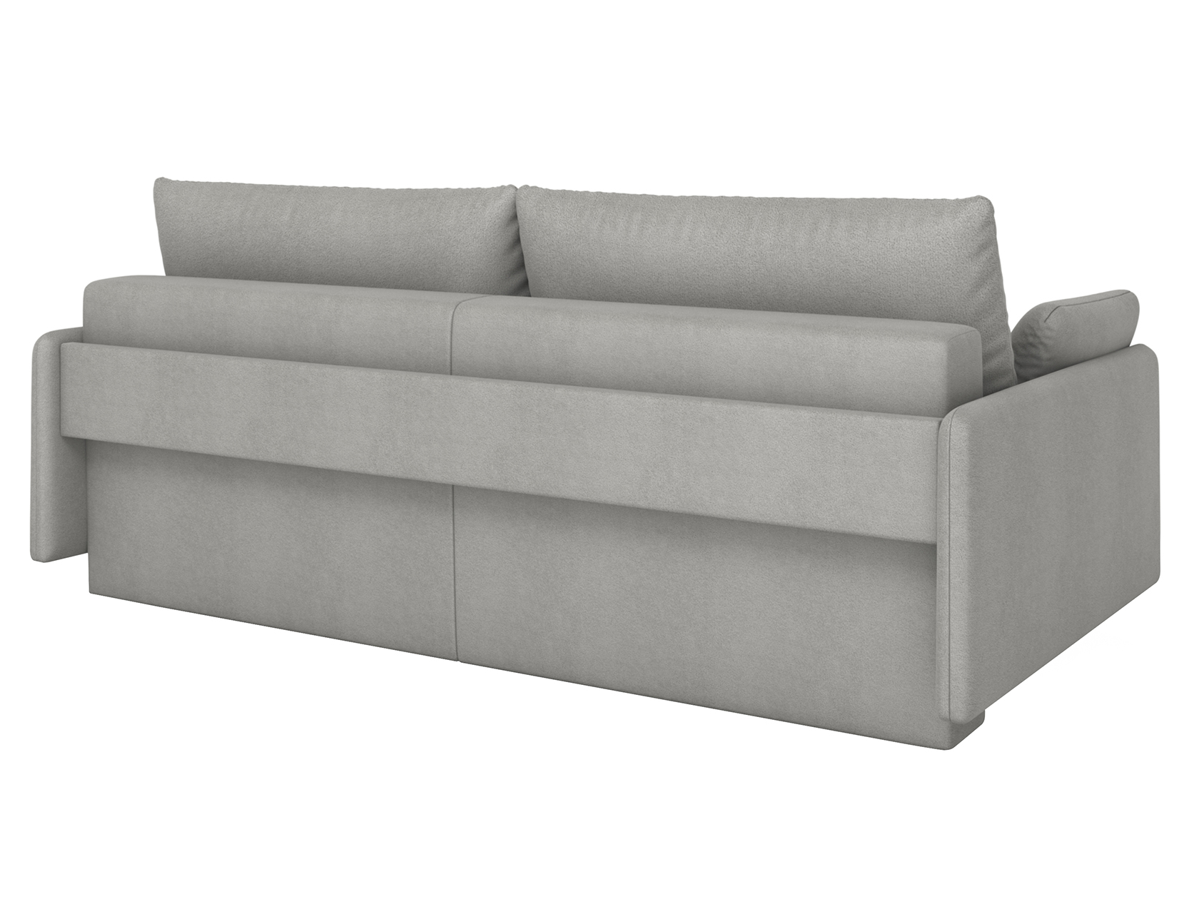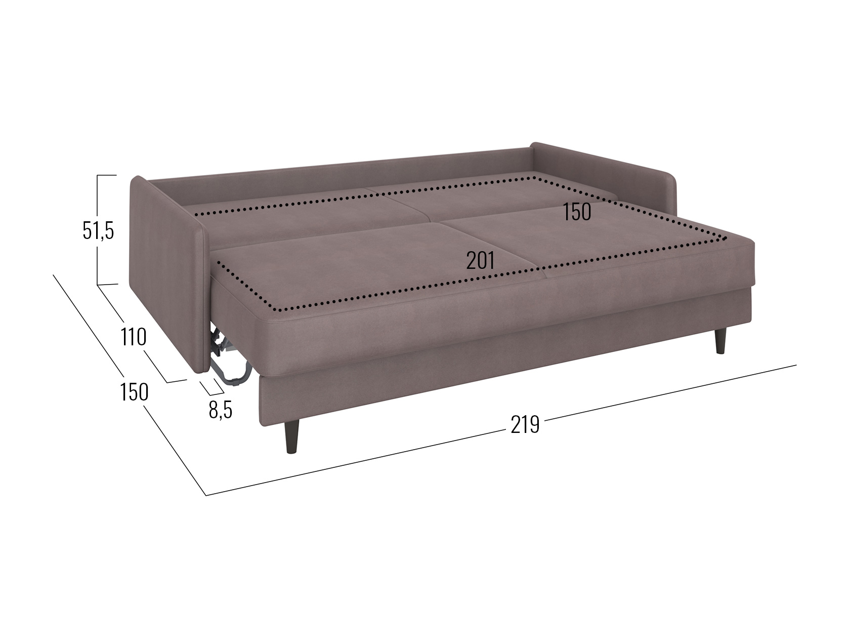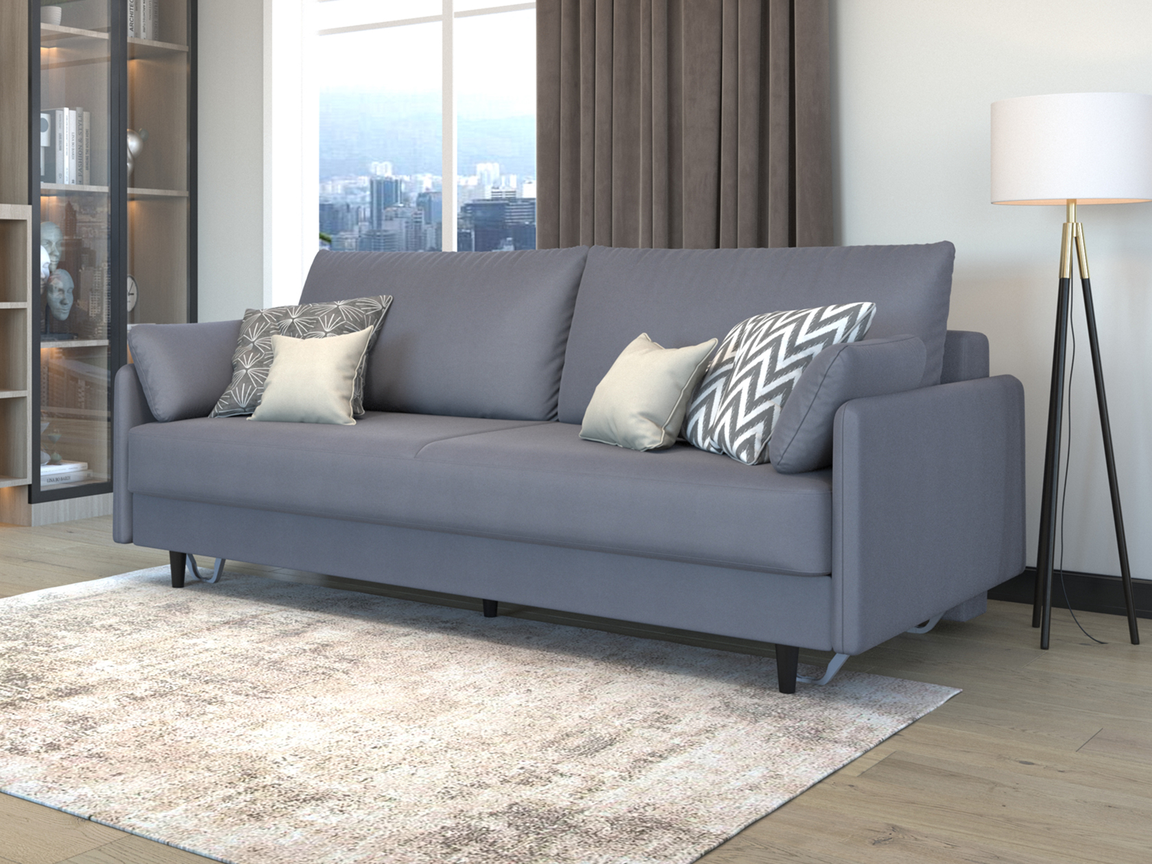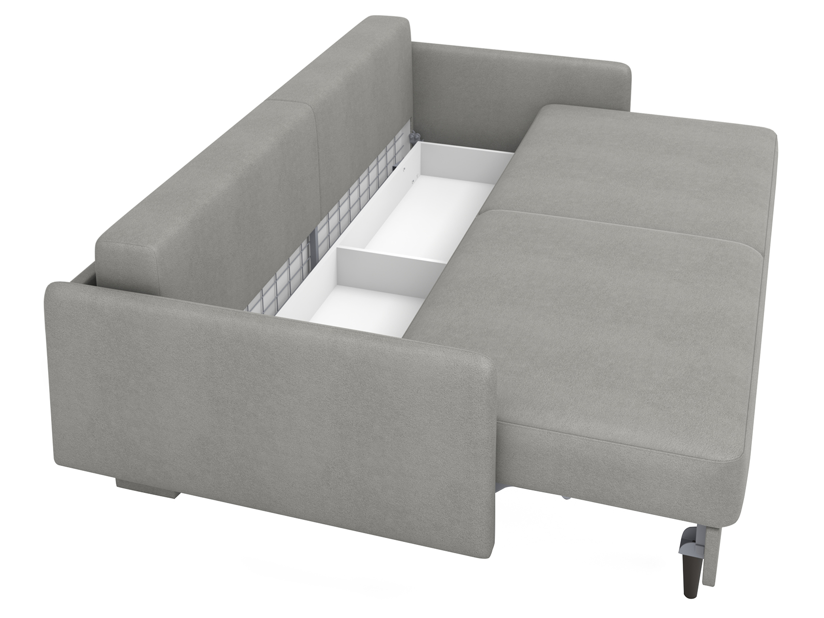 Однотонный сдержанный дизайн легко интегрировать в любой интерьер. Металлокаркас обеспечивает надежность и долговечность конструкции. Съемный чехол упрощает уход за обивкой, а удобный механизм помогает быстро трансформировать модель в ровное спальное место. Встроенный короб для белья добавляет практичности, а высокие ножки придают мебели визуальную легкость.