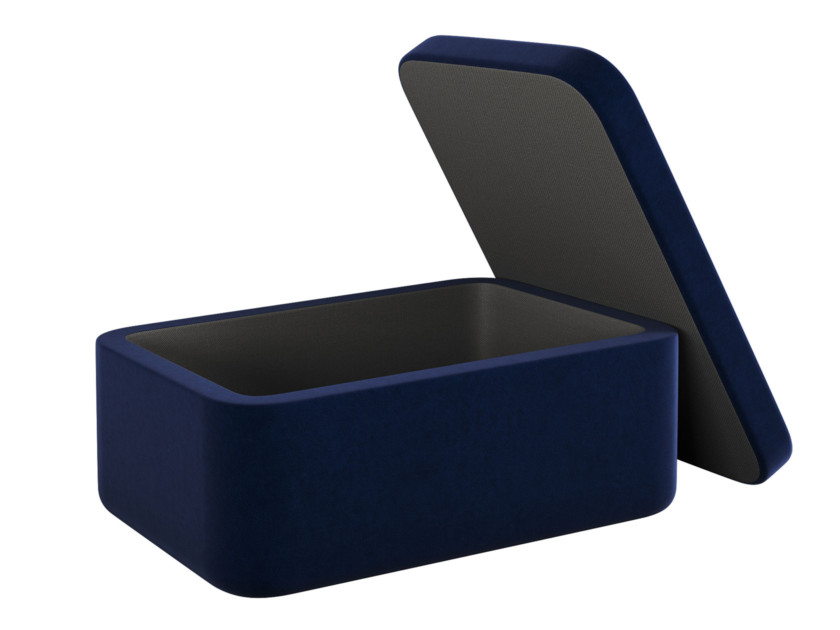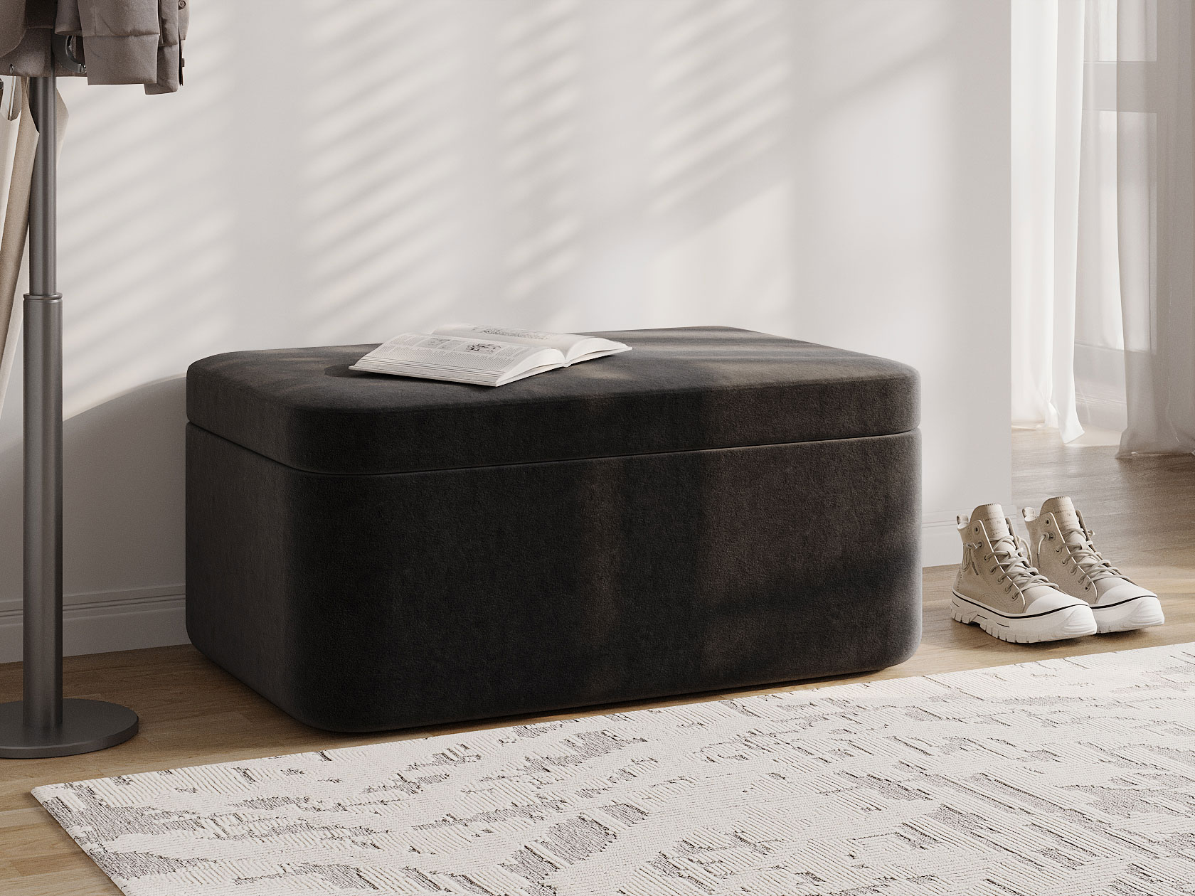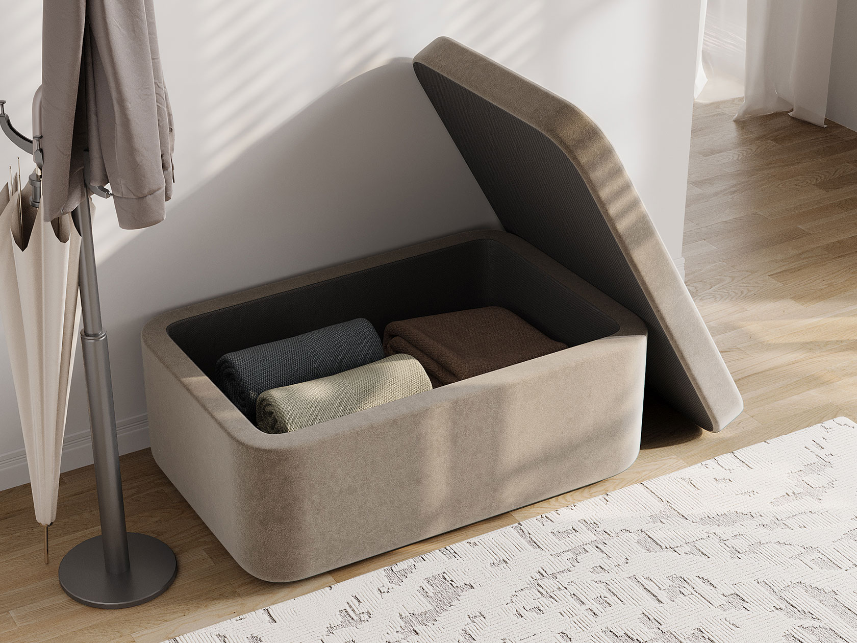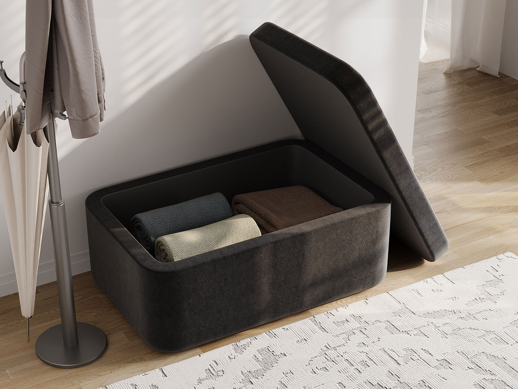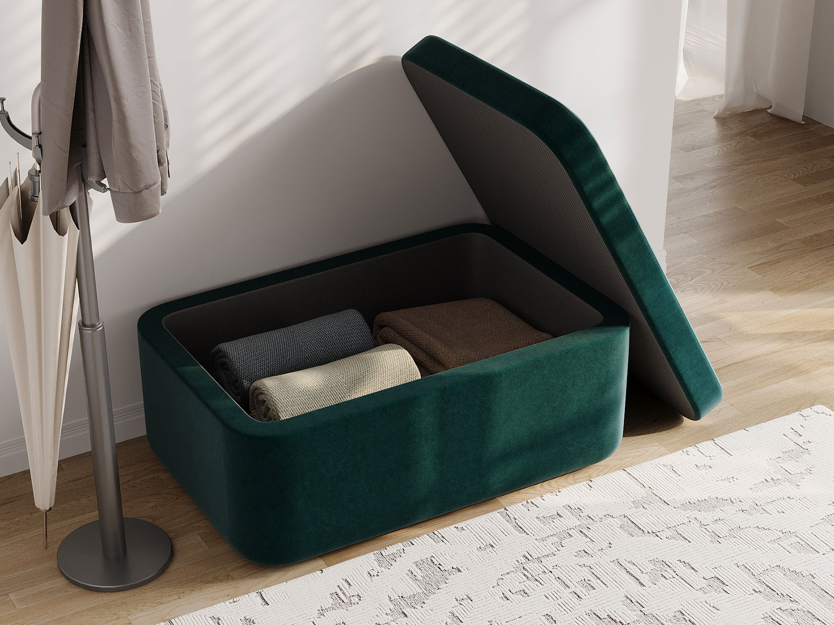 Модель может стать ярким акцентом обстановки или поддержать палитру другой мягкой мебели. Ящик внутри — идеальное место для хранения пледов, сезонных аксессуаров и различных мелочей.
