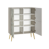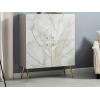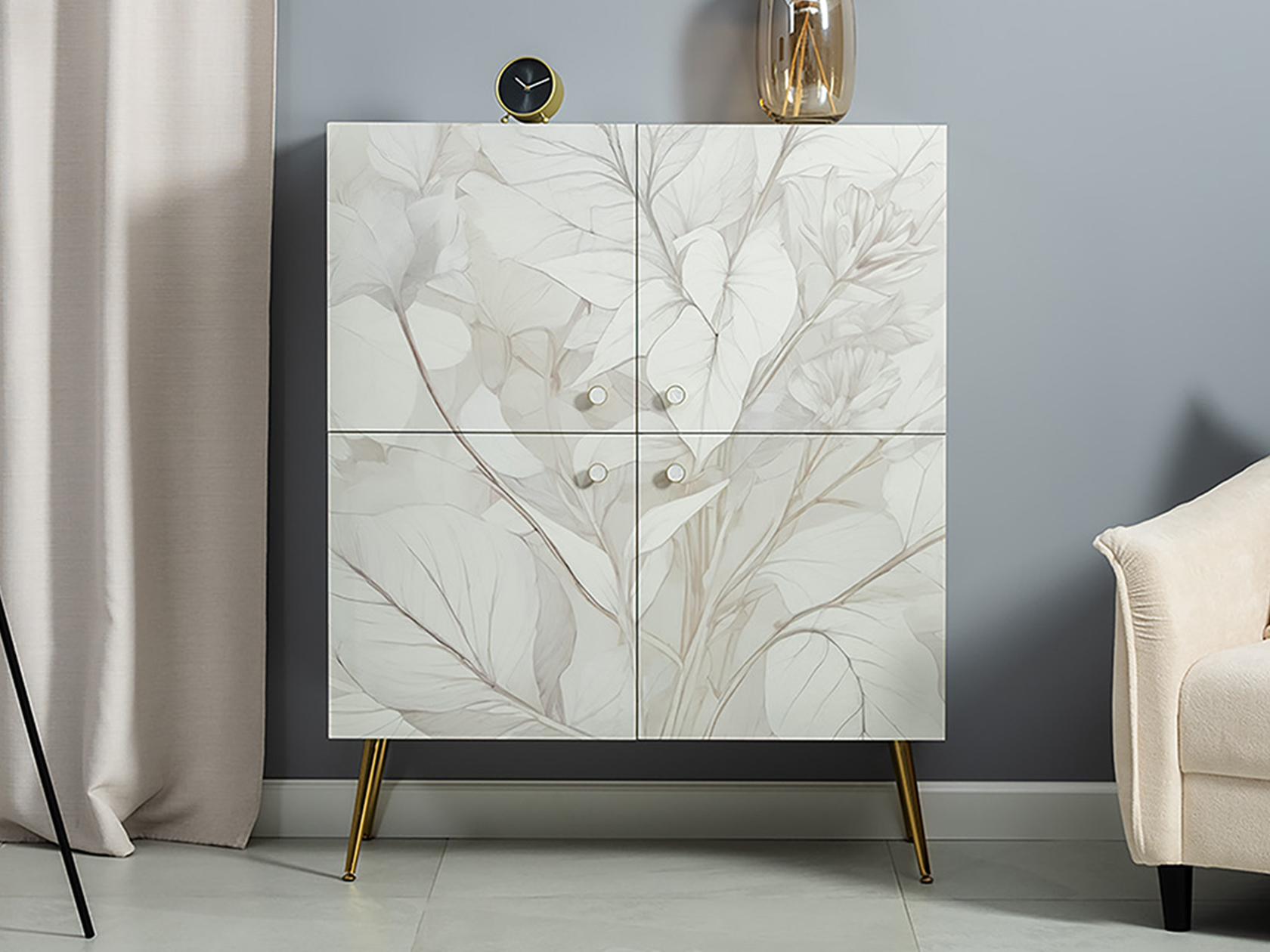Фасады с фотопечатью дополнены металлическими ручками и изящными золотистыми опорами. Такой дизайн делает модель украшением любого интерьера, а небольшие габариты позволяют разместить ее даже в ограниченном пространстве. Съемные полки можно устанавливать на удобной высоте, варьируя объем секций. Демпферы и петли с доводчиком обеспечивают бесшумную эксплуатацию.
