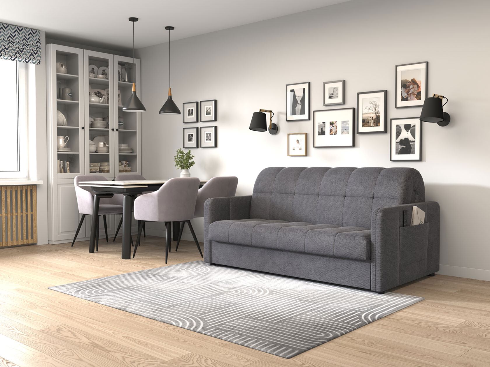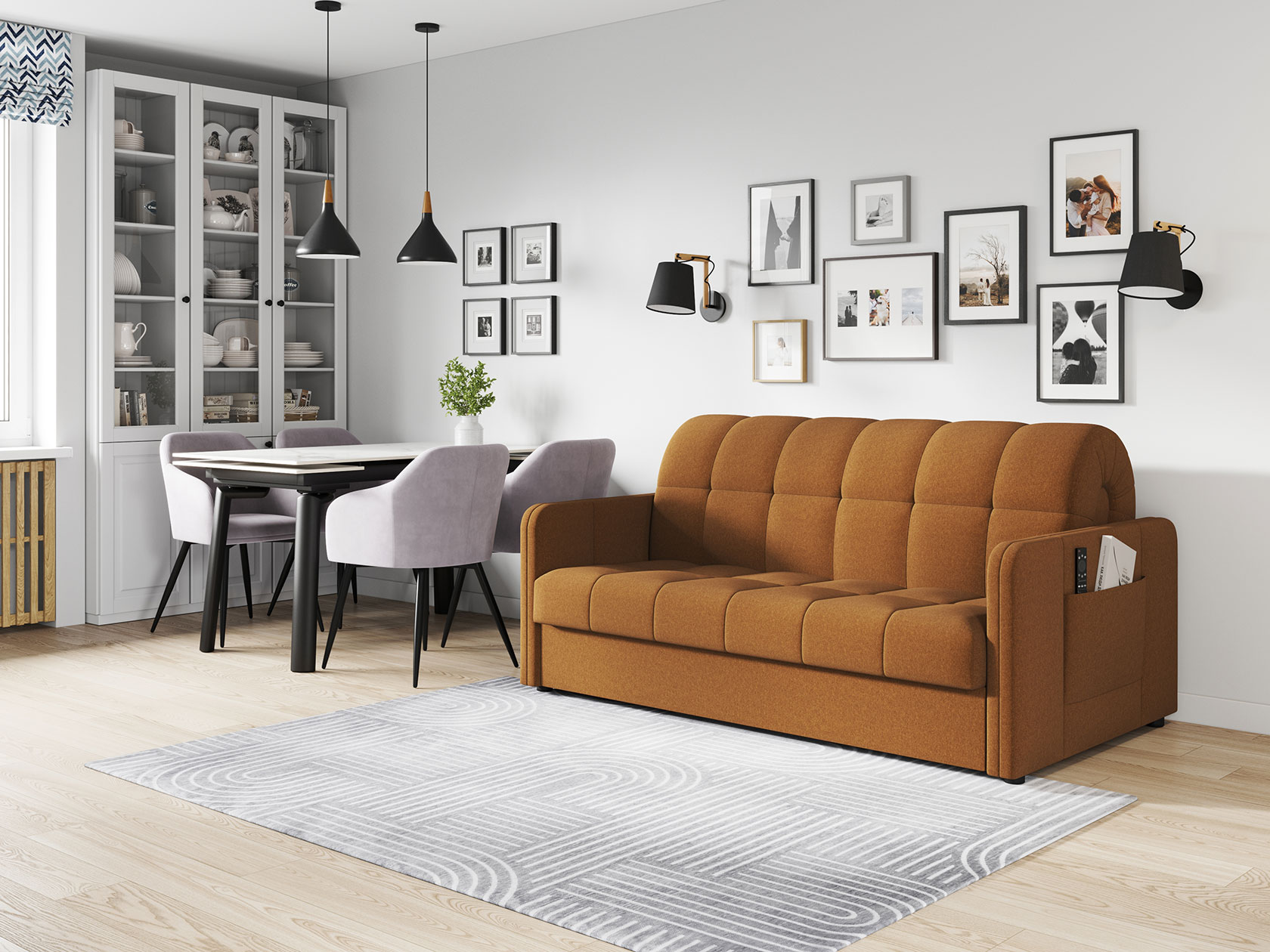 Простой и надежный механизм легко трансформирует диван в просторное спальное место. Анатомическое основание помогает расслабиться и с комфортом устроиться во время отдыха. Специальная планка защищает от контакта со стеной. Съемный чехол позволяет поддерживать чистоту обивки, своевременно очищая ткань от загрязнений.
