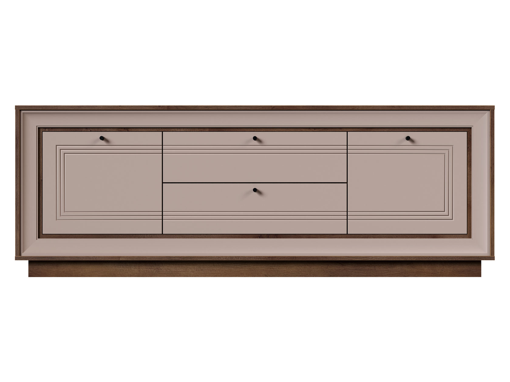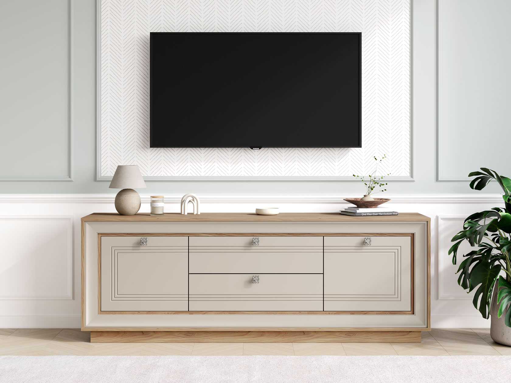 Сочетание выдвижных ящиков и закрытых полок позволяет удобно хранить личные вещи и необходимые мелочи. Лаконичные ручки и элегантная рамочная фрезеровка на фасадах добавляют мебели интересные акценты.