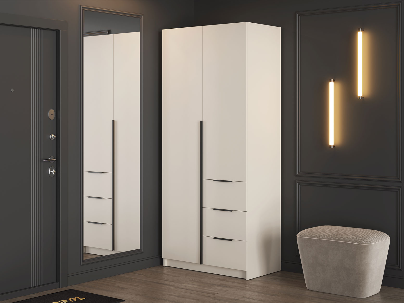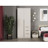 Внутри есть отделение со штангой для плечиков, а также полки, на которых можно хранить коробки, пледы и другие сезонные вещи. Ящики идеально подходят для белья или аксессуаров. Матовые фасады украшены контрастными ручками. Такой дизайн придает модели минималистичный, но при этом современный вид.