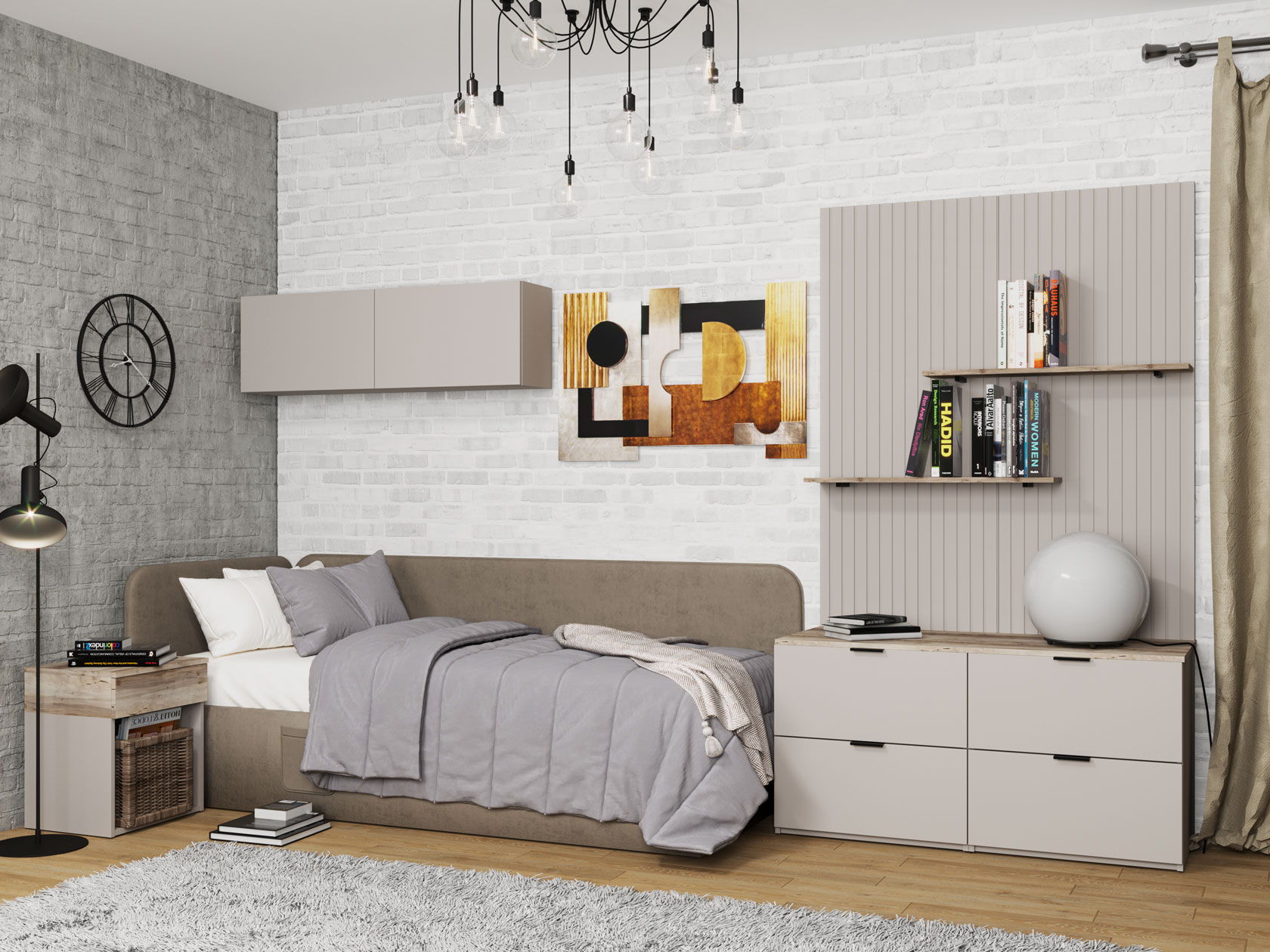 Сочетание разных текстур придает модели современный вид. На фасаде нет выступающей фурнитуры, что делает мебель более комфортной и безопасной. На поверхности можно разместить небольшой светильник, рамку с фотографией или предметы декора. Выдвижной ящик идеален для хранения различных мелочей.