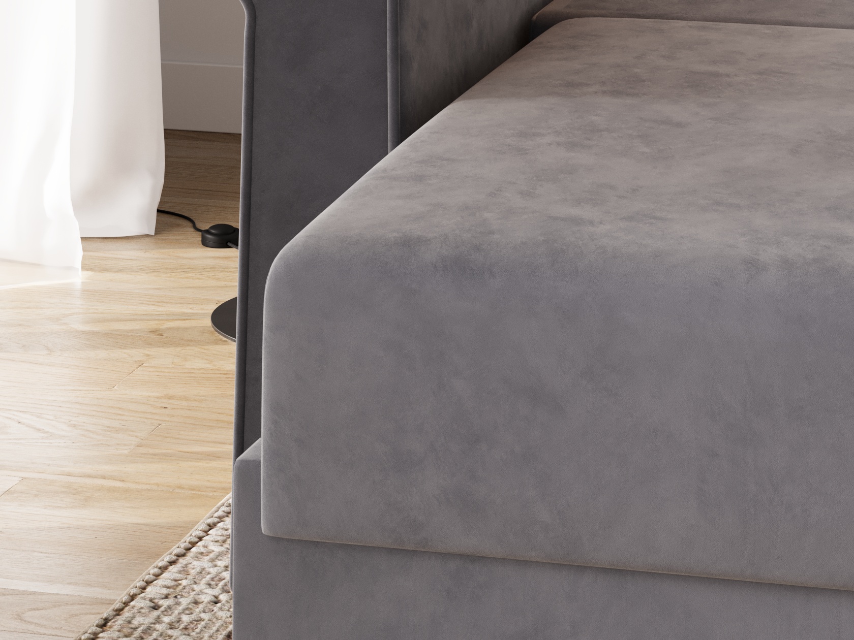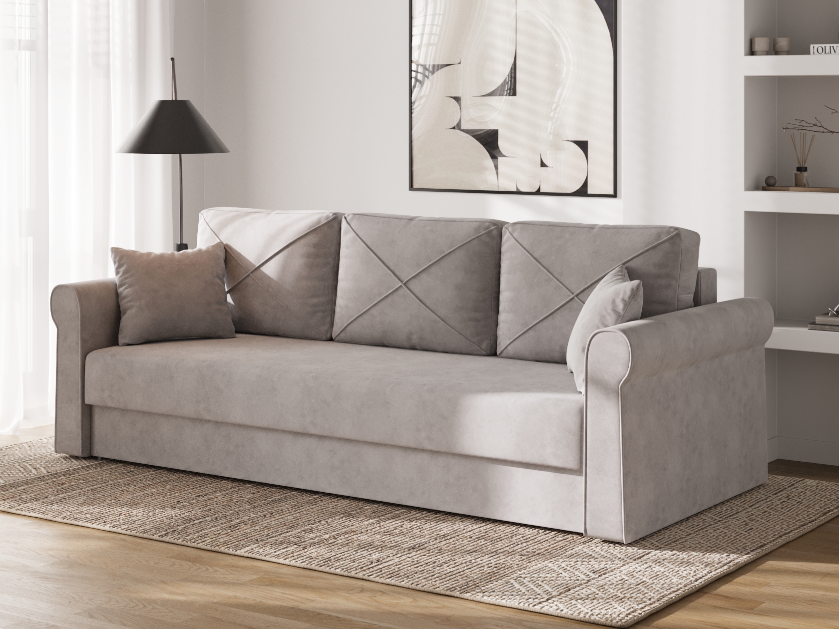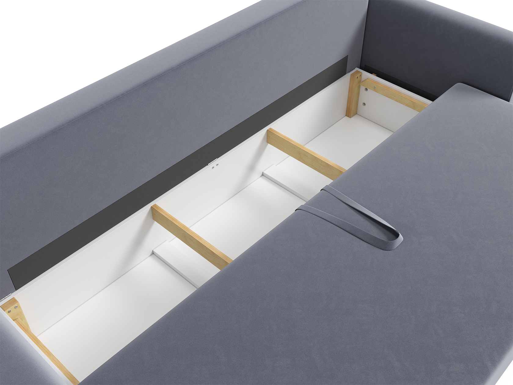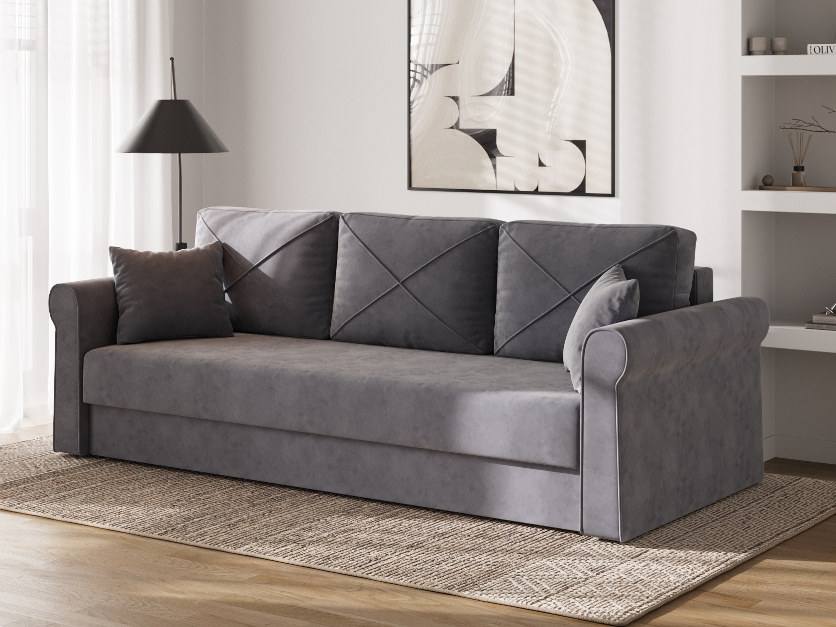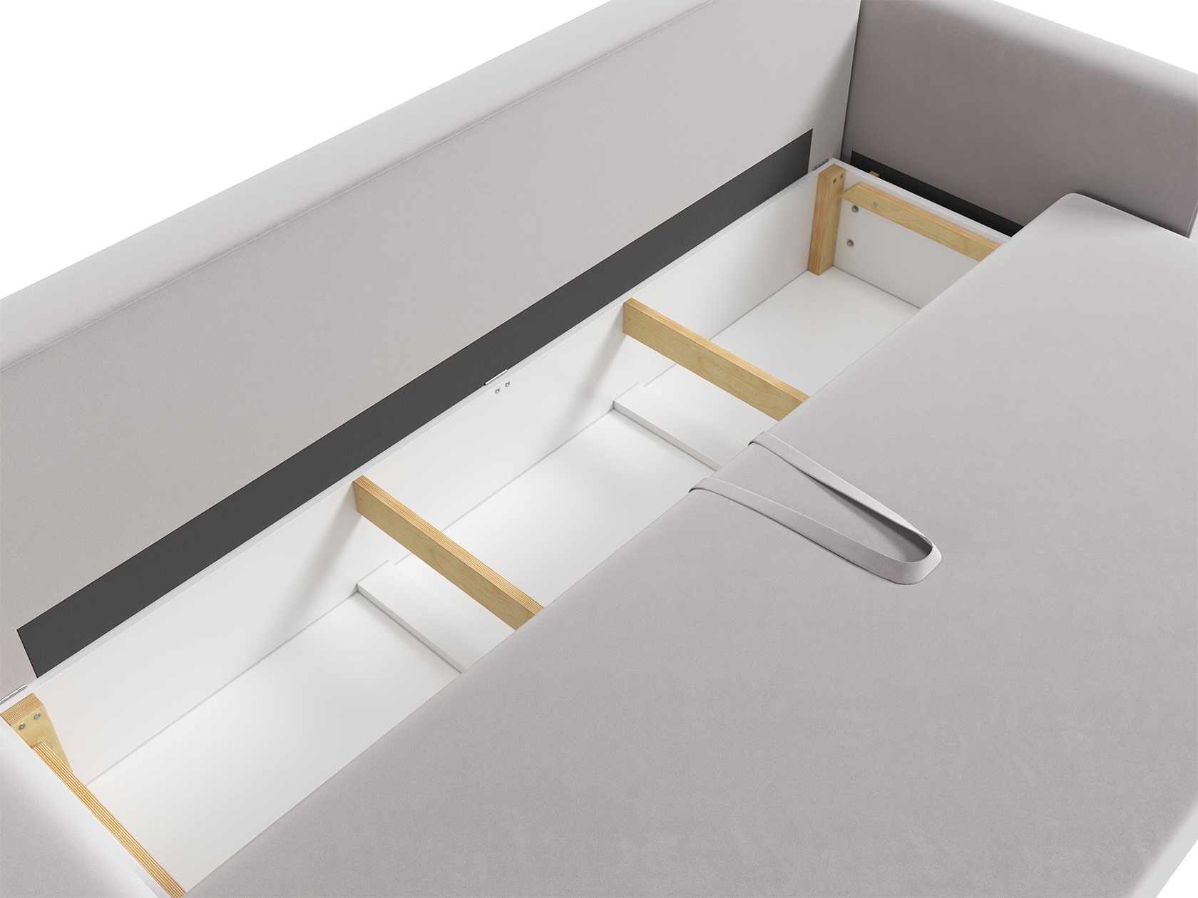 Прочный раскладной механизм подходит для ежедневной эксплуатации и быстро превращает диван в полноценную кровать. Двухсекционный бельевой короб предоставляет просторное место для хранения постельных принадлежностей. Спинка обита основной тканью, поэтому с помощью модели удобно зонировать комнату.