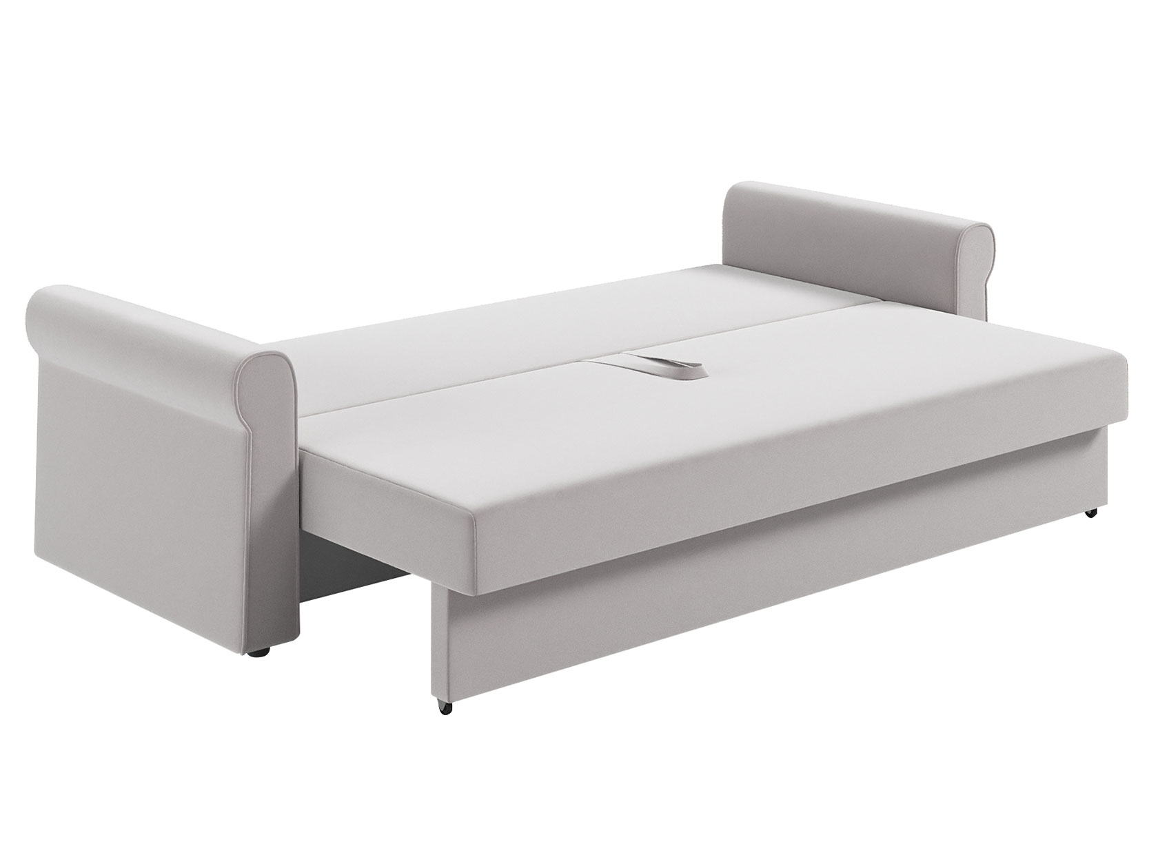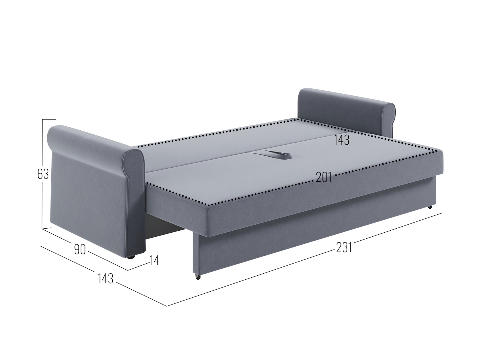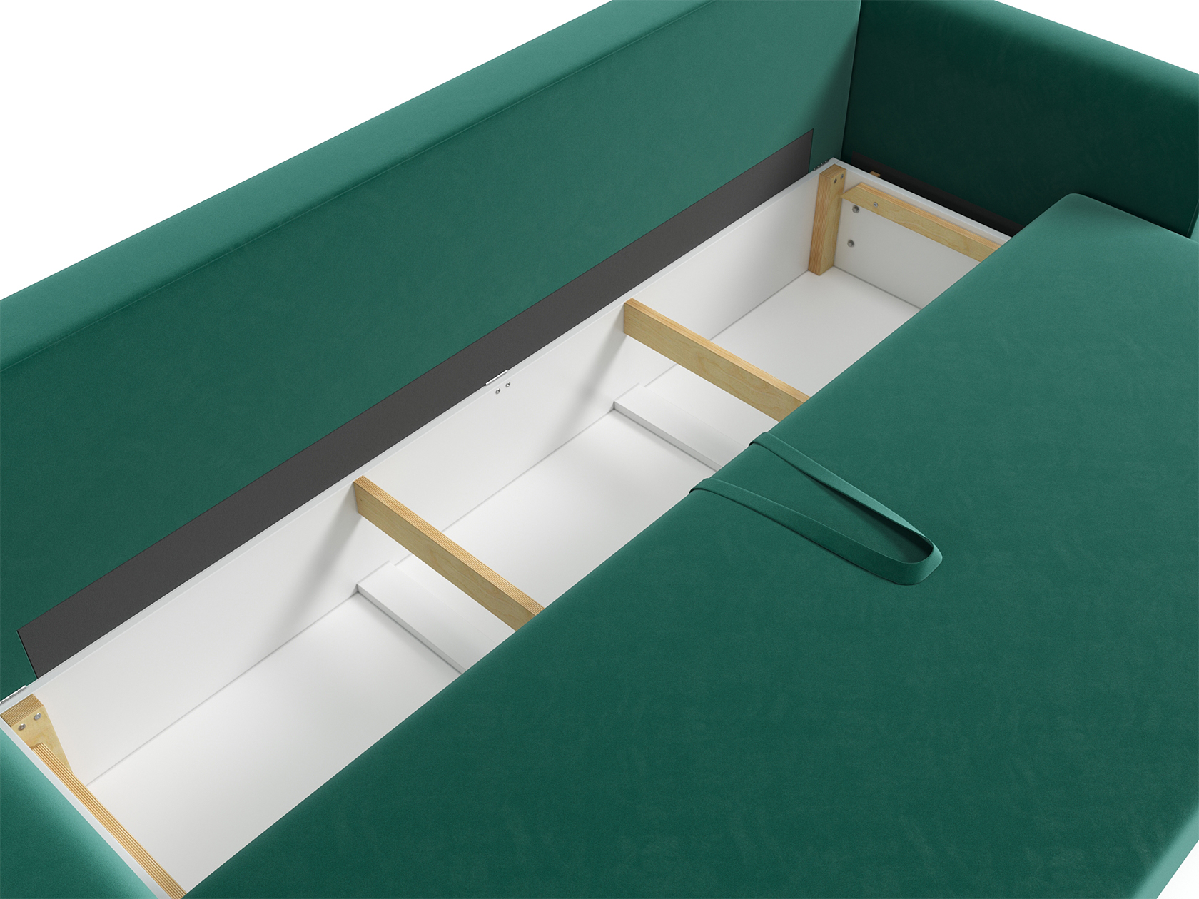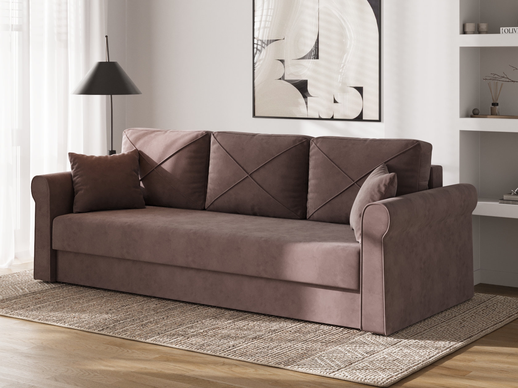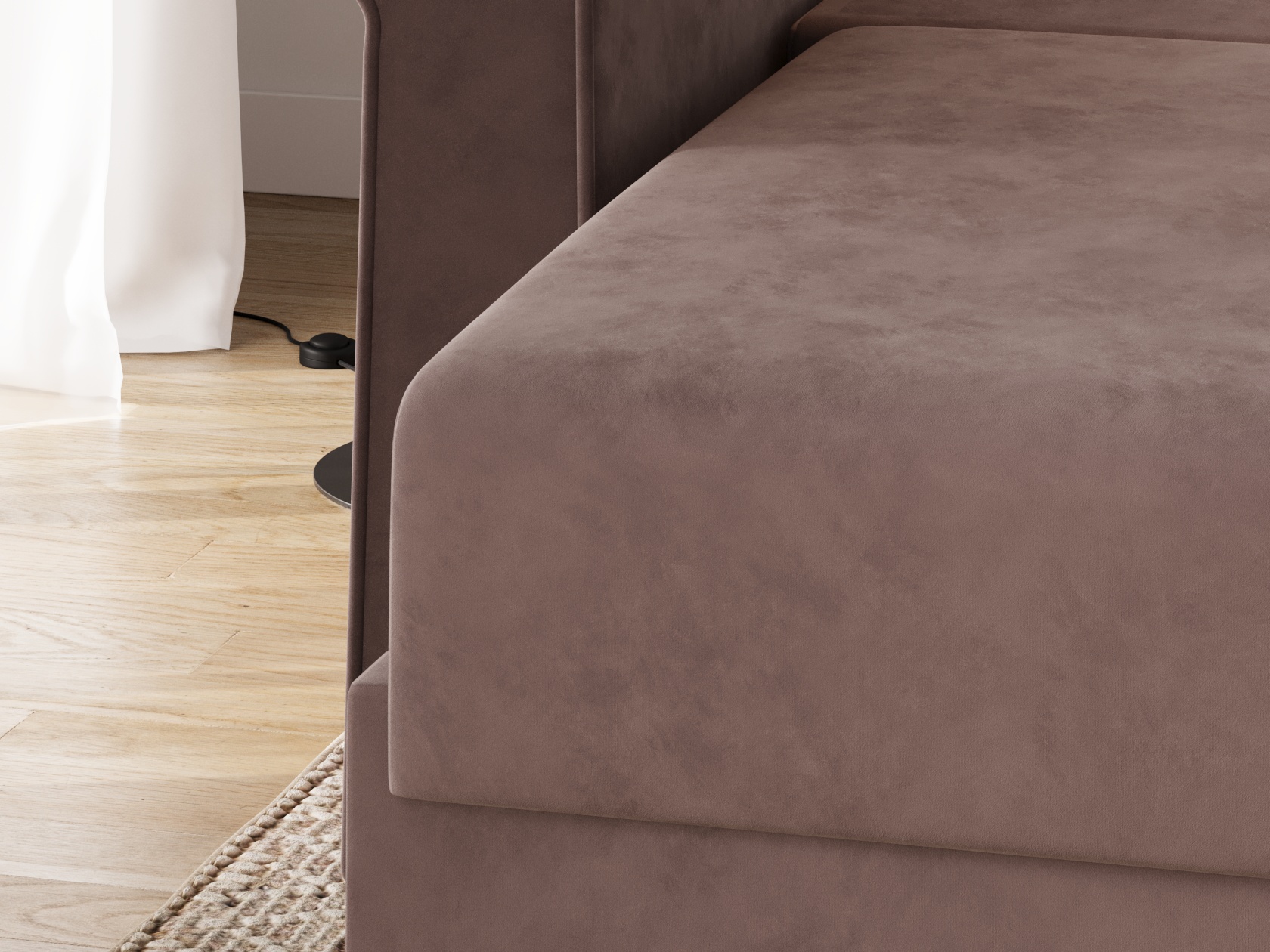 Прочный раскладной механизм подходит для ежедневной эксплуатации и быстро превращает диван в полноценную кровать. Двухсекционный бельевой короб предоставляет просторное место для хранения постельных принадлежностей. Спинка обита основной тканью, поэтому с помощью модели удобно зонировать комнату.