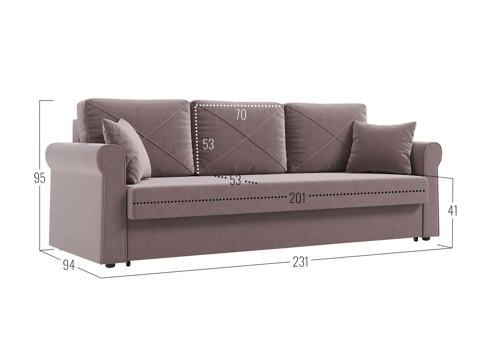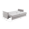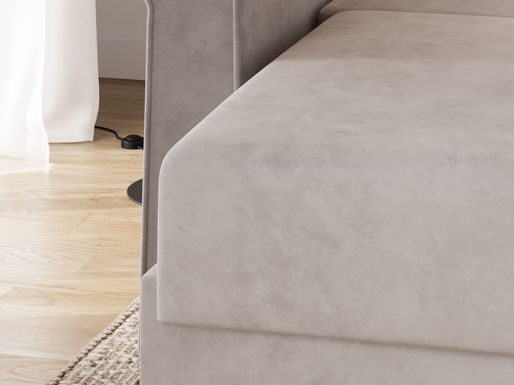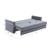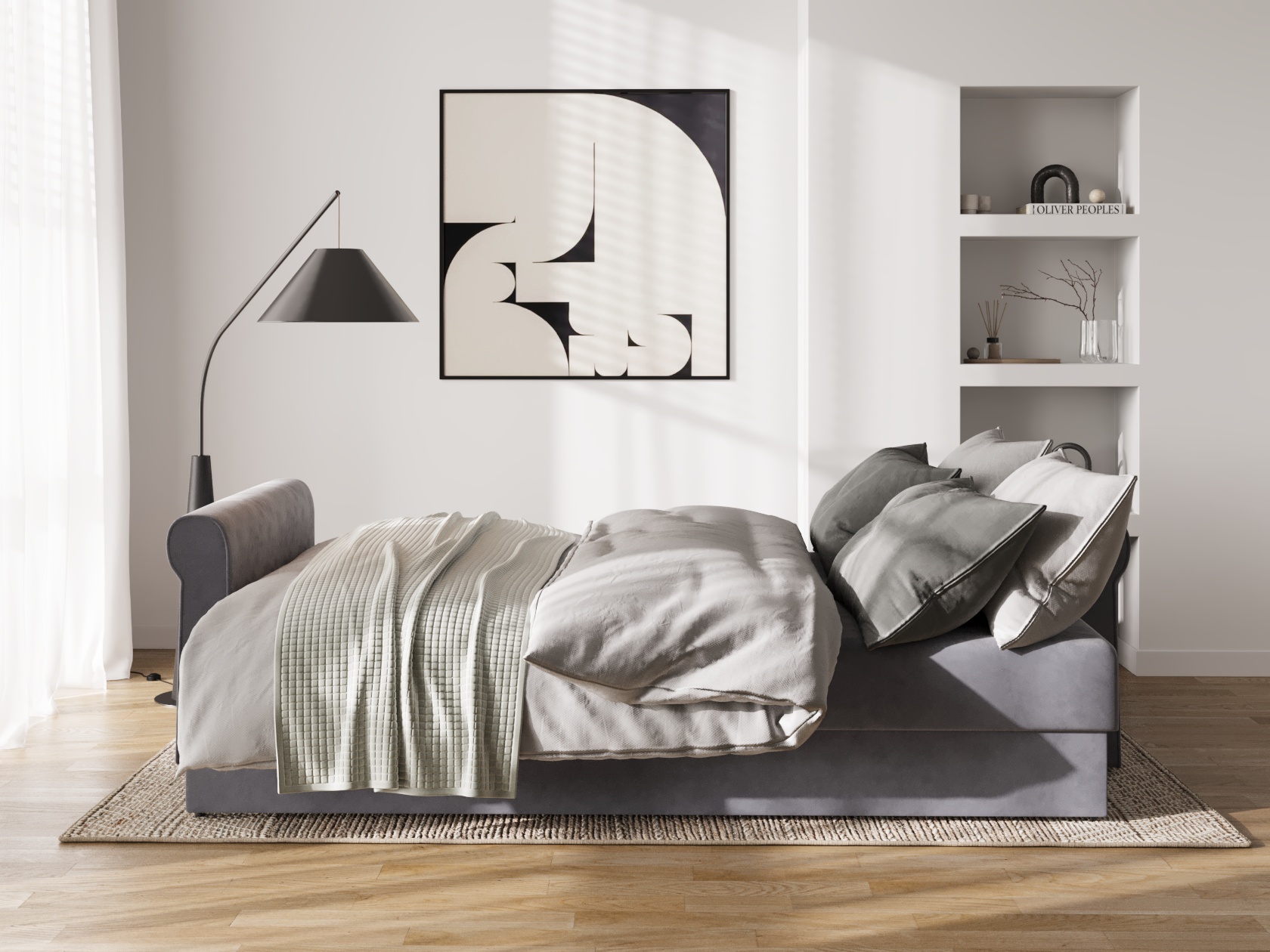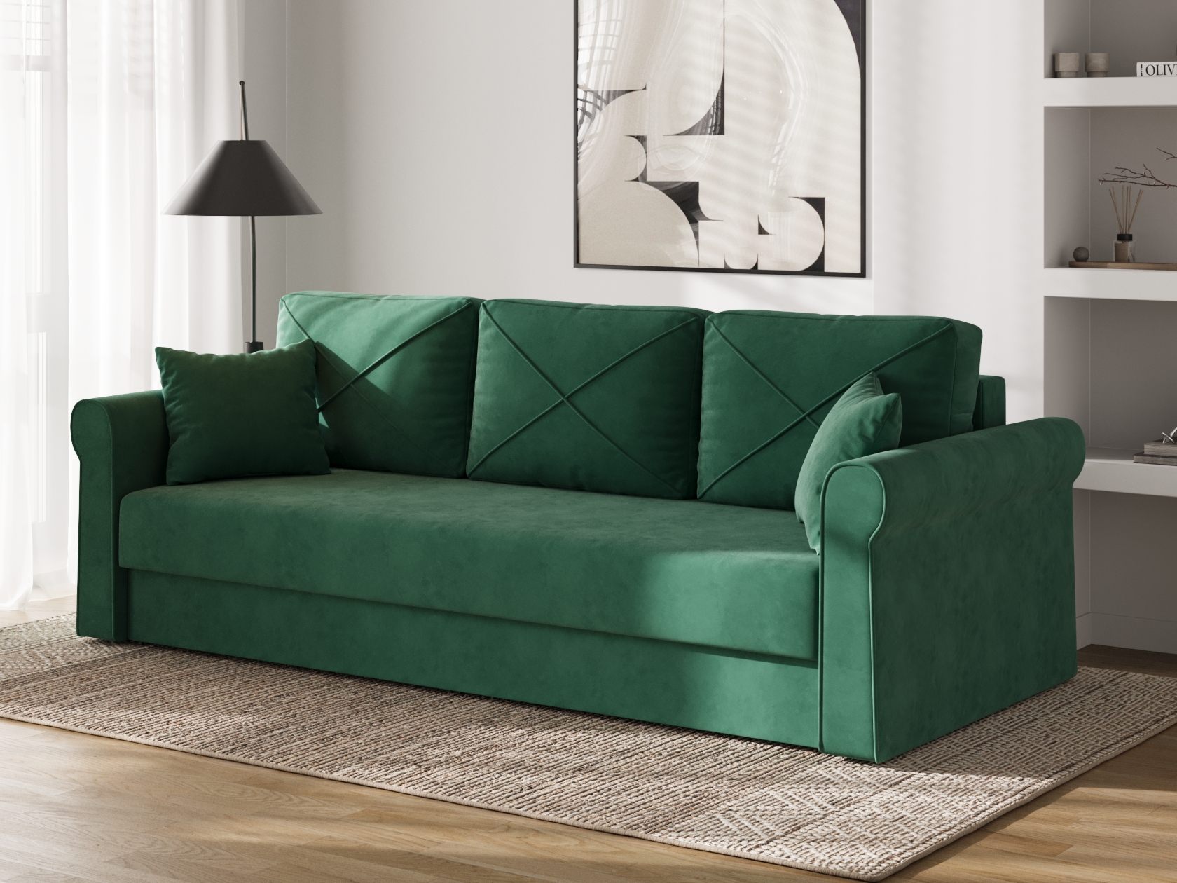 Прочный раскладной механизм подходит для ежедневной эксплуатации и быстро превращает диван в полноценную кровать. Двухсекционный бельевой короб предоставляет просторное место для хранения постельных принадлежностей. Спинка обита основной тканью, поэтому с помощью модели удобно зонировать комнату.