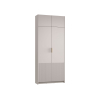 Внутри расположены две поперечные штанги, которые позволяют аккуратно развесить верхнюю и повседневную одежду любой длины. Полки удобно использовать как место для хранения обуви. Текстурированная отделка в нижней части фасадов и акцентная золотая ручка придают мебели особый шарм.