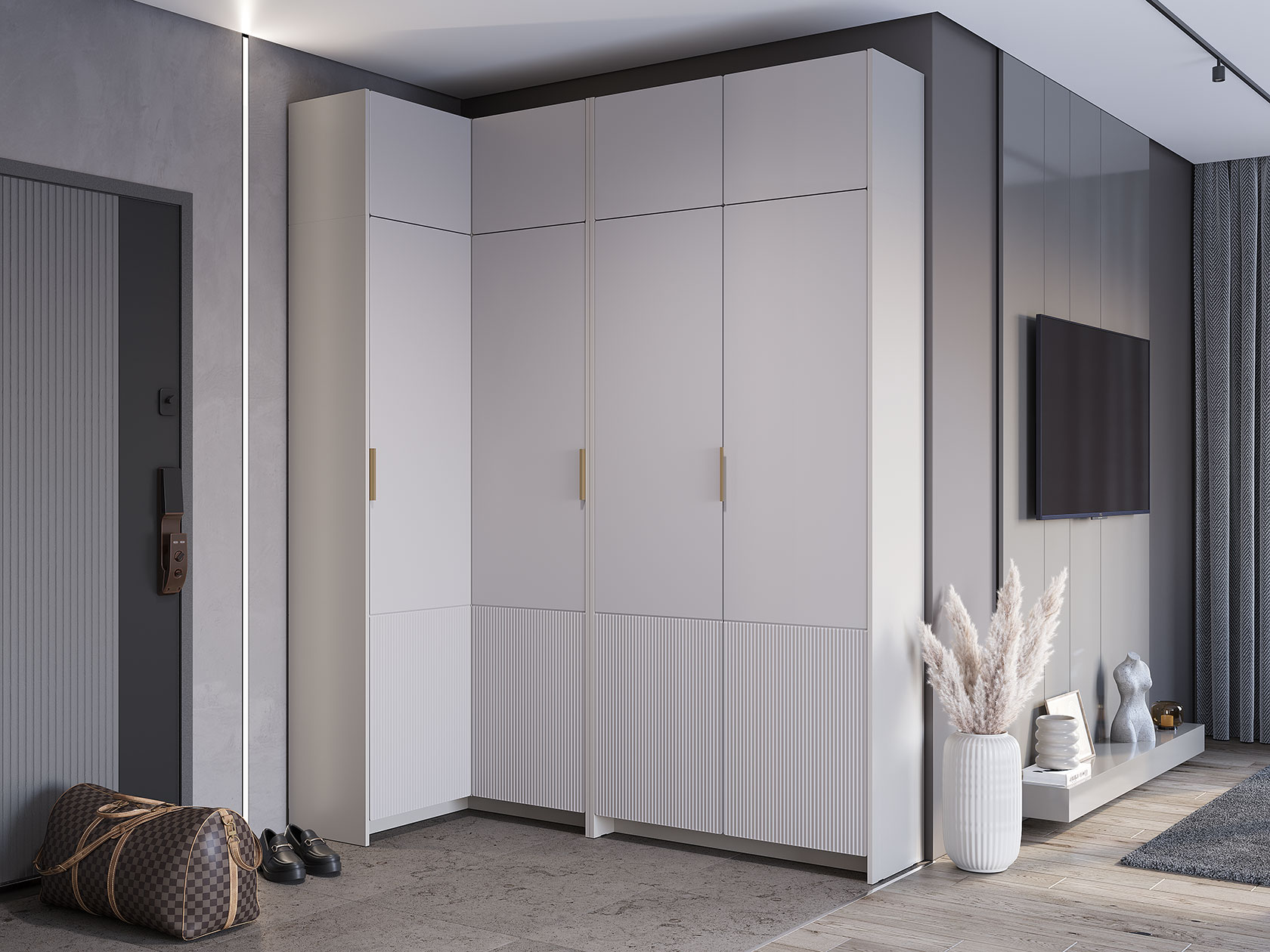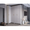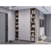 Внутри расположены две поперечные штанги, которые позволяют аккуратно развесить верхнюю и повседневную одежду любой длины. Полки удобно использовать как место для хранения обуви. Текстурированная отделка в нижней части фасадов и акцентная золотая ручка придают мебели особый шарм.