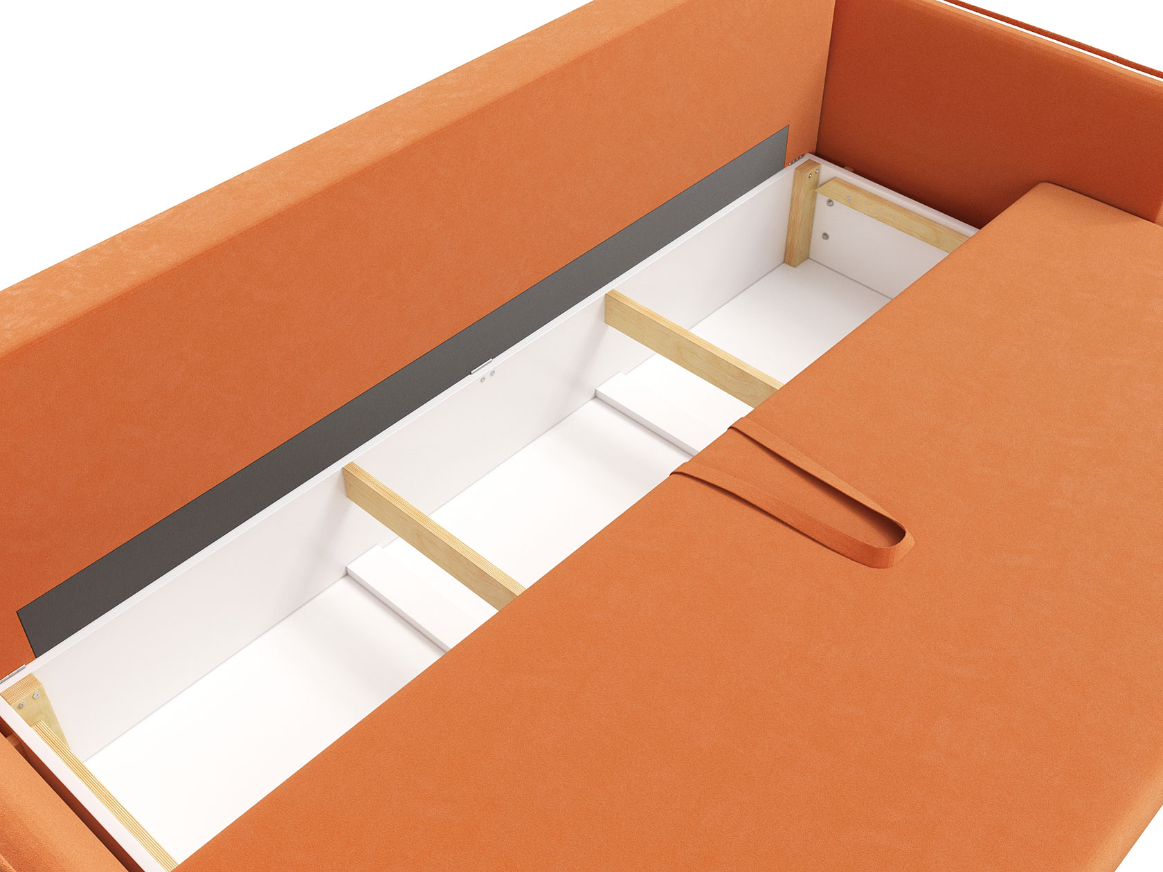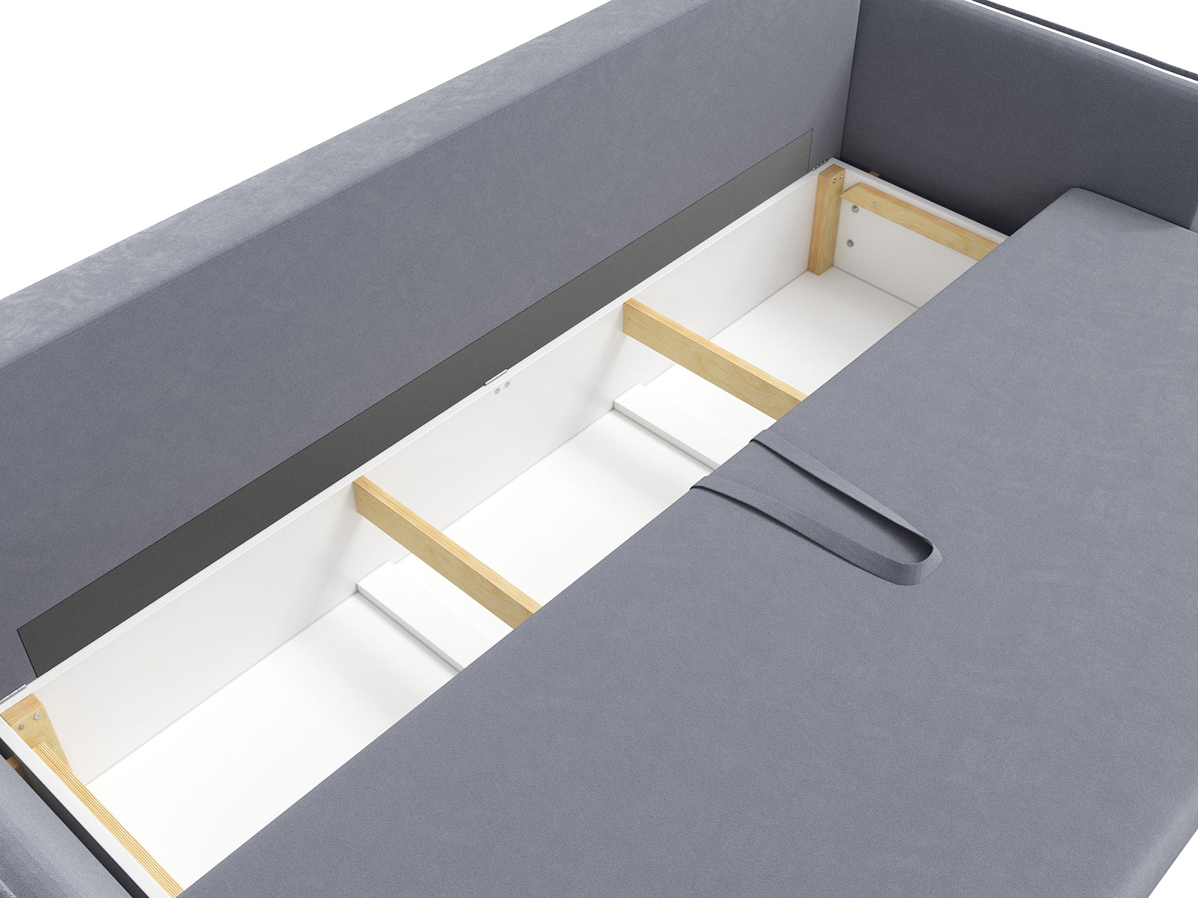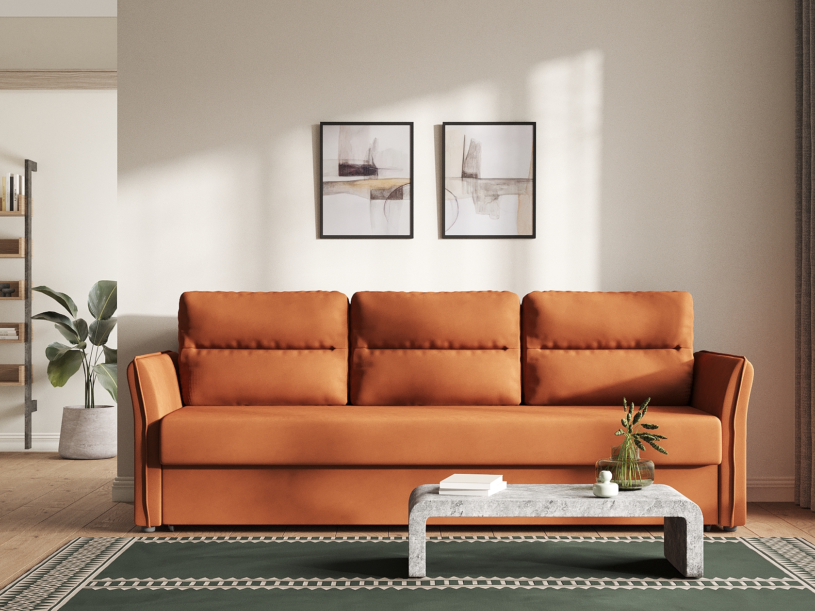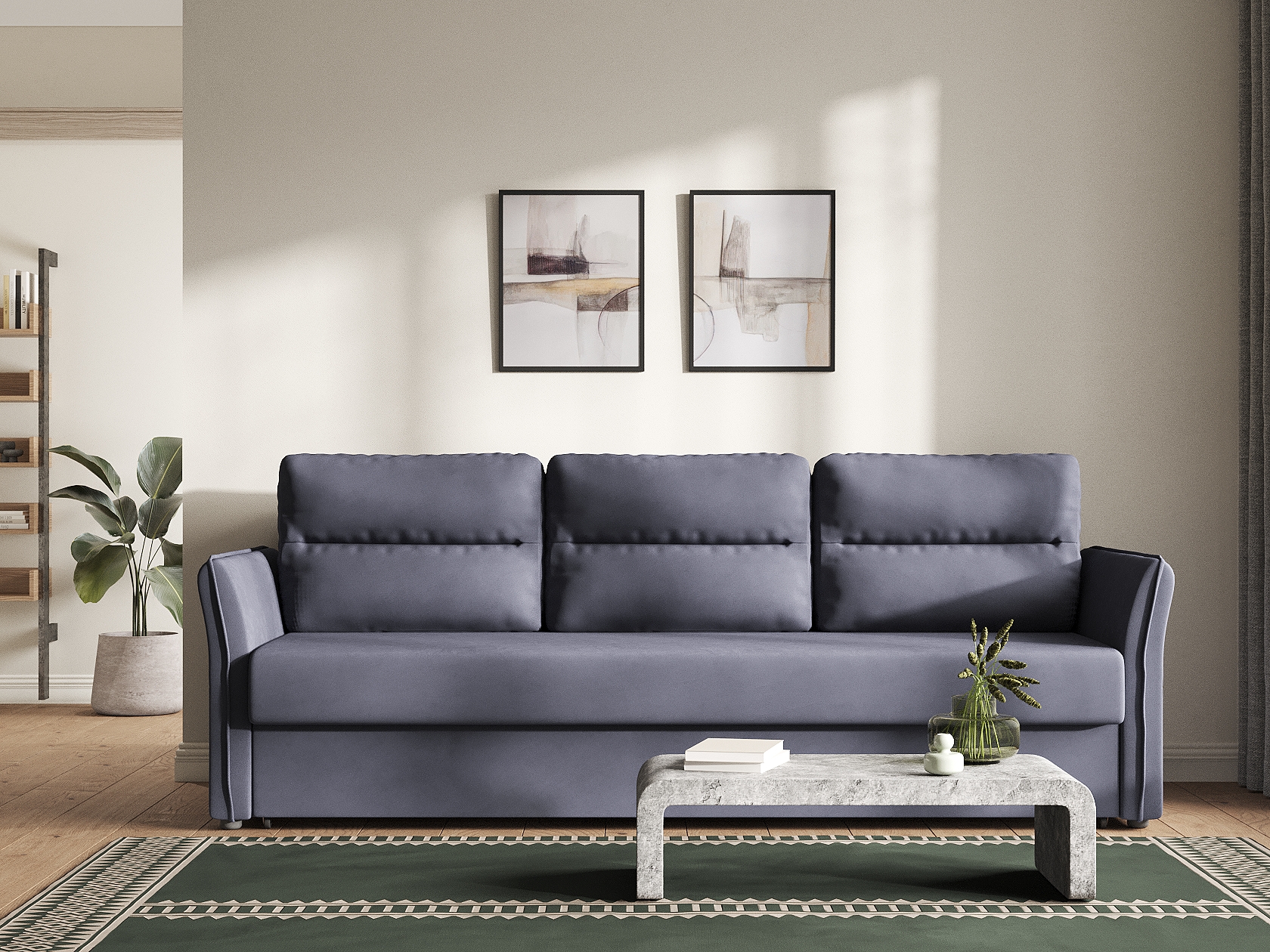 Простой и надежный механизм трансформации превращает диван в кровать, а компактный ящик для белья обеспечивает дополнительное место для хранения. Мягкая обивка приятна на ощупь и устойчива к износу. Возможность установить модель спинкой на виду — еще одно преимущество.