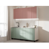 В шкафах и ящиках достаточно места для сыпучих продуктов, посуды, объемных контейнеров и небольшой бытовой техники. Фасады в верхнем ряду украшены вертикальной фрезеровкой. Отсутствие лицевой фурнитуры придает мебели сдержанный и лаконичный облик.