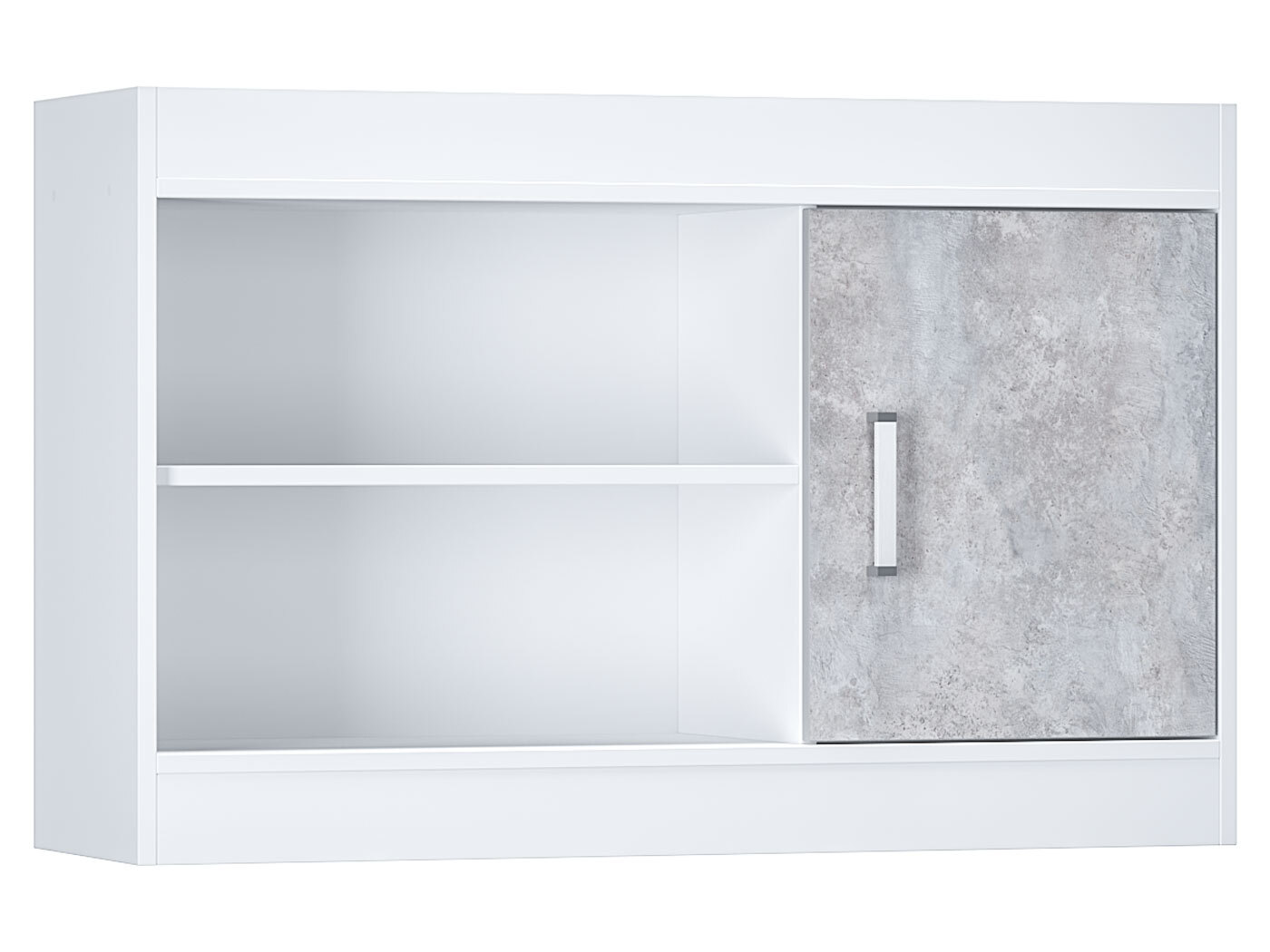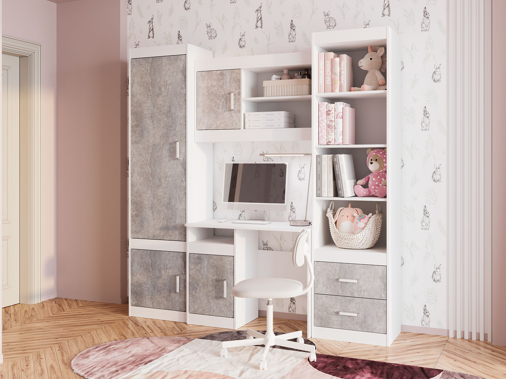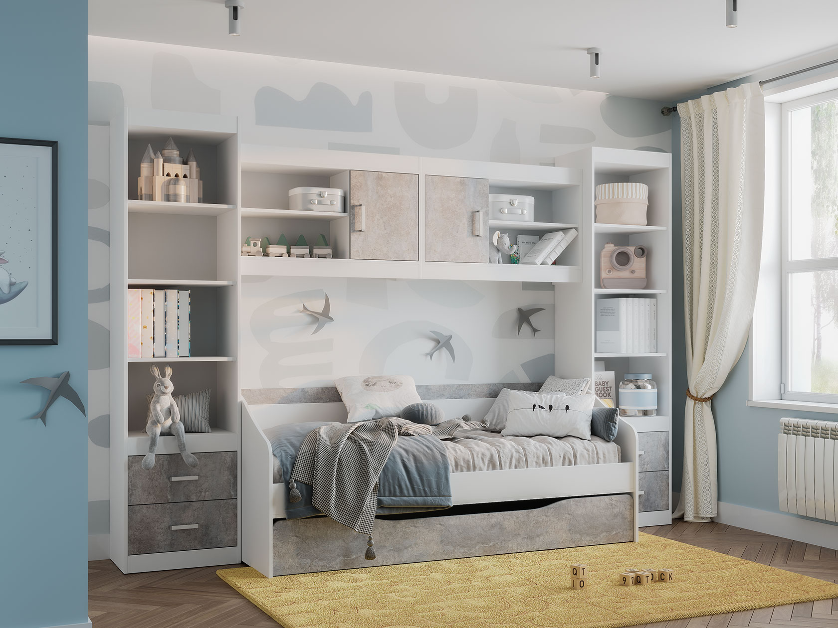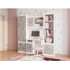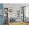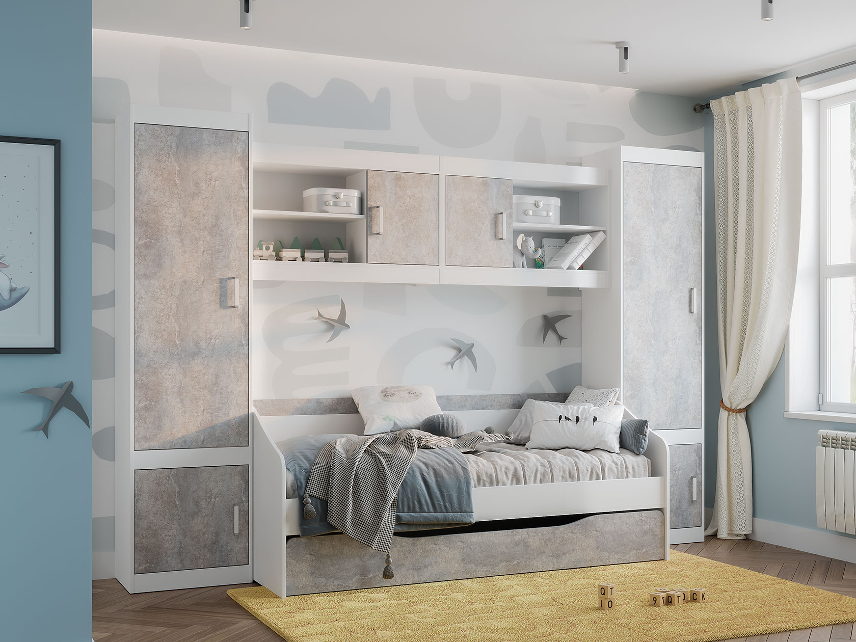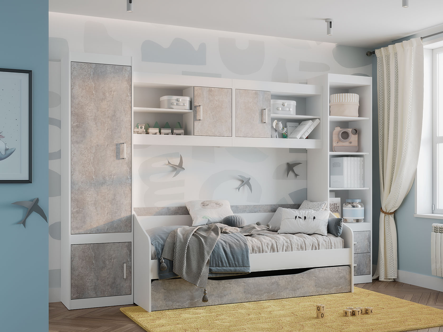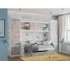 Открытая секция обеспечит быстрый доступ к необходимым для учебы принадлежностям. За глухим распашным фасадом находится вместительное отделение для коробок и объемных предметов. В оформлении фасада использована текстура бетона, что придает обстановке современный вид.