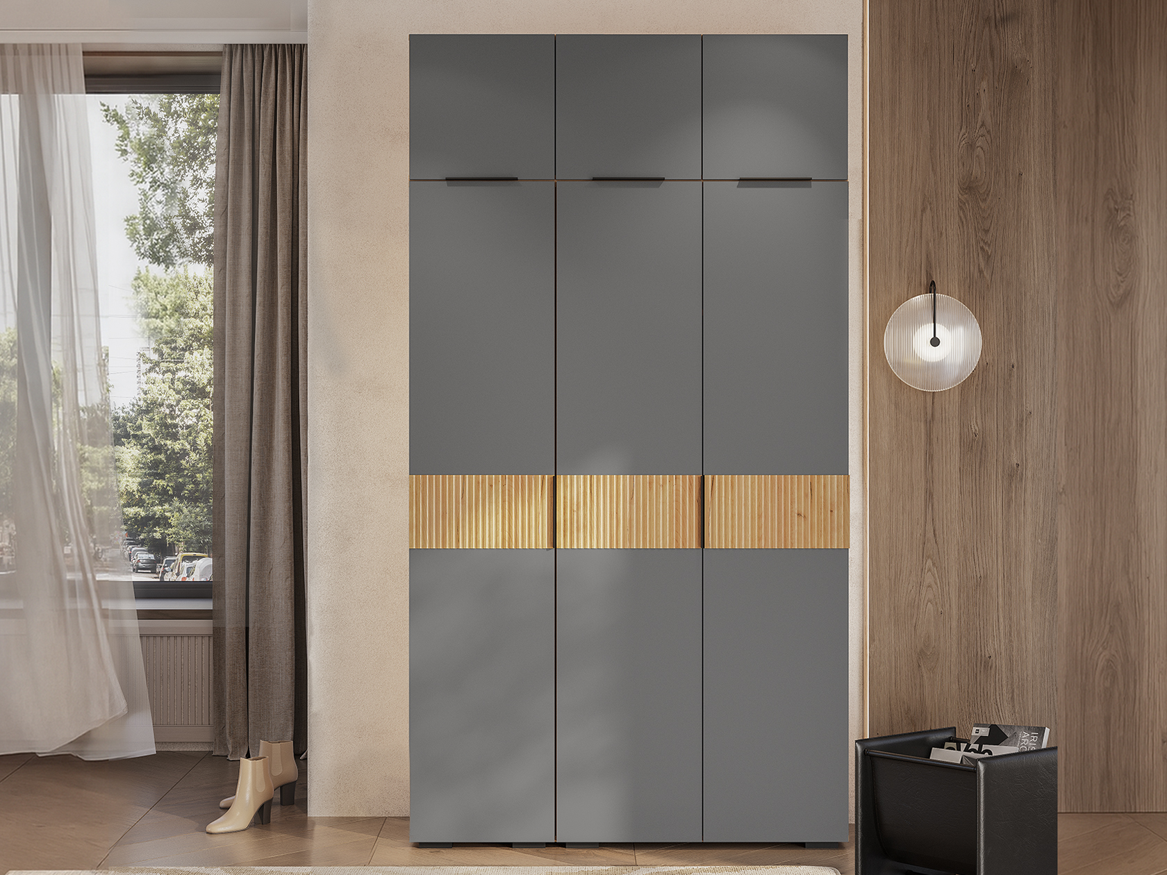 Практичная мебельная группа организует продуманное хранение всех необходимых вещей: от верхней и повседневной одежды до обуви и аксессуаров. Матовые фасады со вставками под дерево гармонично дополняют современный интерьер.