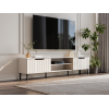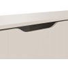 Вырезы вместо выступающей фурнитуры и вертикальный декор превращают мебель в акцентный элемент интерьера. На открытых полках удобно хранить сопутствующую технику и аксессуары, а за откидными дверцами — спрятать разные мелочи и предметы обихода. Тумбу можно подвесить на стену или установить на металлические опоры.