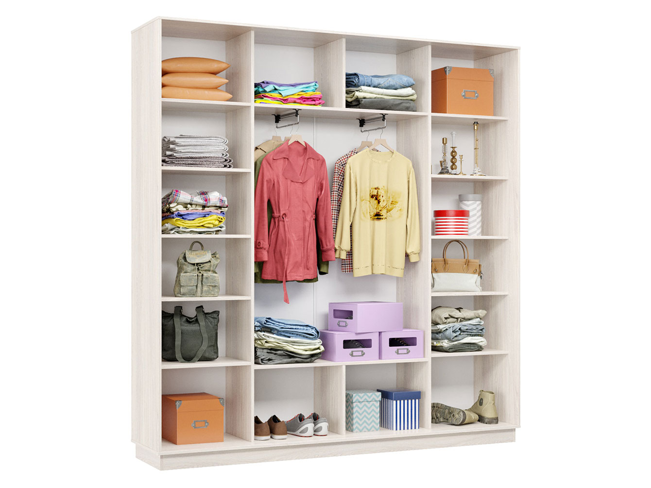 Лаконичный дизайн с гладкими фасадами и отсутствием лицевой фурнитуры легко интегрировать в разные стили меблировки. Внутри расположена большая секция со штангой для плечиков, а также ряд полок для домашнего текстиля и аксессуаров. Дверцы плавно и бесшумно передвигаются по однополосному треку, обеспечивая быстрый доступ к нужному отделению.