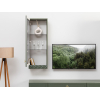 За дверцей из тонированного стекла можно расставить книги и декор, защитив их от пыли и солнечного света. Подвесная конструкция смотрится легко и невесомо, поэтому подходит для небольшой комнаты.
