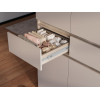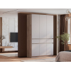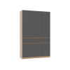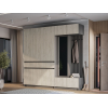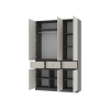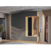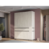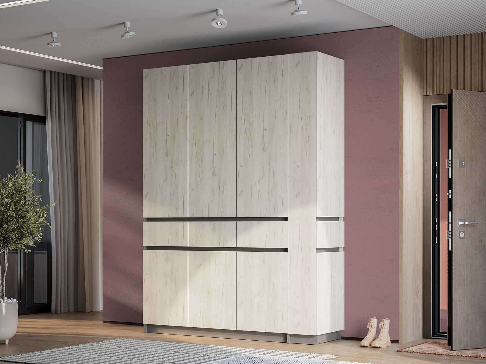 Внутри расположены просторная секция со штангой для плечиков и полки, которые обеспечат место для повседневных и сезонных вещей. Выдвижные ящики подойдут для полезных мелочей, а закрытые ниши внизу — для нескольких пар обуви. Фасады не имеют ручек, что поддерживает тренд на минимализм в оформлении мебели и облегчает уборку.