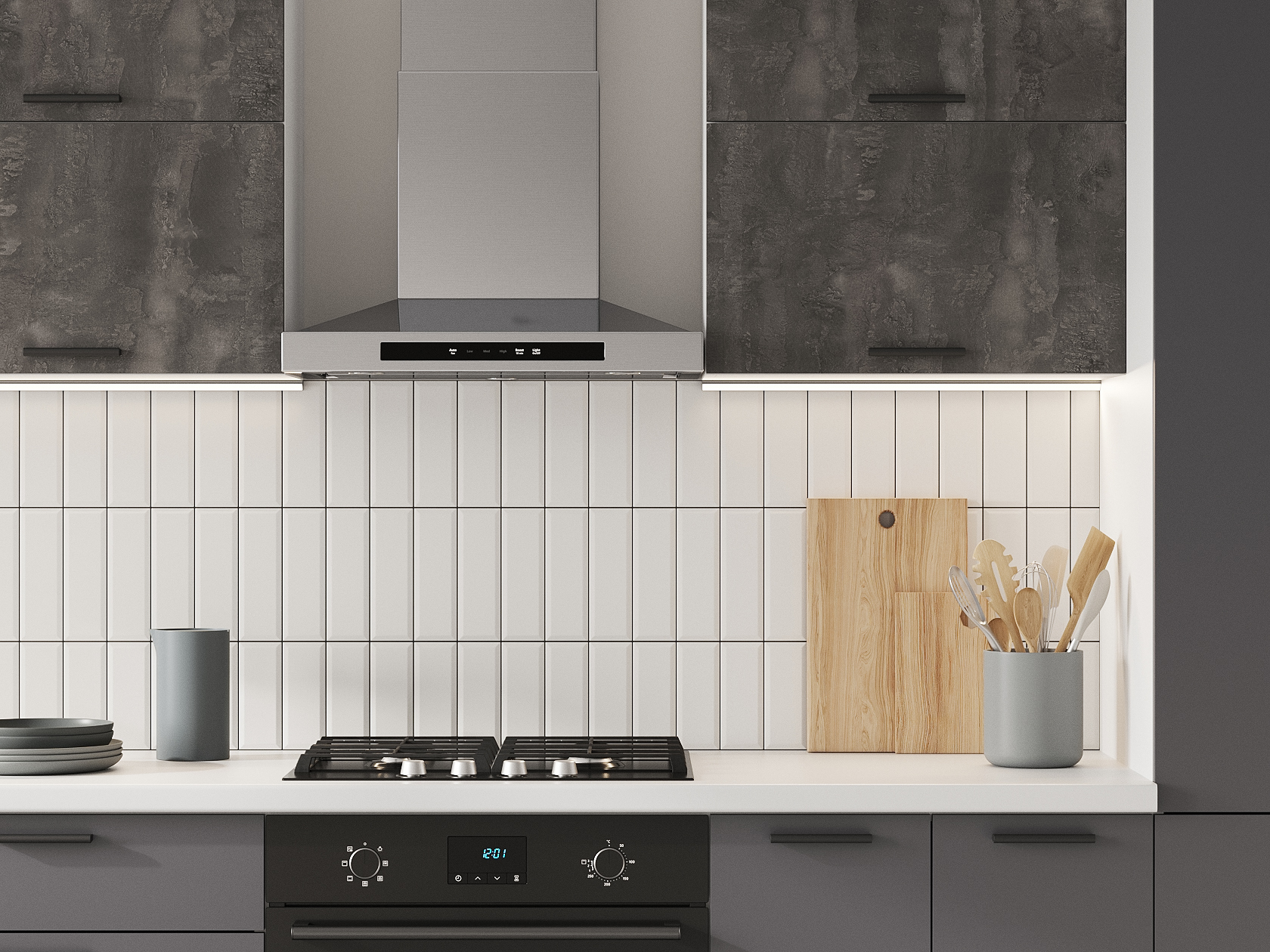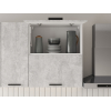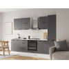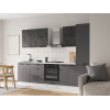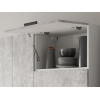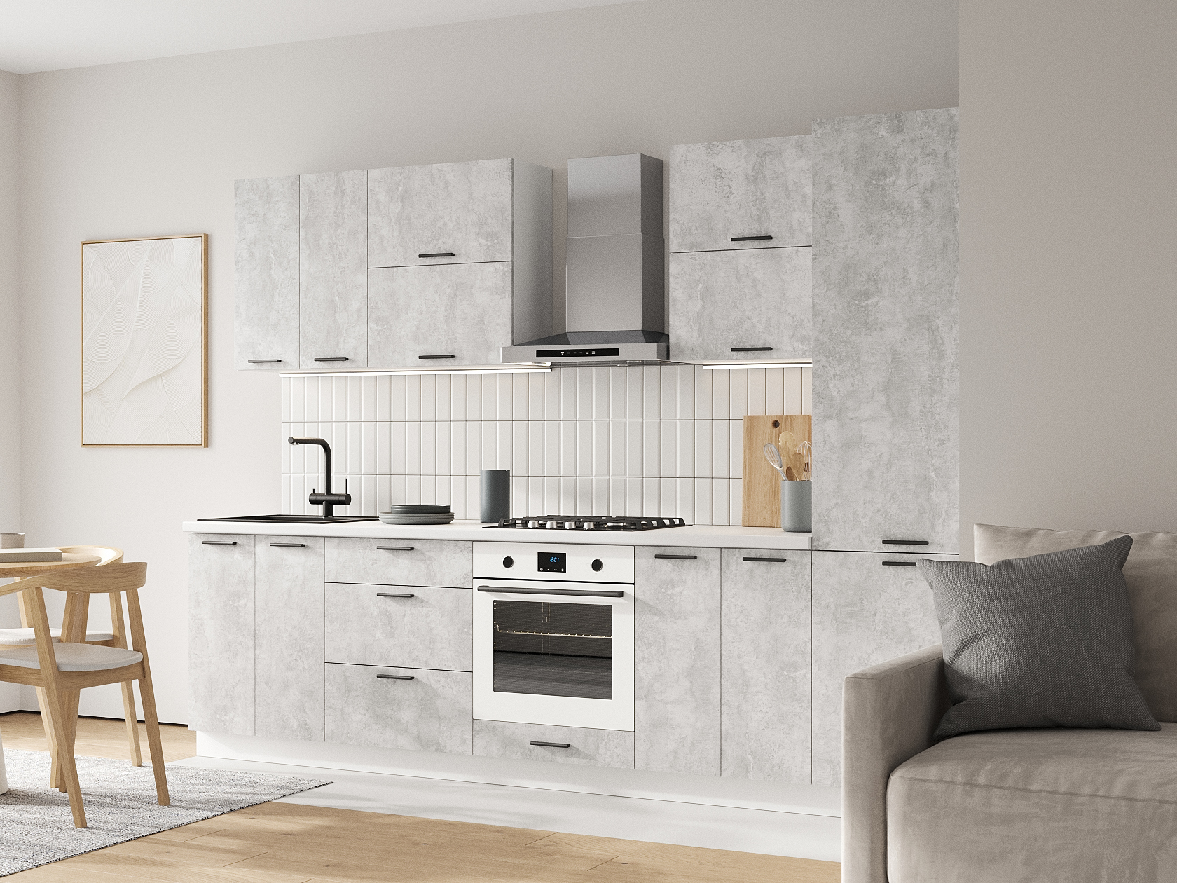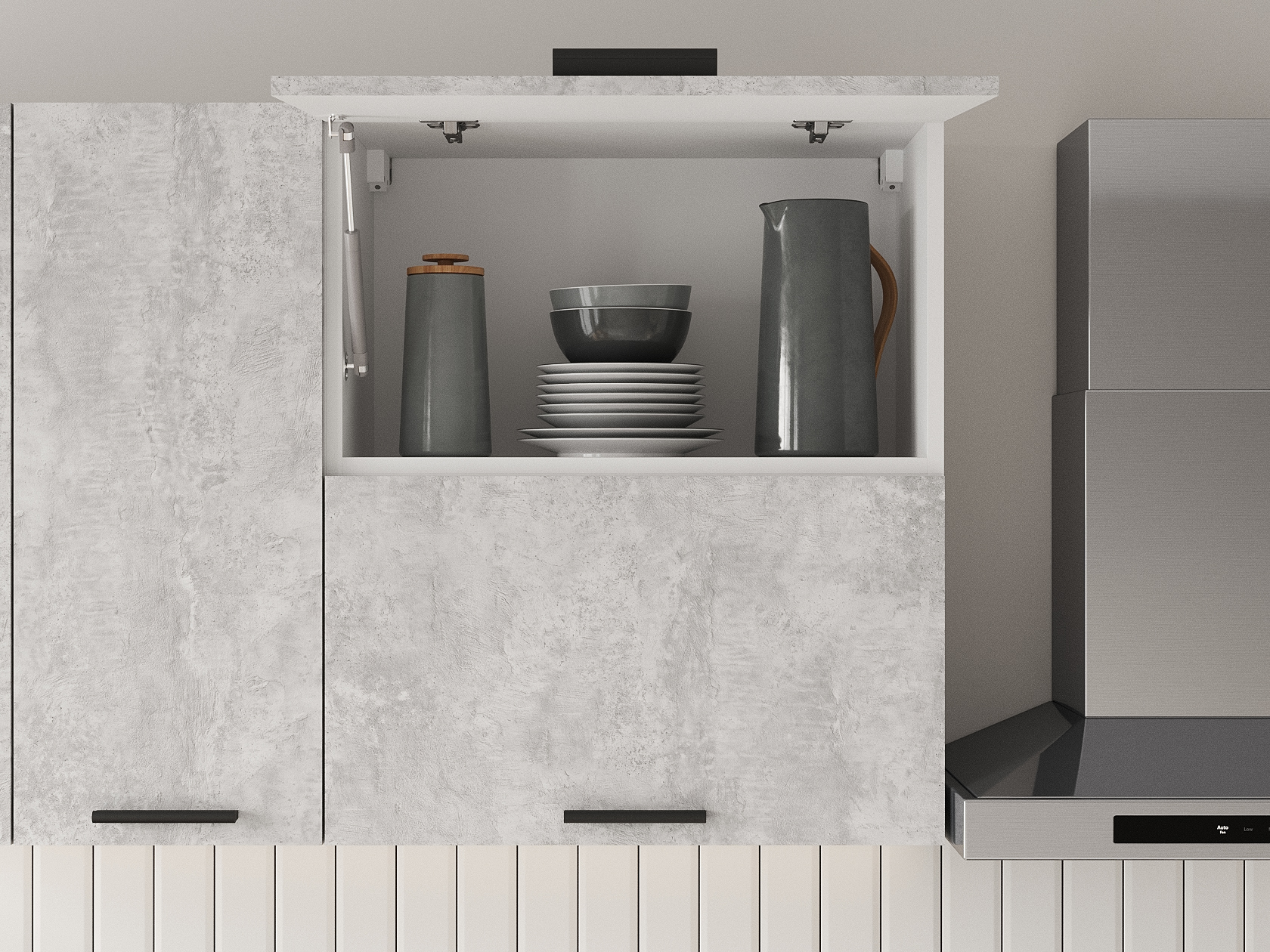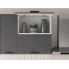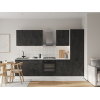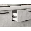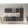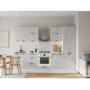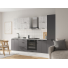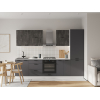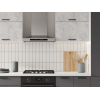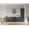 Расположение элементов позволяет удобно разместить посуду, продукты и различную утварь. Для комфортной эксплуатации выдвижные ящики укомплектованы качественными направляющими, а откидные дверцы антресольных шкафов легко фиксируются с помощью газлифта.