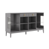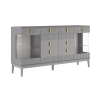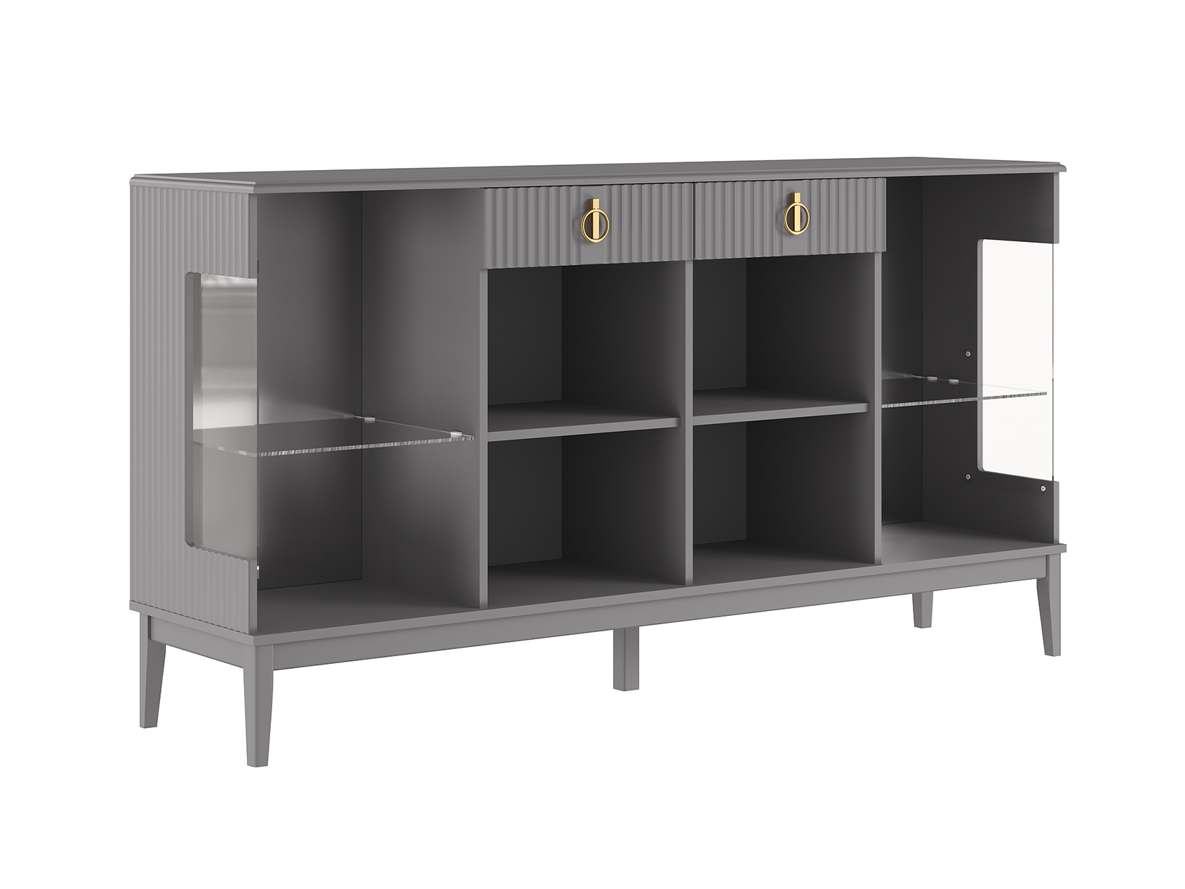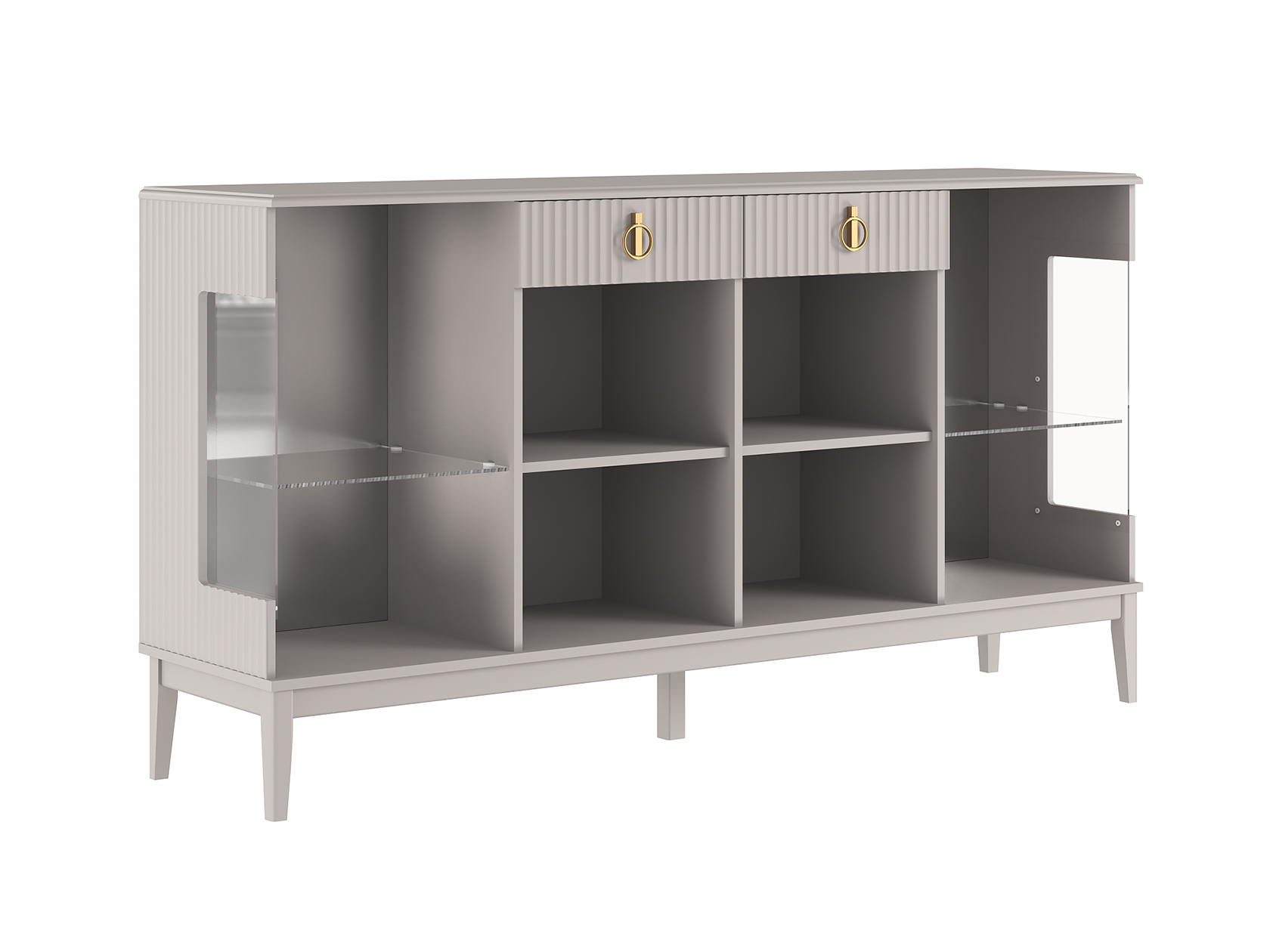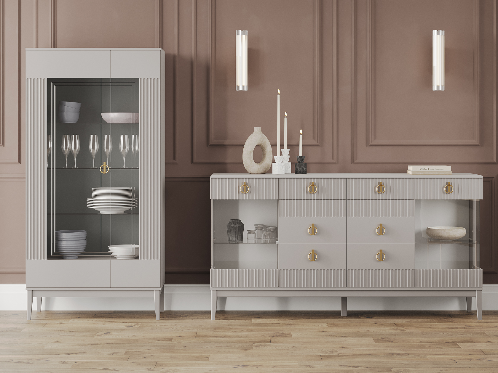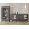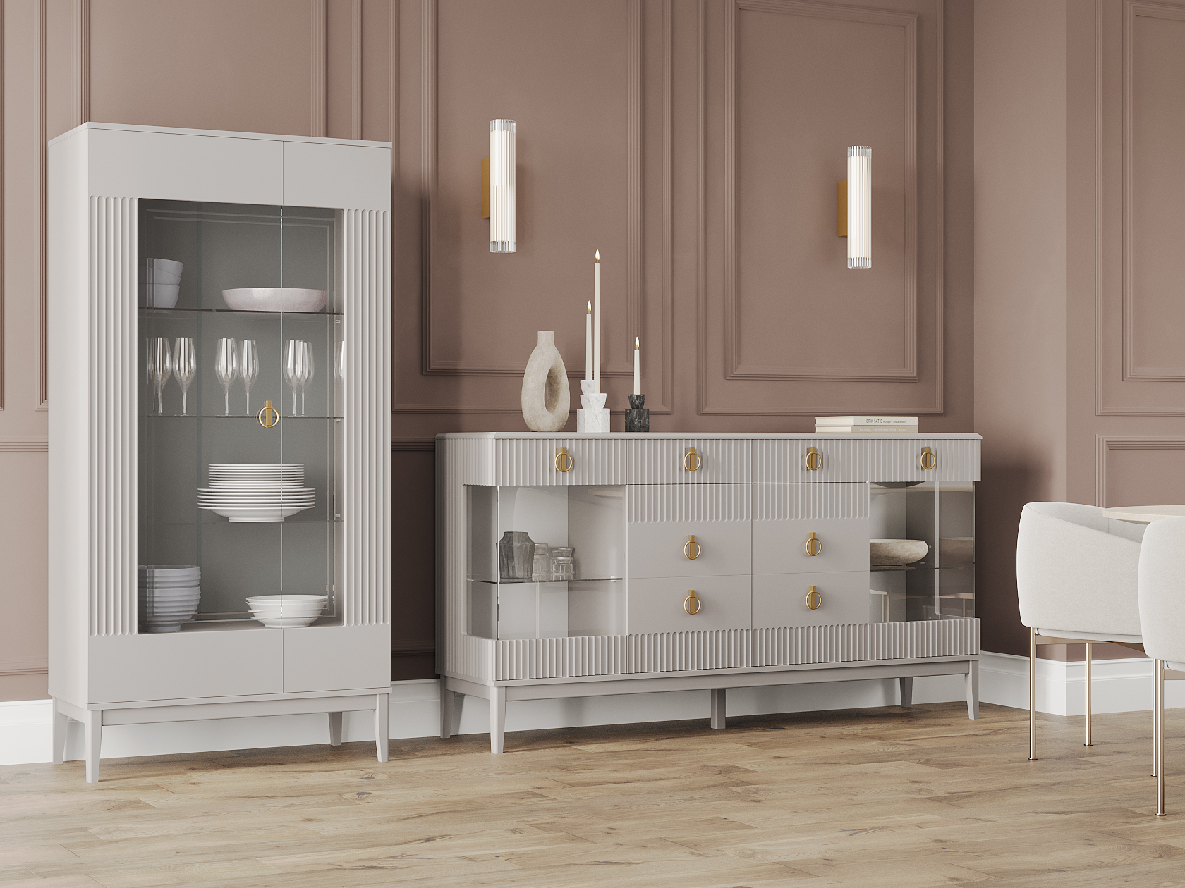 За прозрачными дверцами шкафов-витрин можно разместить посуду, которую хочется продемонстрировать гостям. Матовые фасады с вертикальной фрезеровкой дополнены изящной фурнитурой золотистого цвета, которая придает мебели утонченность. Выдвижные ящики подходят для различных мелочей, а на поверхности комода удобно хранить предметы декора, рамки с фотографиями и уютный светильник.