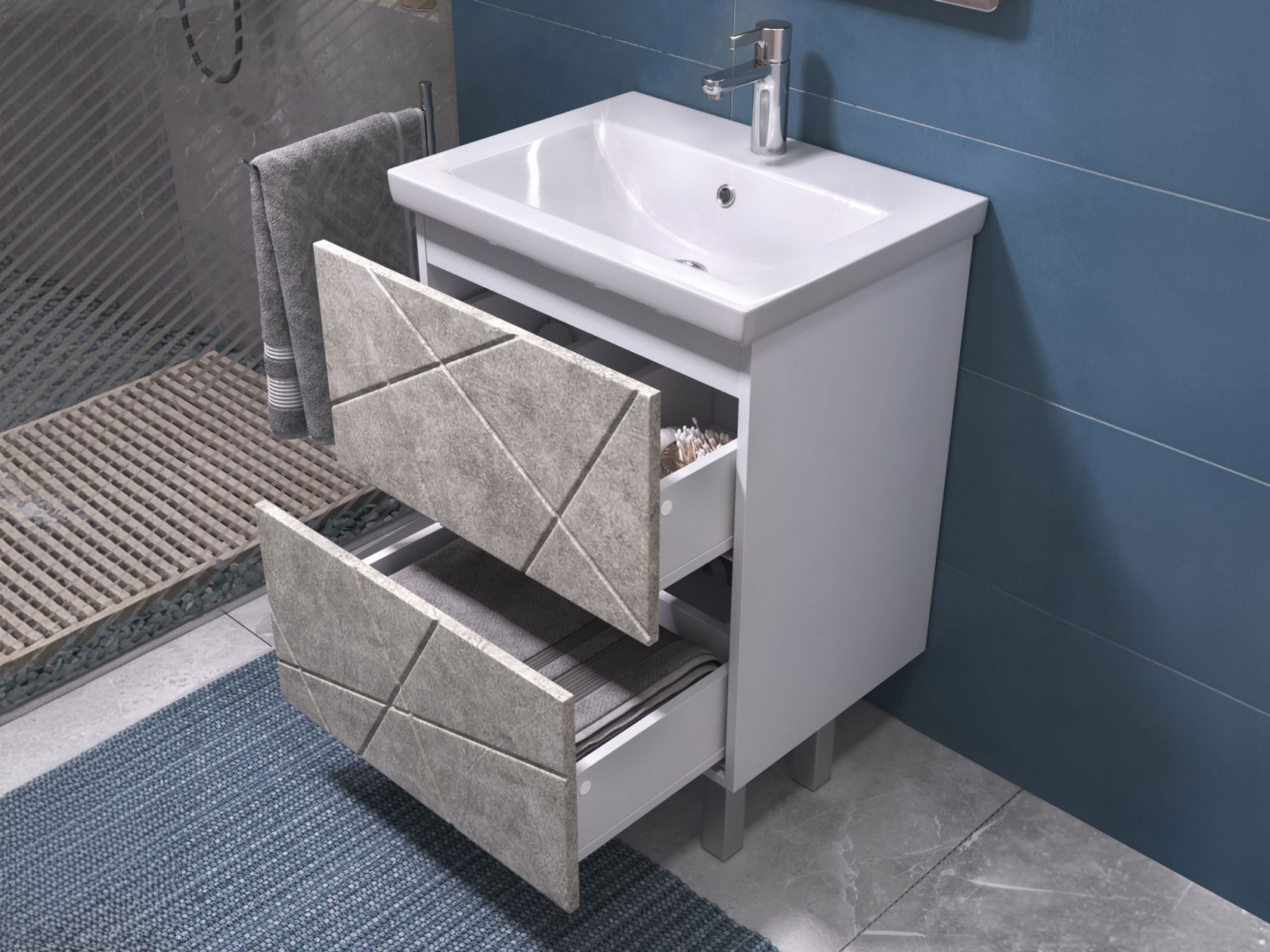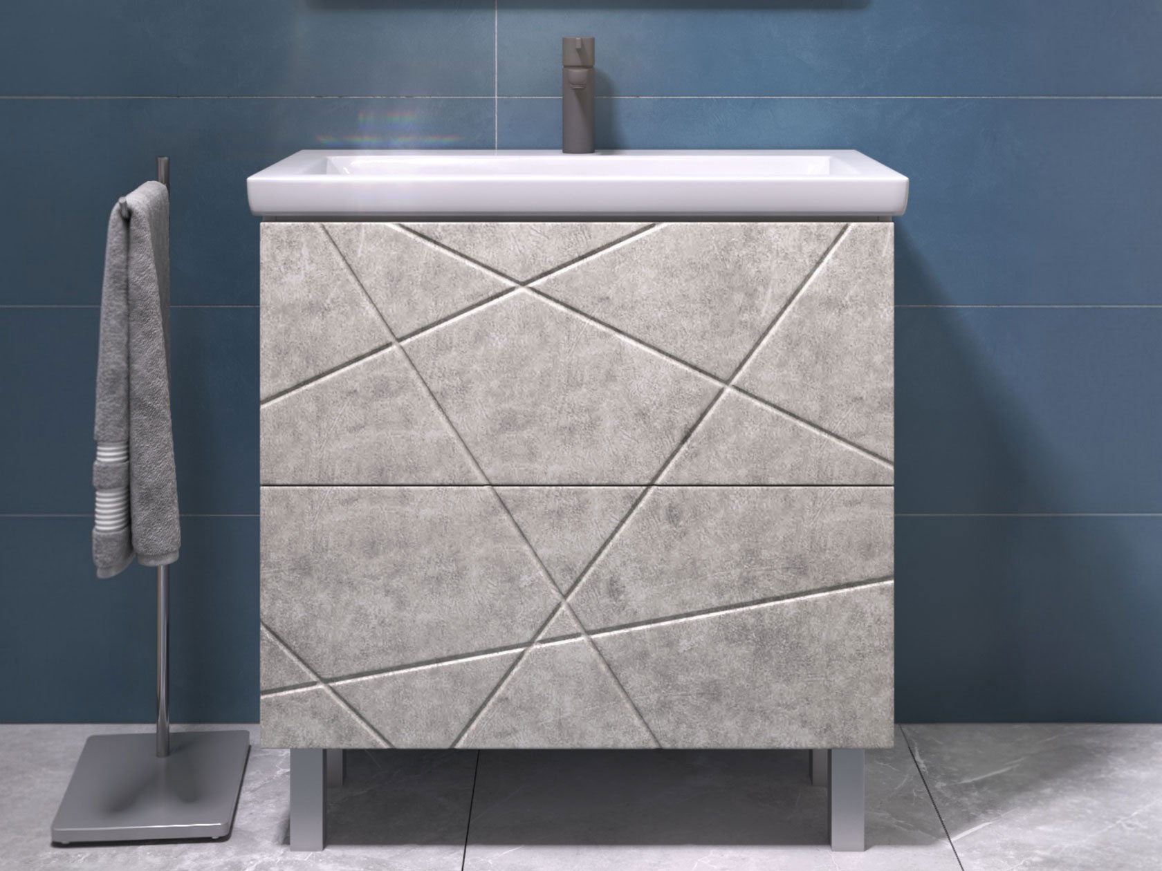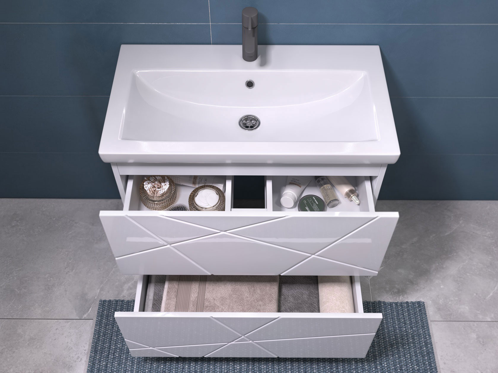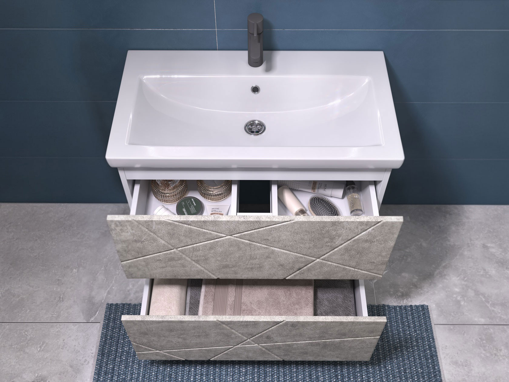 Трендовая фрезеровка добавляет интерьеру динамики. Модель оснащена двумя вместительными выдвижными ящиками с механизмом плавного закрывания. Внутри можно хранить предметы первой необходимости, косметику и бытовую химию. Регулируемые опоры придают конструкции устойчивость и облегчают уборку.