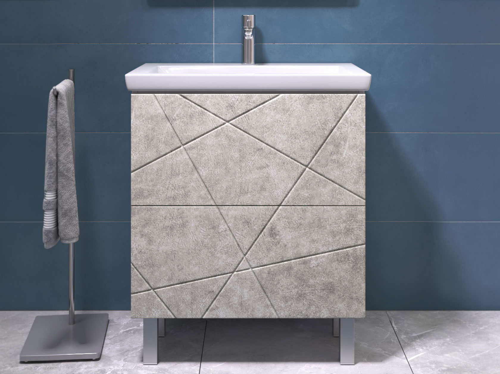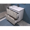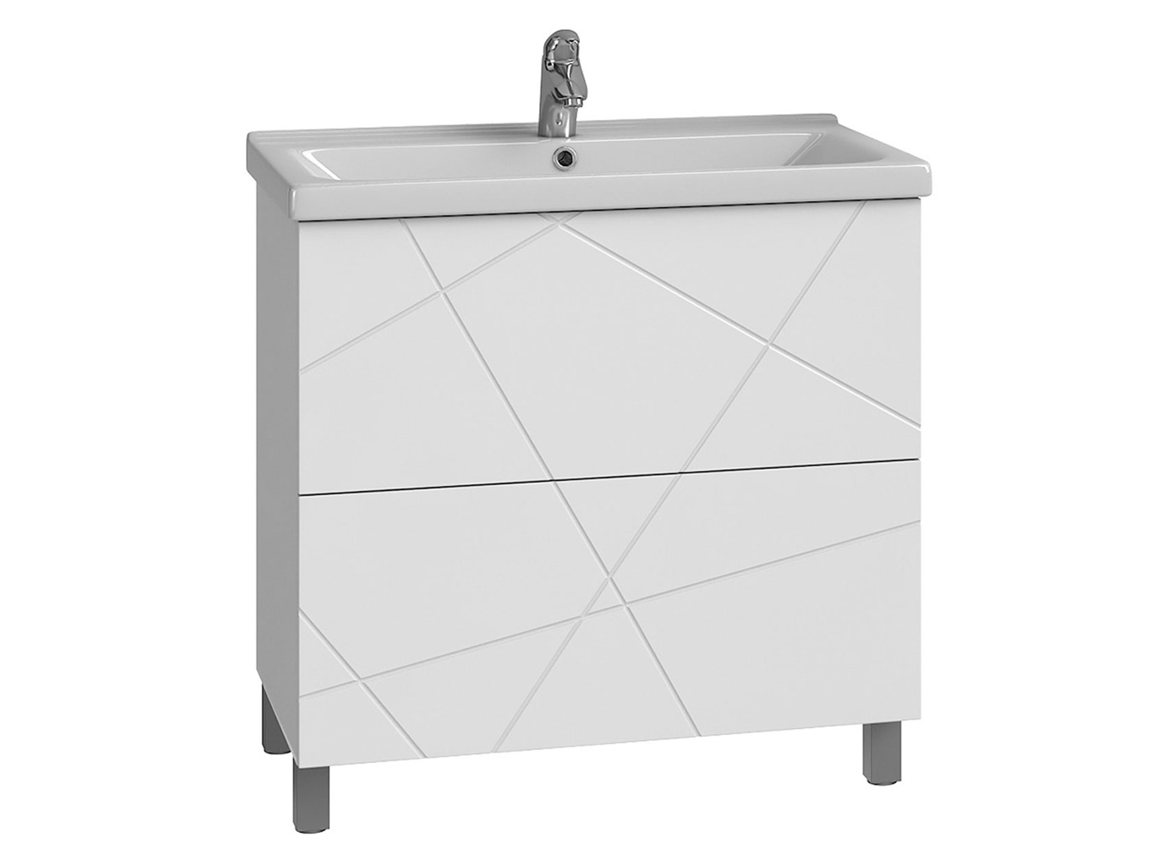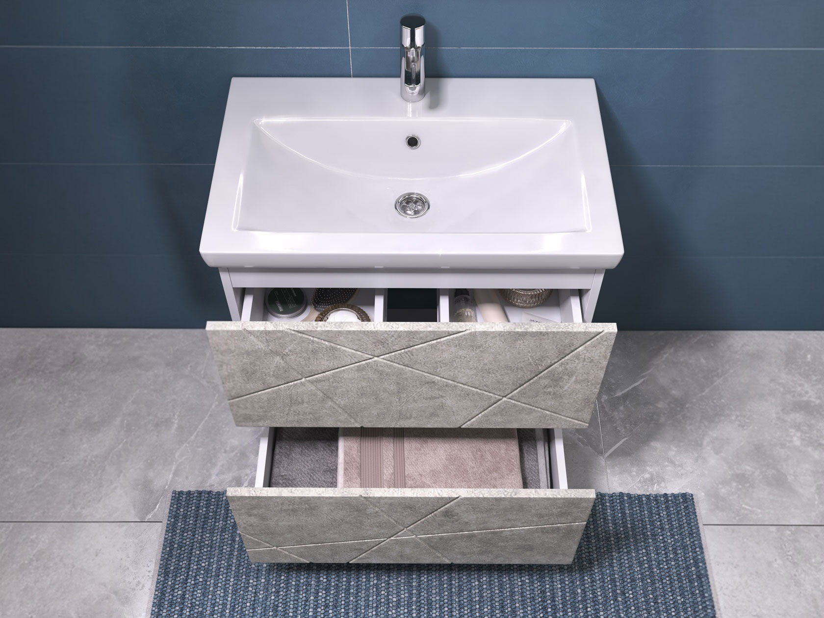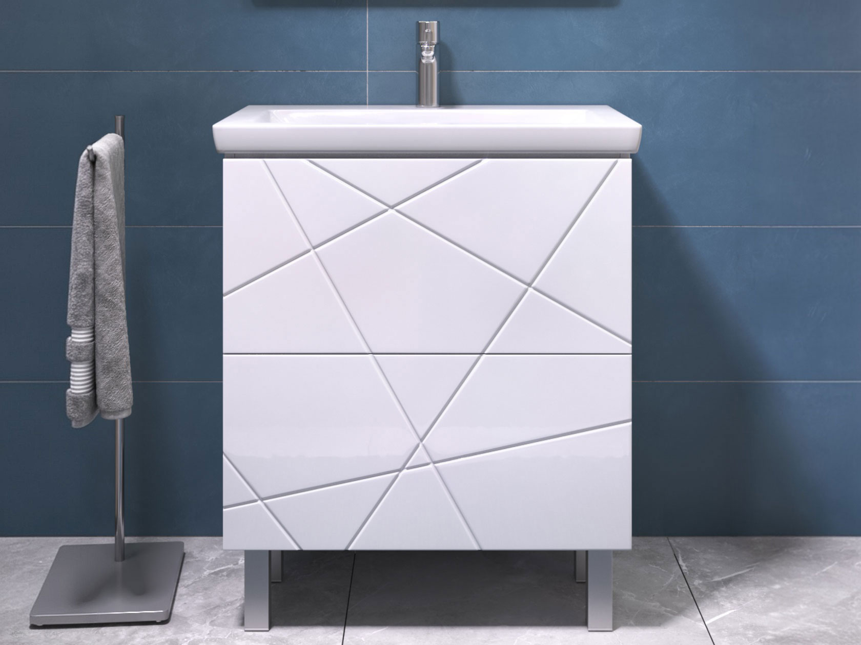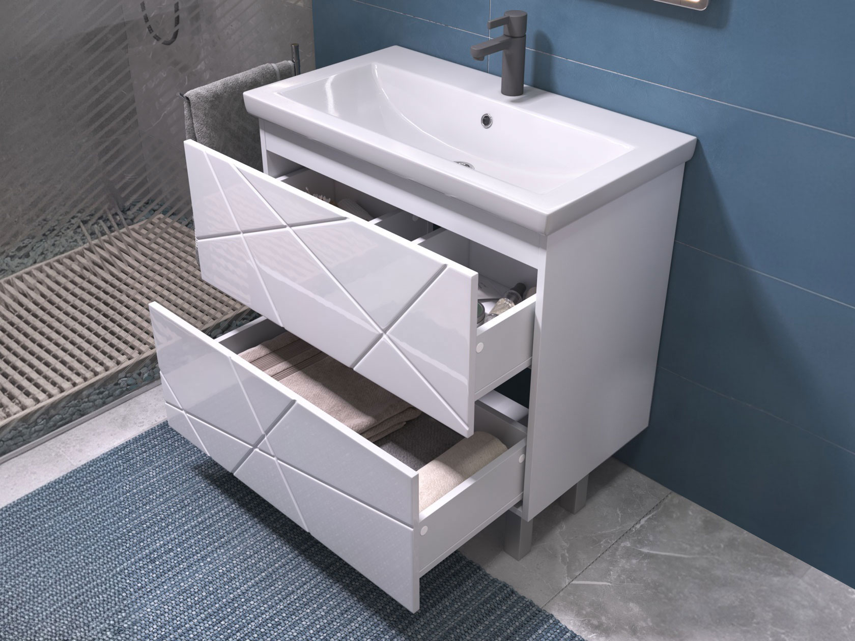 Трендовая фрезеровка добавляет интерьеру динамики. Модель оснащена двумя вместительными выдвижными ящиками с механизмом плавного закрывания. Внутри можно хранить предметы первой необходимости, косметику и бытовую химию. Регулируемые опоры придают конструкции устойчивость и облегчают уборку.