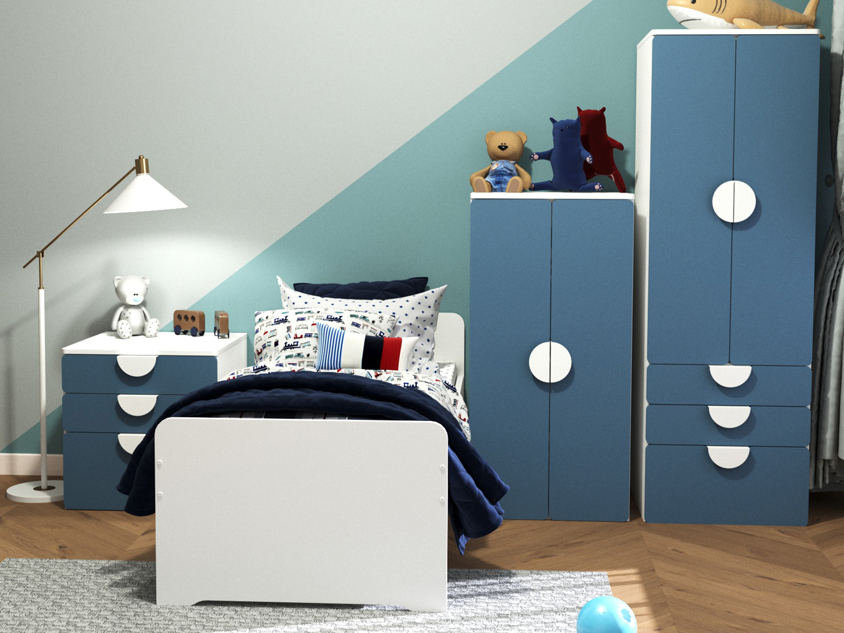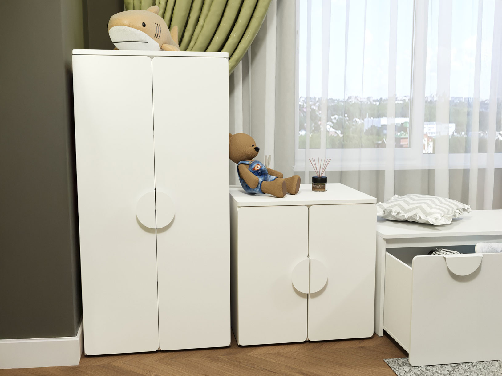 Практичное внутреннее наполнение позволяет аккуратно разместить одежду на вешалках или разложить на полках повседневные предметы гардероба. Гладкие фасады украшены объемными круглыми ручками, а отсутствие острых углов обеспечивает безопасную эксплуатацию мебели.