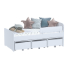 Зона отдыха представлена кроватью с бортиком, который обеспечивает безопасность. Под спальным местом расположены выдвижные ящики для постельных принадлежностей и игрушек. Распашные шкафы помогут в хранении одежды, книг и других вещей. Удобные круглые ручки придают интерьеру стильный и современный вид.