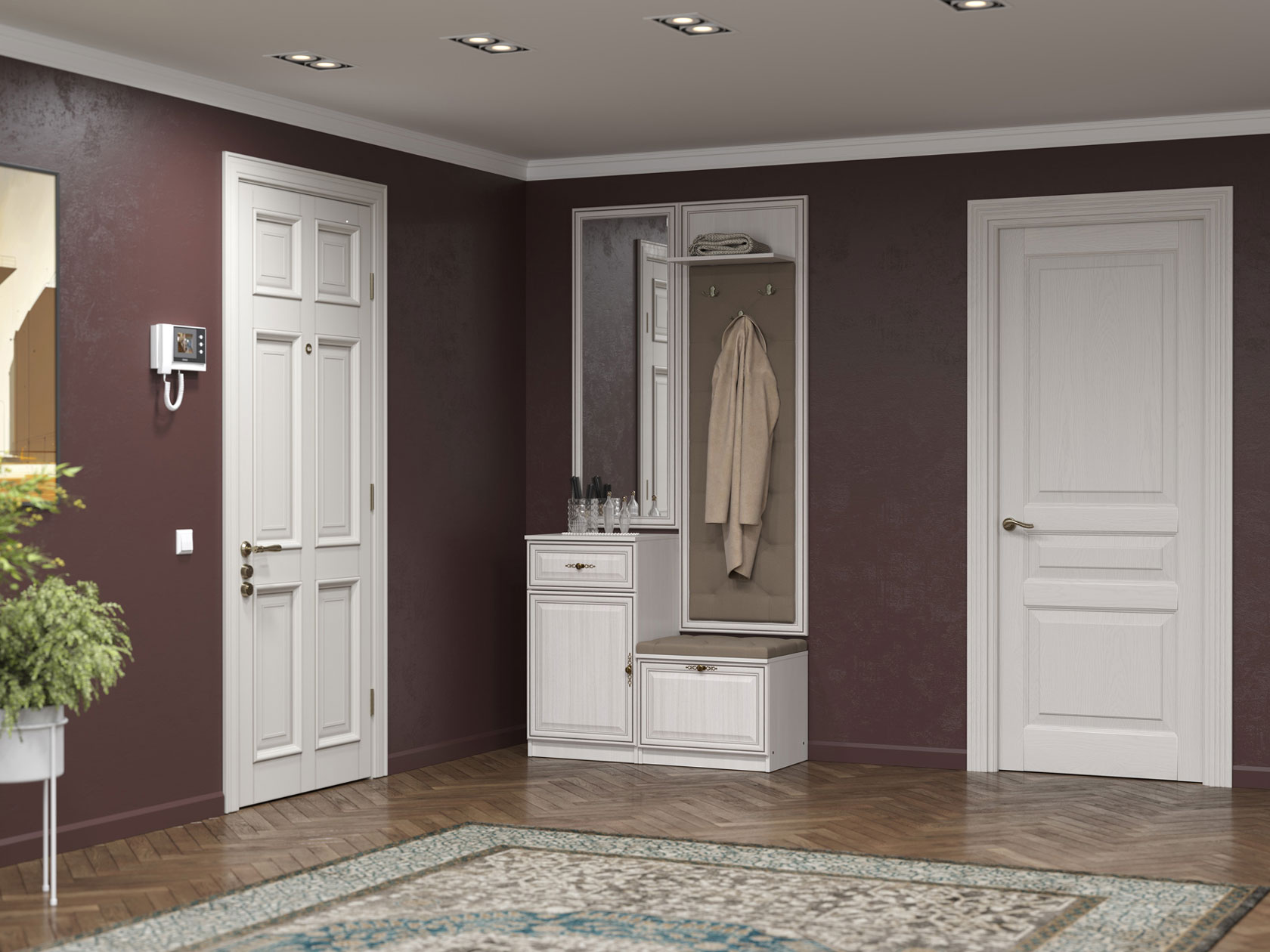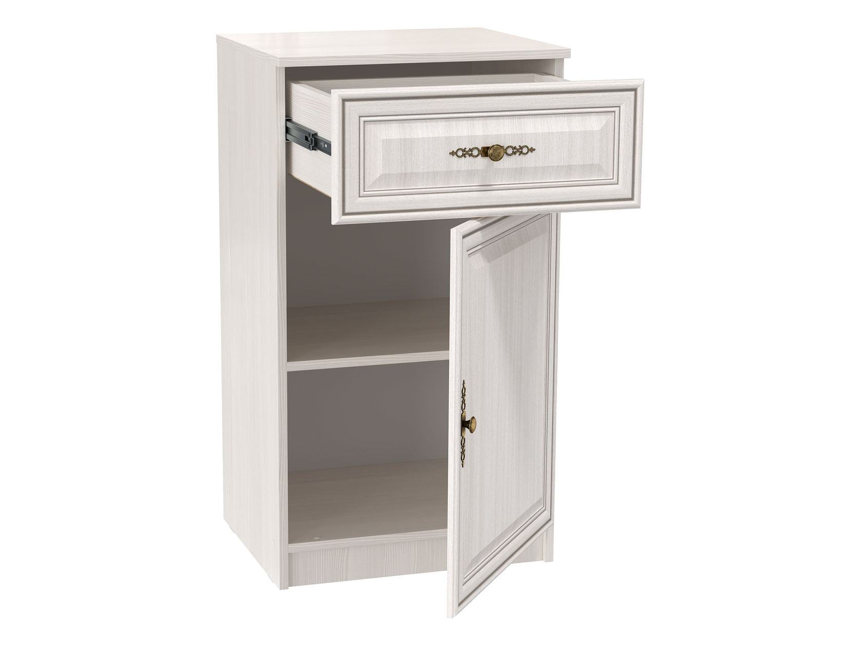 За распашной дверцей находится отделение с полкой, а выдвижной ящик идеально подходит для ключей, очков и прочих предметов, которые важно не забыть перед выходом из дома. Рамочные фасады дополнены элегантными ручками, что придает мебели аккуратный и привлекательный вид.