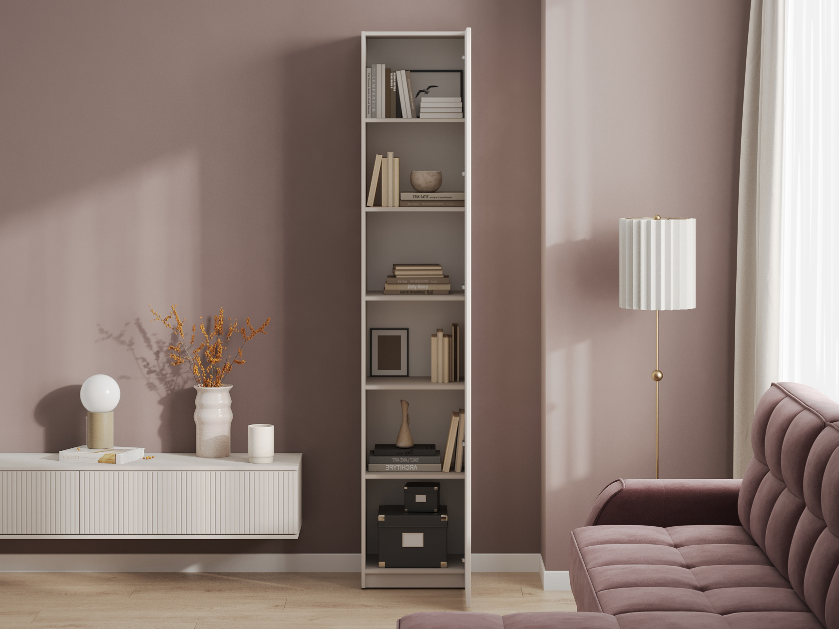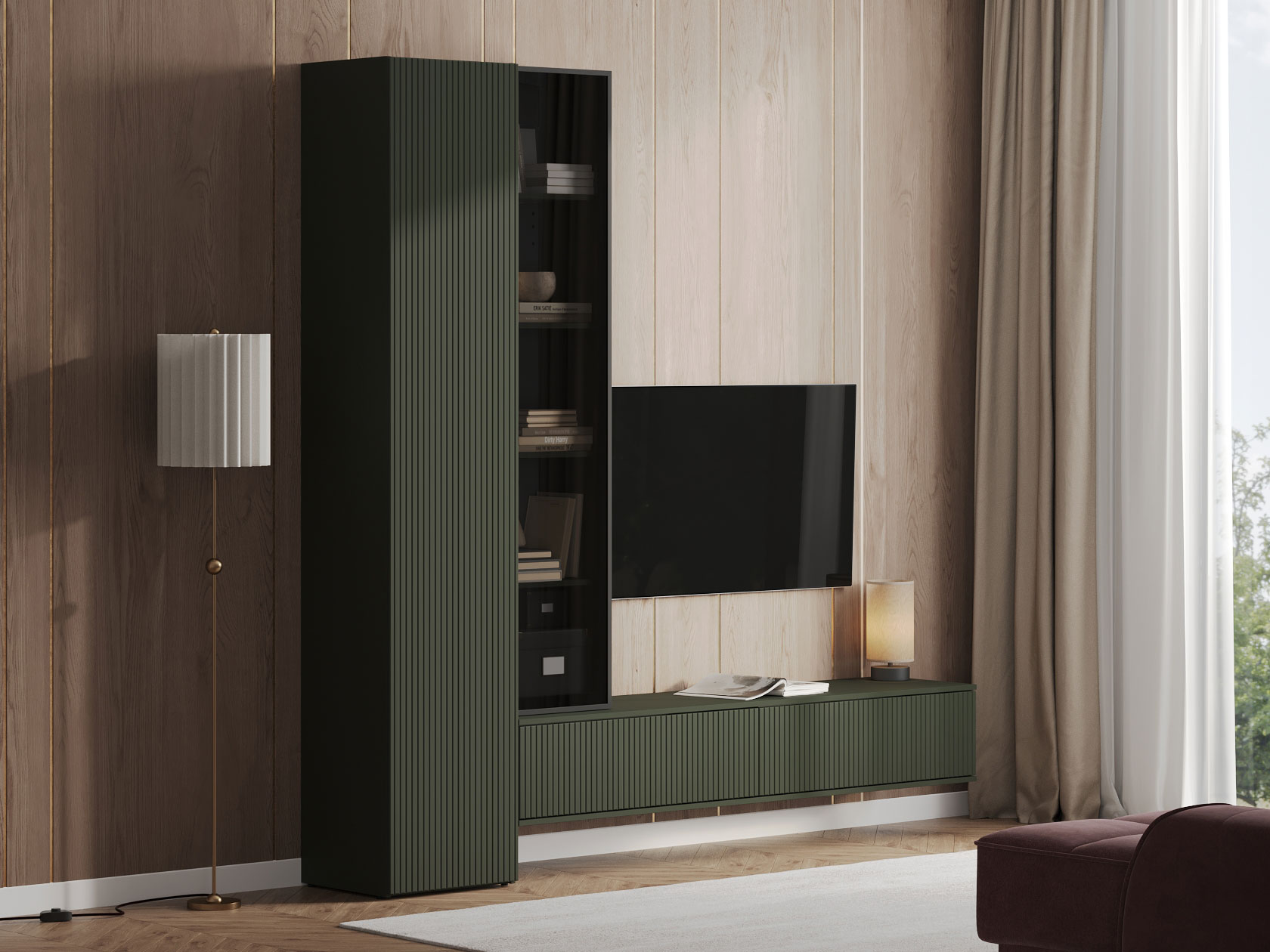 Вертикальная фрезеровка на фасаде подчеркивает элегантный дизайн модели и вносит уютный акцент в оформление интерьера. Отсутствие лицевой фурнитуры упрощает уход за мебелью.